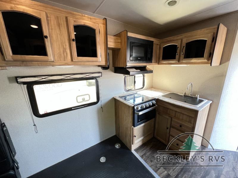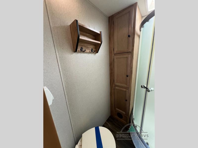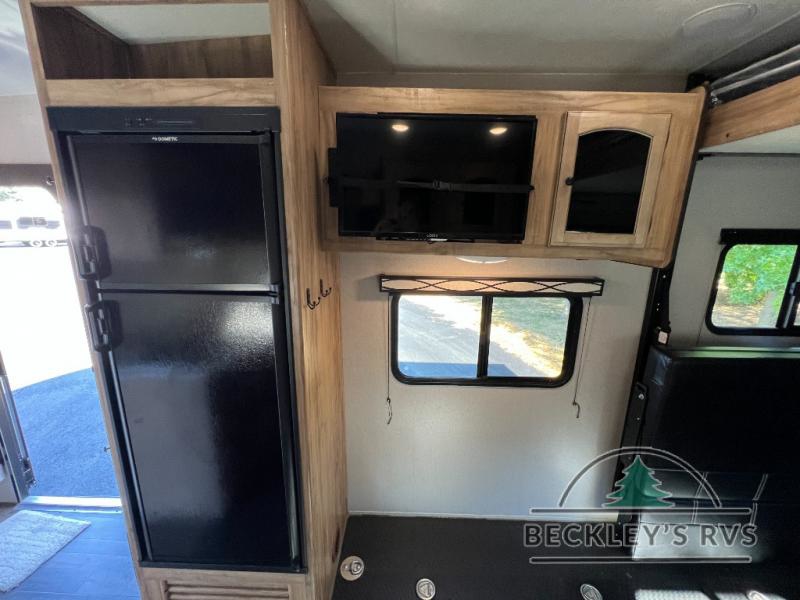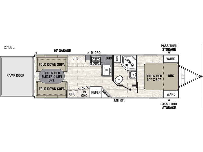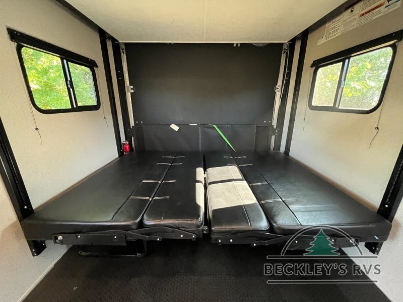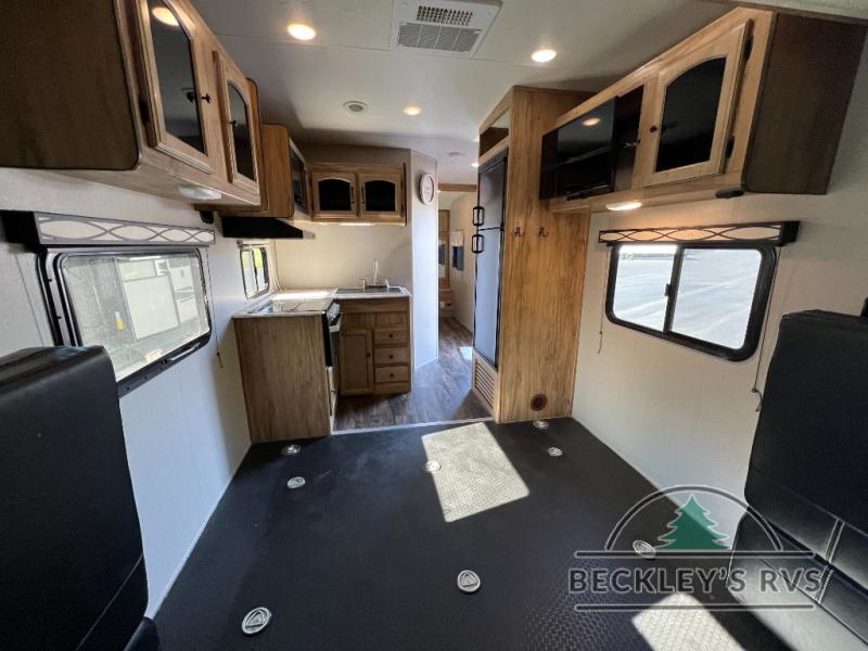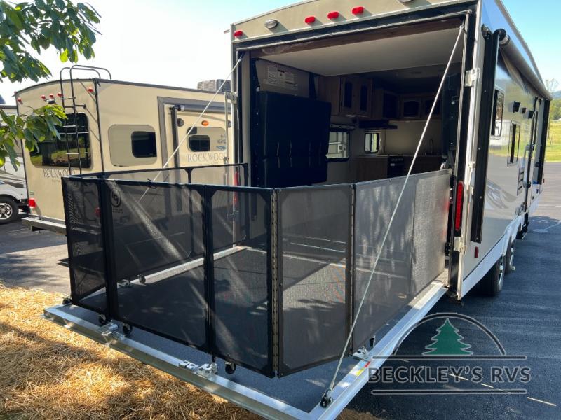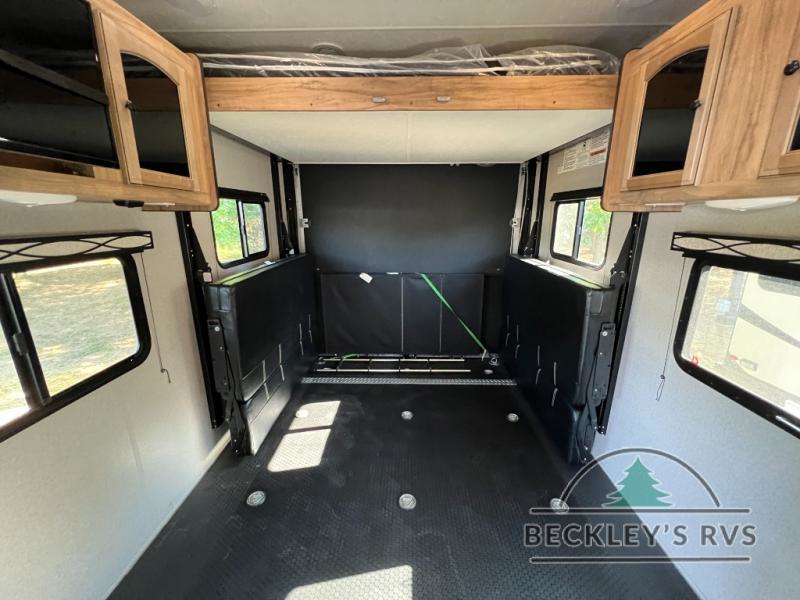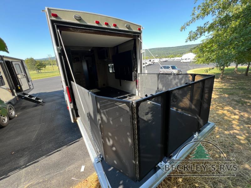 Imagine your toys are secure in the back of the garage in this toy hauler and you are comfortably driving to your favorite off-road park. Now unload your toys, fold down the dual opposing sofas, set up your indoor/outdoor table, and began to relax and have fun. Everyone can take turns on the four wheeler or motorcycles while you make meals in the kitchen or watch the LED TV. You even have a full bathroom to get washed up before bedtime. You can retire to your own 60" x 80" queen bed while the kids or guests sleep on the sofas, or the queen electric lift bed in the garage if you chose to add that option. Off-road fun just got a lot more comfortable in this model!