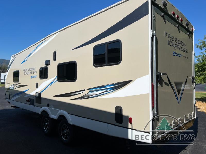 The Freedom Express Blast by Coachmen RV offers a toy hauler travel trailer with a raised roof line at 7'6" of cargo height for your four wheelers, motorcross bike, or even a Fat Boy. You will enjoy a smooth ride from the EZ-Lube axles, four season of traveling with a heated/enclosed underbelly, plus fresh air inside with the magnetic screen wall at the ramp door. Come see what else makes this the perfect model for you!