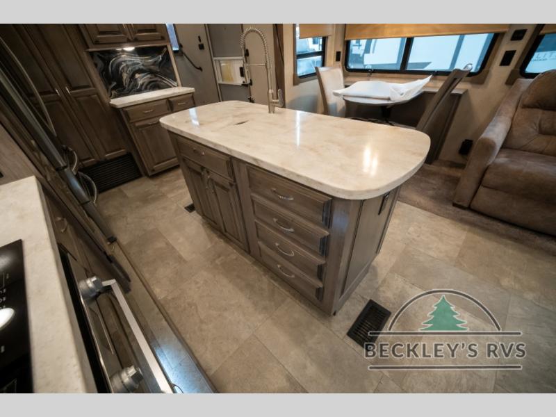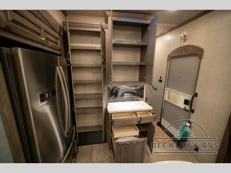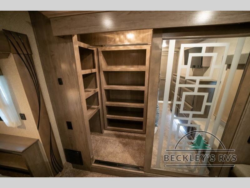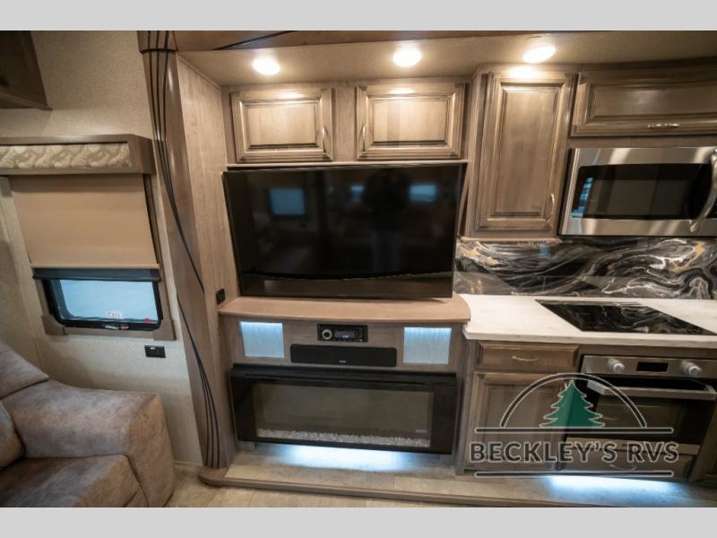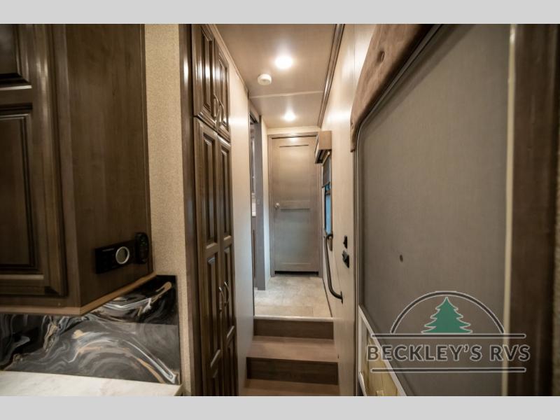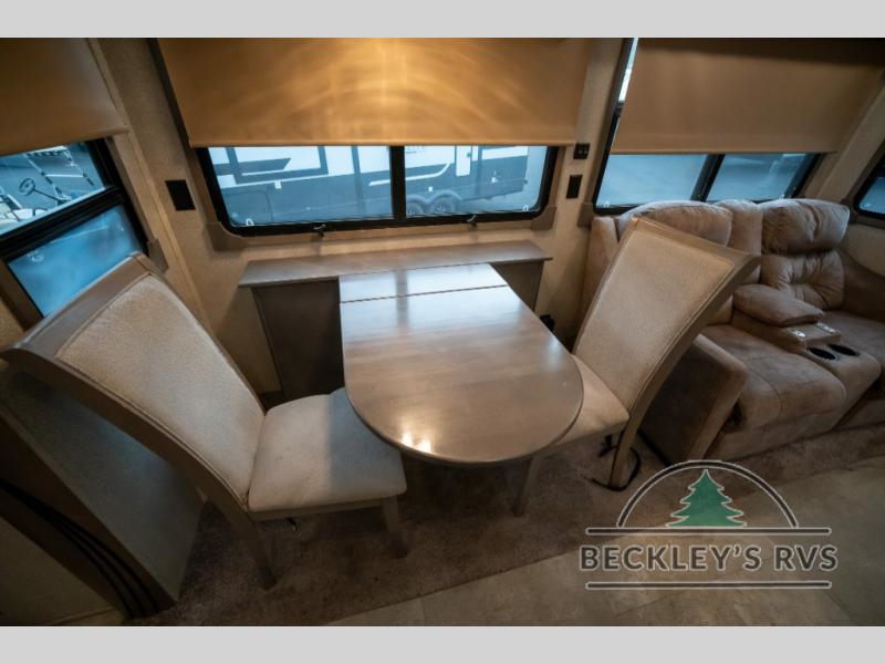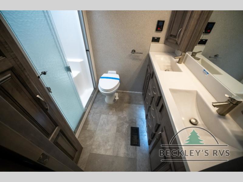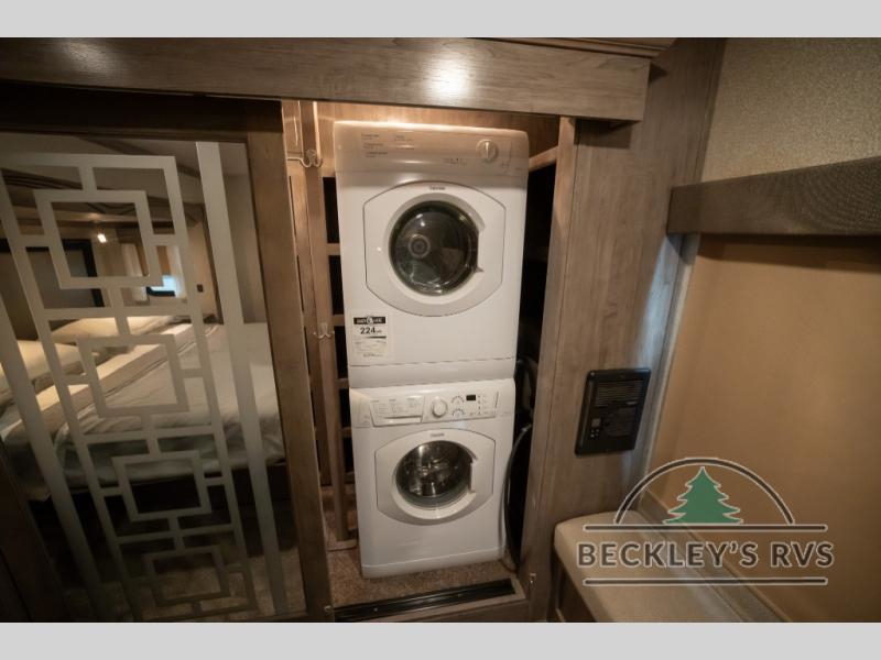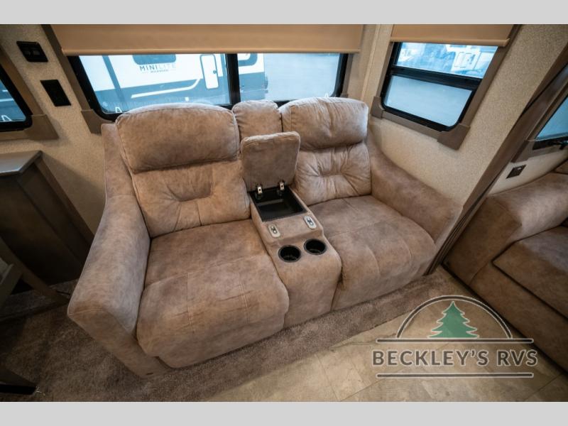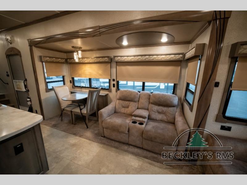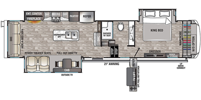 This fifth wheel is the perfect couple's coach to enjoy traveling the countryside with or setting up home base for awhile longer at your favorite location. From the three spacious slide outs for increased interior space, to the theater seats directly across from the fireplace, you will feel right at home! The kitchen island has a double sink, extra counter space, plus you can add an optional dishwasher which will speed up the clean-up process. Enjoy your meals at the free-standing dinette, and at night head up the stairs to the private front bedroom where you will find a king bed, a full-length wardrobe for your clothes, plus there is a spot that has been prepped for a washer and dryer so that you can easily keep up with the laundry while you are away from home!