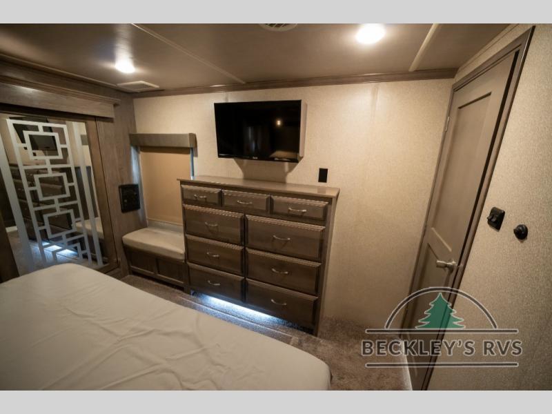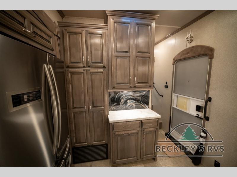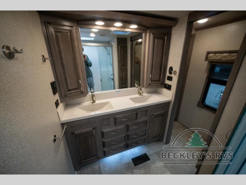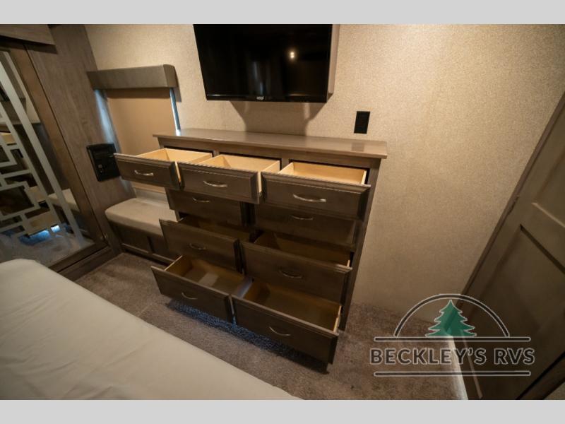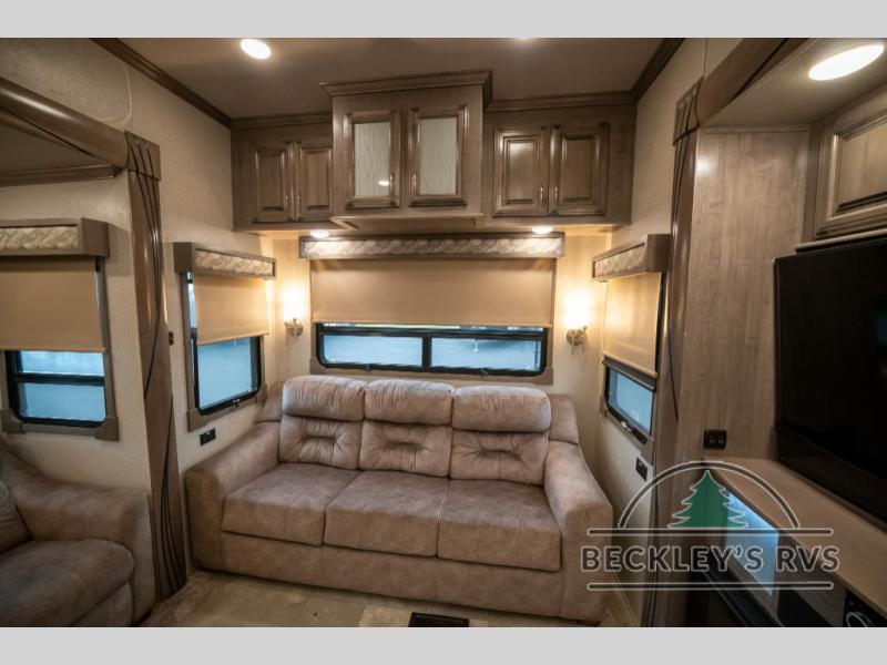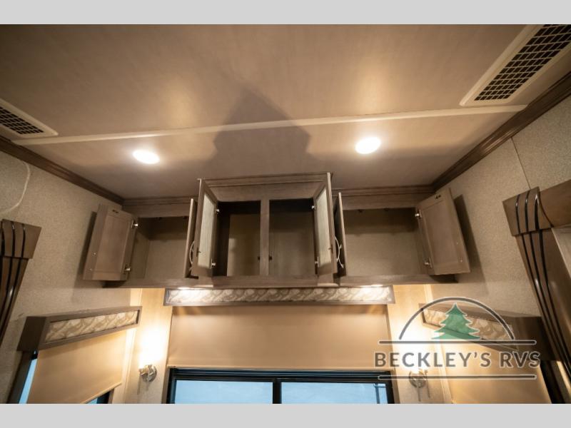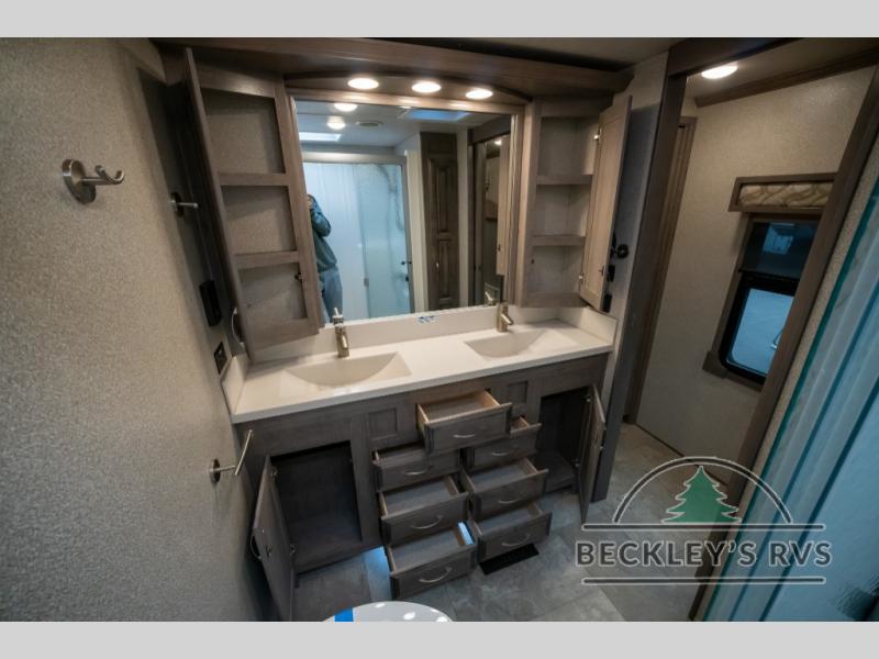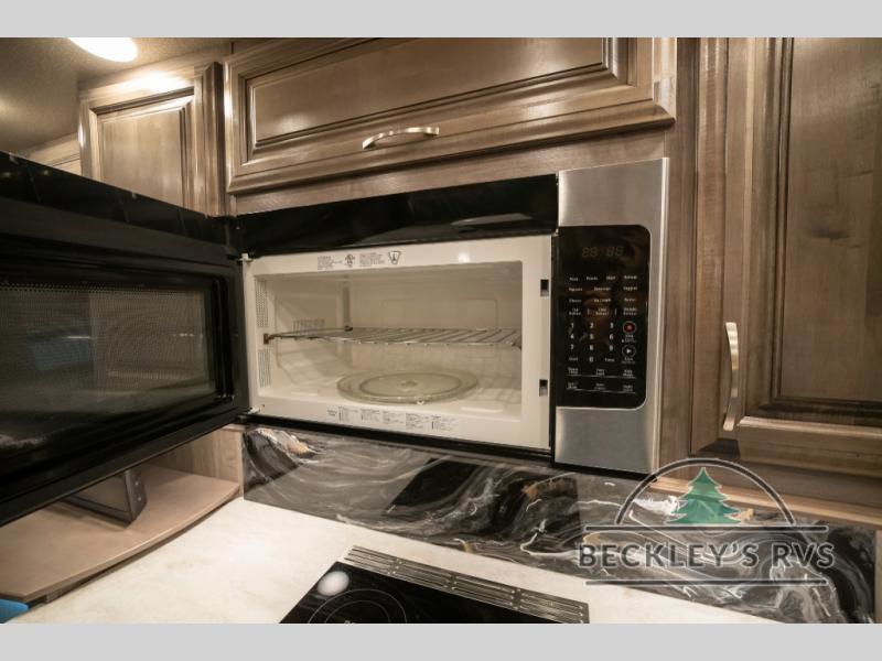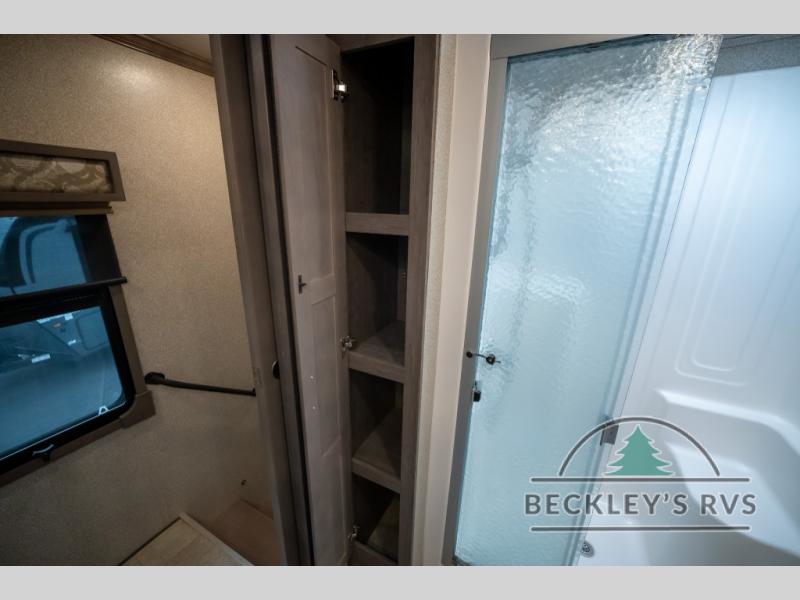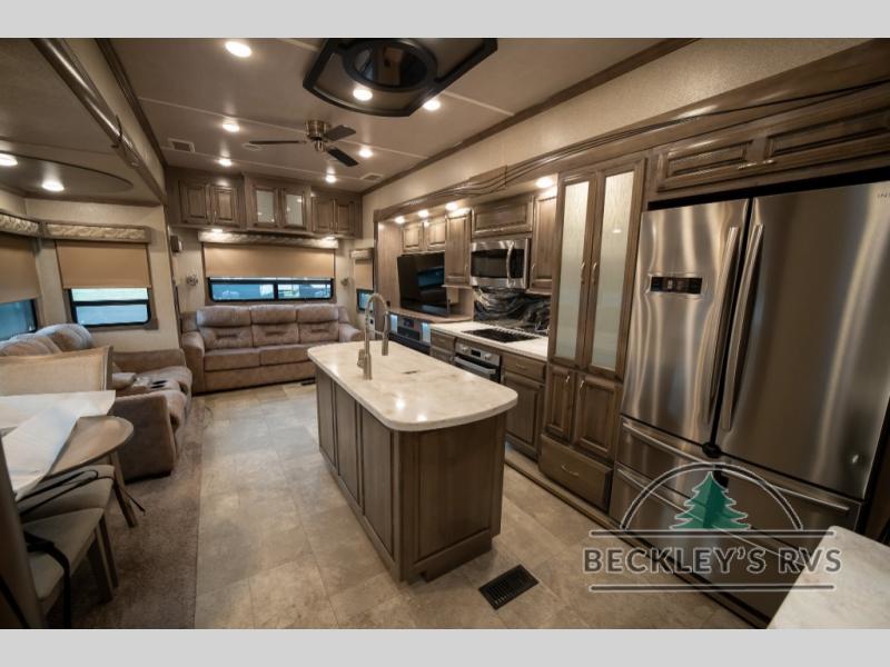 This fifth wheel is the perfect couple's coach to enjoy traveling the countryside with or setting up home base for awhile longer at your favorite location. From the three spacious slide outs for increased interior space, to the theater seats directly across from the fireplace, you will feel right at home! The kitchen island has a double sink, extra counter space, plus you can add an optional dishwasher which will speed up the clean-up process. Enjoy your meals at the free-standing dinette, and at night head up the stairs to the private front bedroom where you will find a king bed, a full-length wardrobe for your clothes, plus there is a spot that has been prepped for a washer and dryer so that you can easily keep up with the laundry while you are away from home!