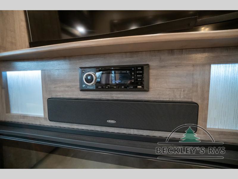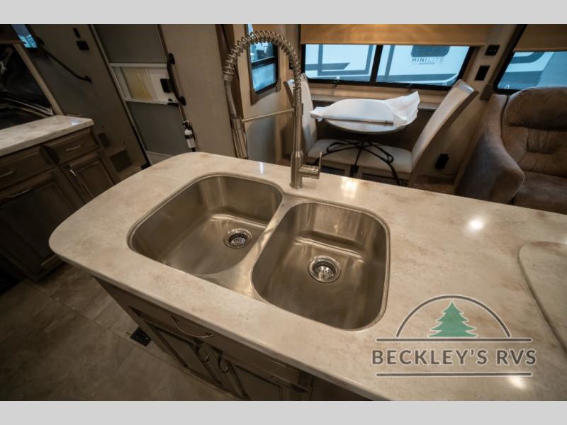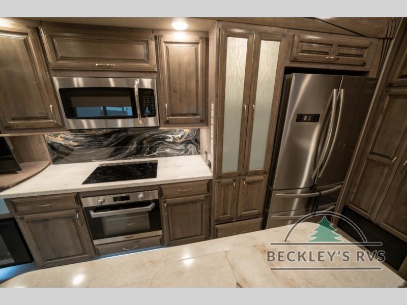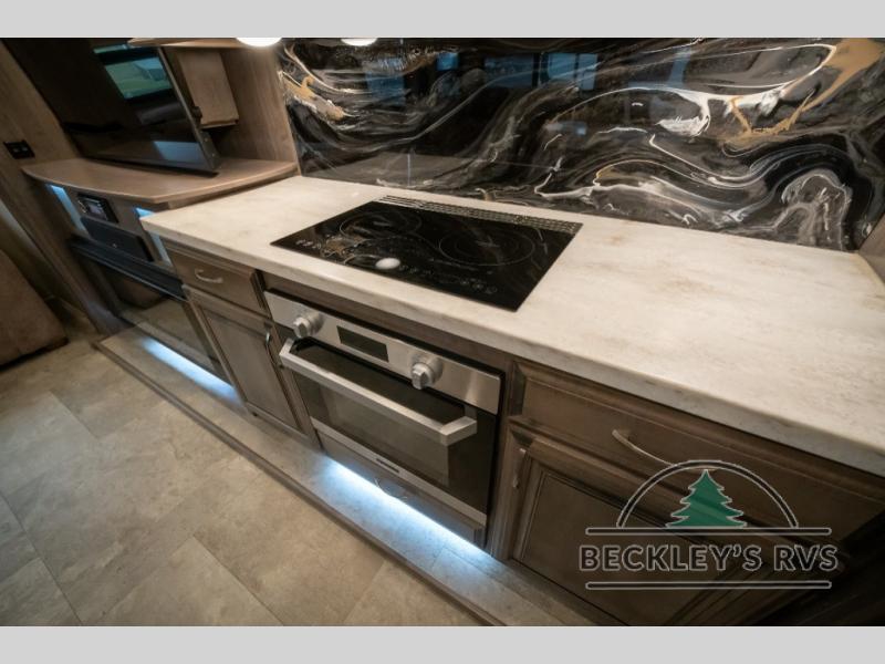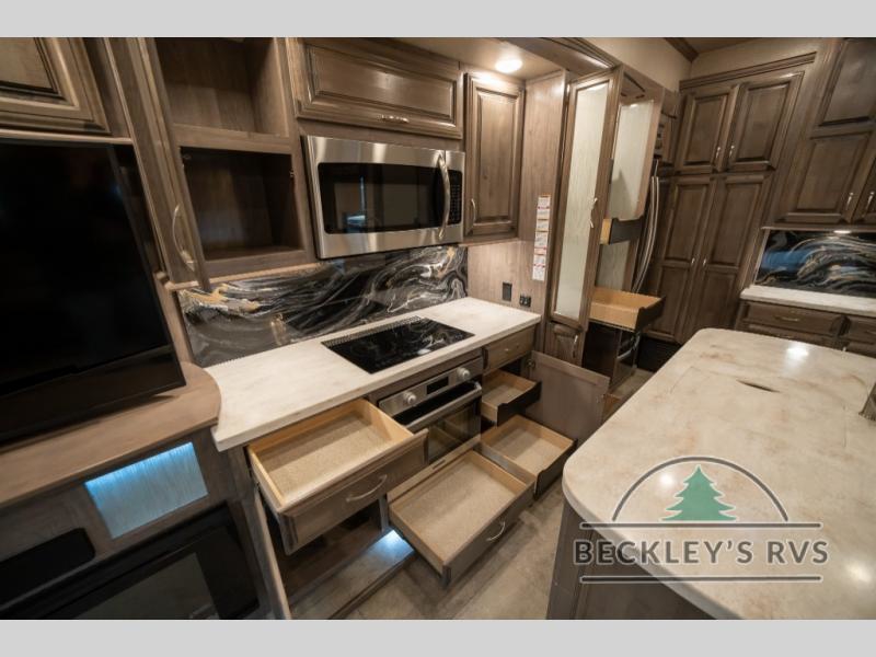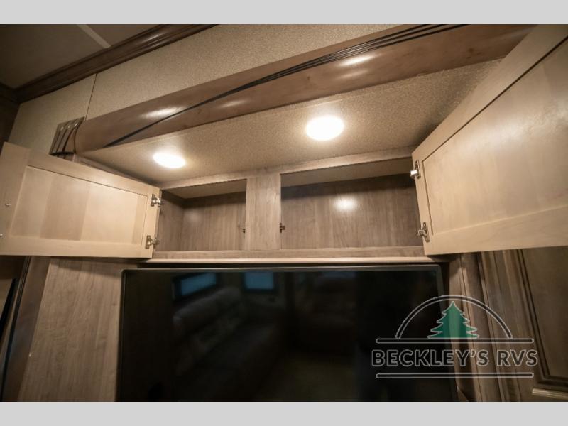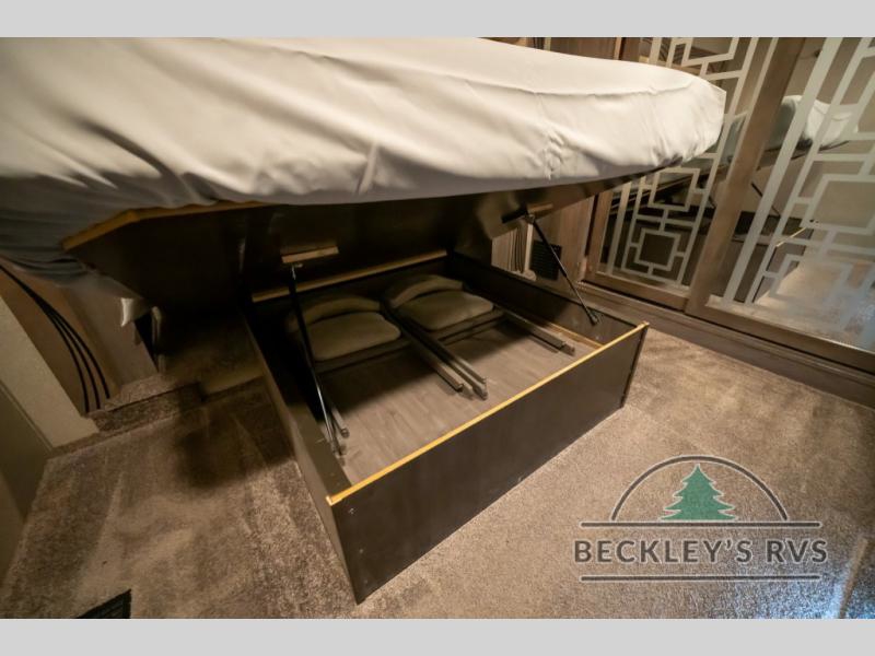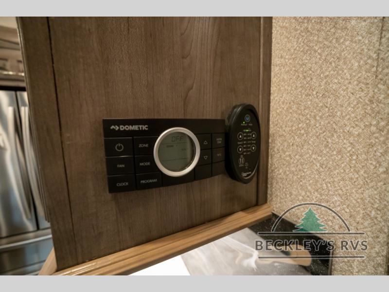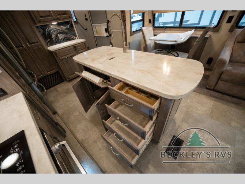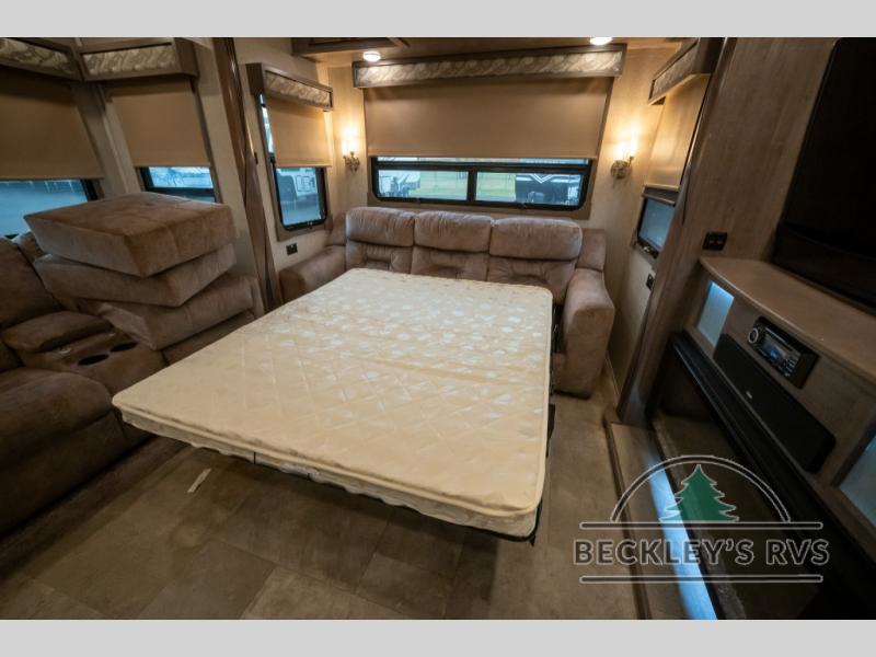 This fifth wheel is the perfect couple's coach to enjoy traveling the countryside with or setting up home base for awhile longer at your favorite location. From the three spacious slide outs for increased interior space, to the theater seats directly across from the fireplace, you will feel right at home! The kitchen island has a double sink, extra counter space, plus you can add an optional dishwasher which will speed up the clean-up process. Enjoy your meals at the free-standing dinette, and at night head up the stairs to the private front bedroom where you will find a king bed, a full-length wardrobe for your clothes, plus there is a spot that has been prepped for a washer and dryer so that you can easily keep up with the laundry while you are away from home!