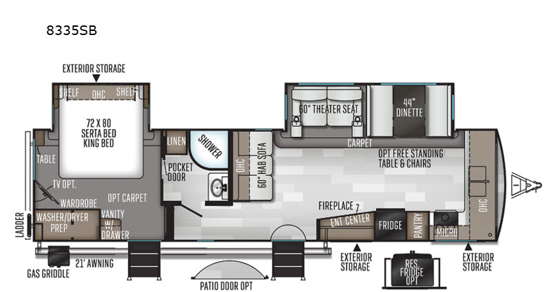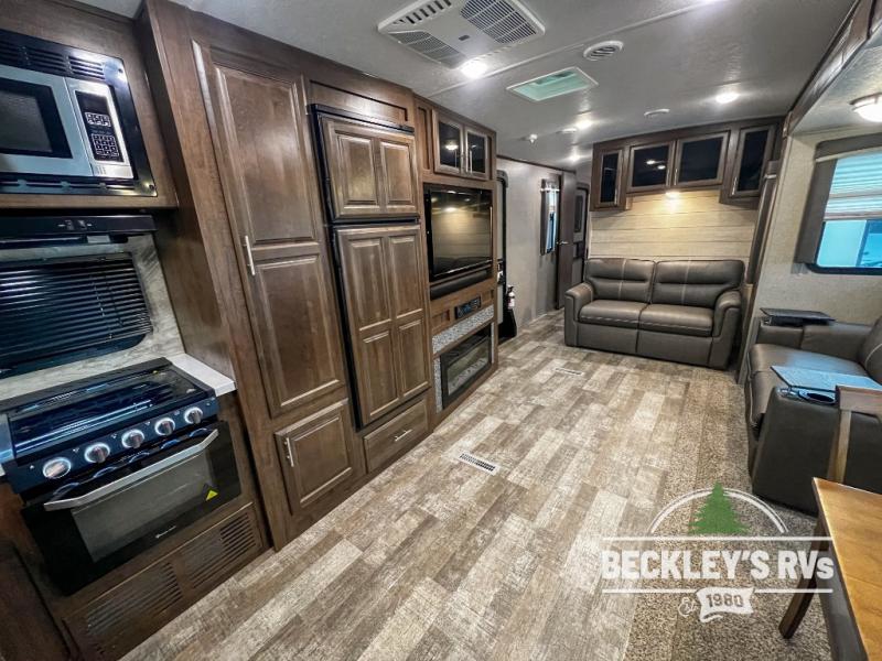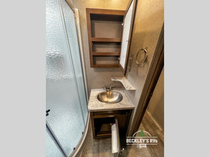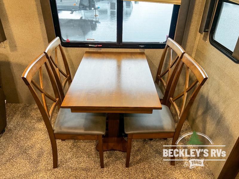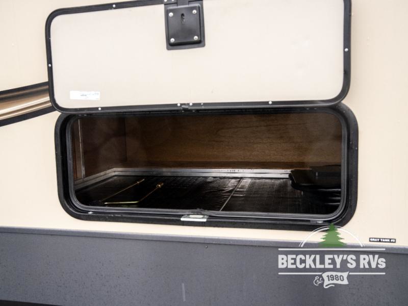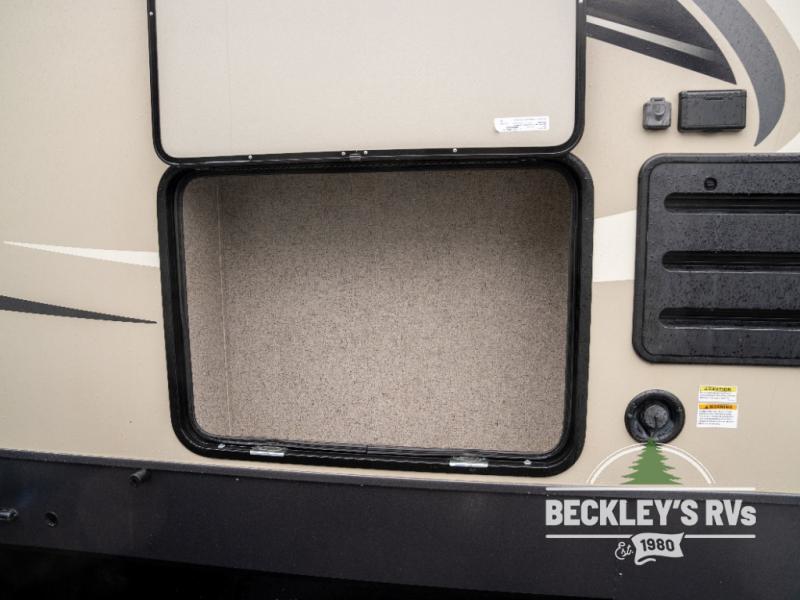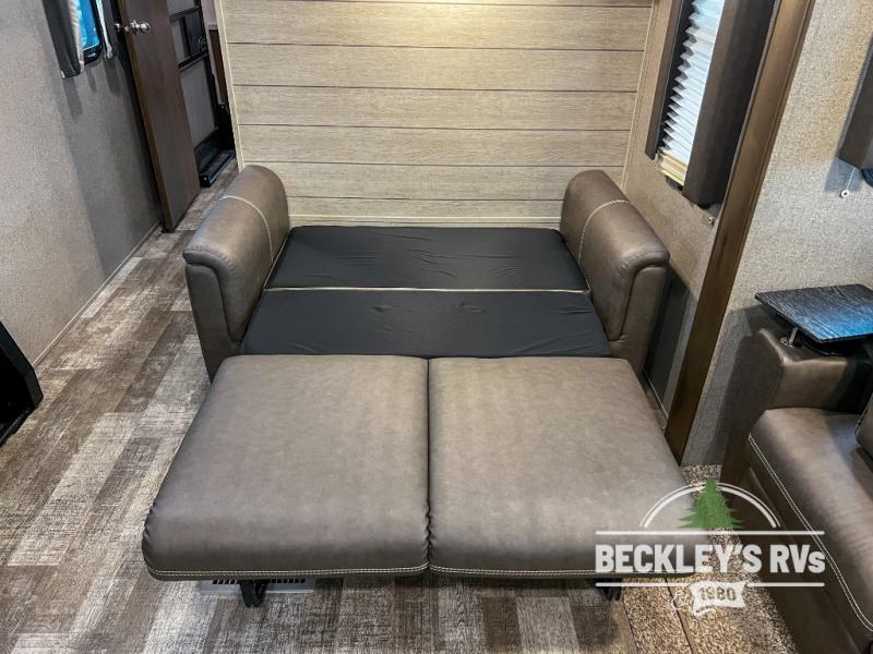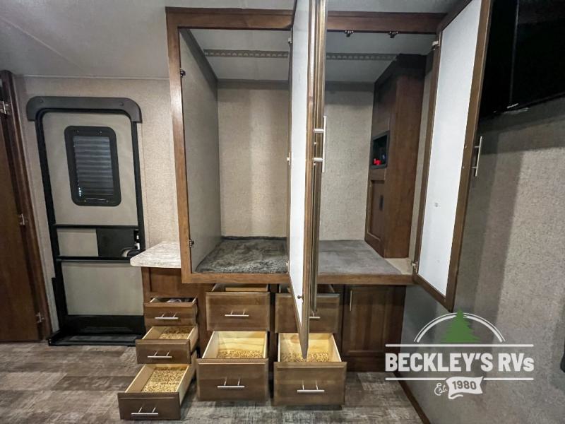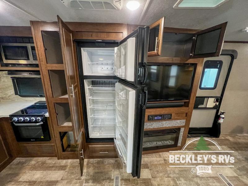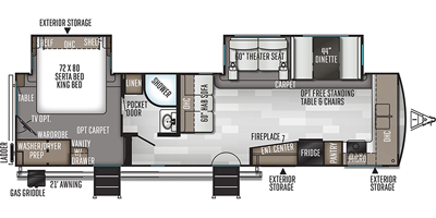 This travel trailer includes many at-home comforts and all the conveniences you need while camping with family. The front kitchen includes ample counter space and the pantry will come in handy for paper goods and snacks. You'll find comfortable seating space on the dinette booth, hide-a-bed sofa, and theater seat and the LCD TV with a fireplace will provide all your entertainment needs. This model features a rear private suite with its own exterior entry door, access into the dual entry bath, and a space that has been prepped to add a washer dryer if you choose.