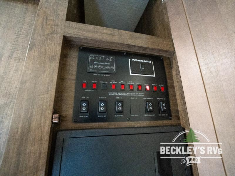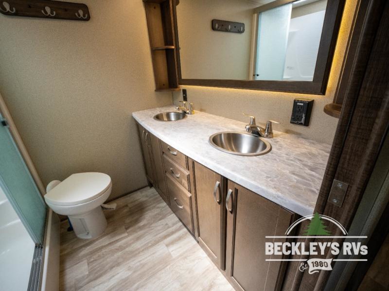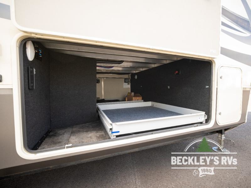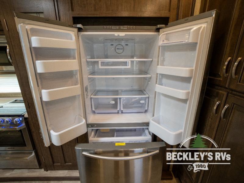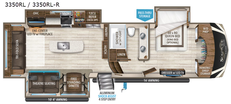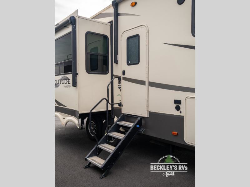 This Solitude S-Class fifth wheel will have you daydreaming about all the places you will visit, and maybe change you into a full-timer once you see all the amenities. Of course your sleeping accommodations are very important to you, the front master suite offers a queen bed or choose an optional king size if you prefer. And your spouse will surely love having their own sink in the bathroom, and plenty of clothing storage in the bedroom. The cook will enjoy using the professional grade stainless steel cooktop and convection microwave, the oversized pantry, the hutch, the stainless steel 12 cu. ft. four door refrigerator, plus the kitchen island. Everyone can relax in the rear living area on the tri-fold sofa or on the theatre seats for a massage. There are many more features to enjoy such as the fireplace, and options to add like a washer and dryer and/or a residential refrigerator. Start your plans now!