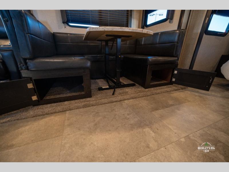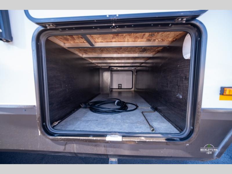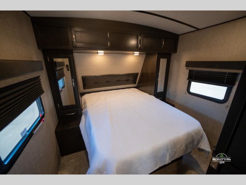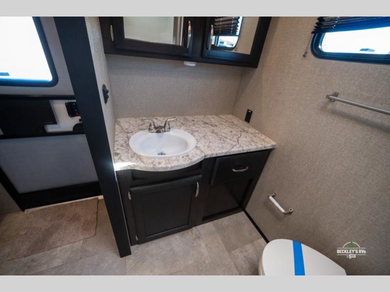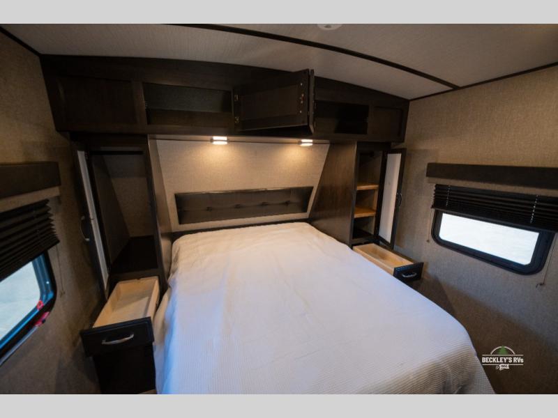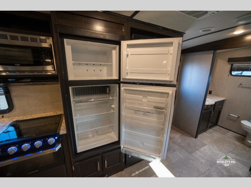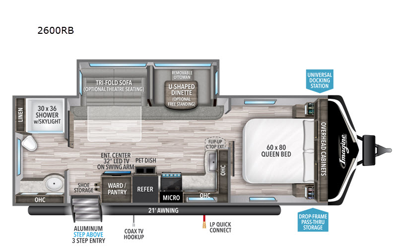 Imagine yourself placing your tennis shoes in the shoe storage before relaxing on a tri-fold sofa, or eating a snack at the U-shaped dinette. You can even fill your dog's water bowl in the pet dish drawer below the refrigerator.  This travel trailer has the perfect layout for a couple or a family of five to six.  The kitchen and bath amenities allow you to make meals, and skip the public facilities.  When it is time to retire for the evening you can retreat to the front bedroom with a space savings sliding door.  Now imagine you own this trailer and how many places you have already visited.
