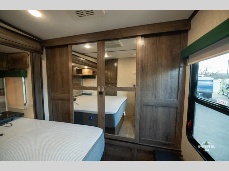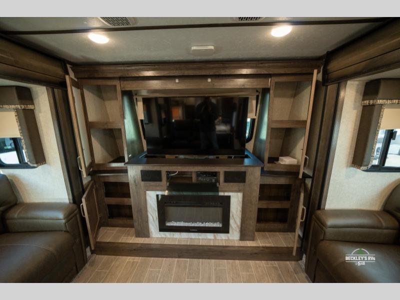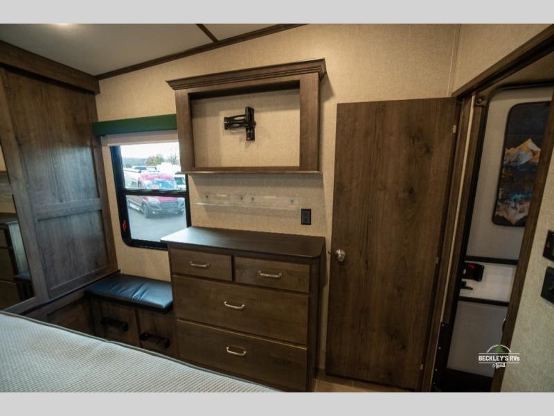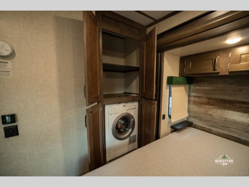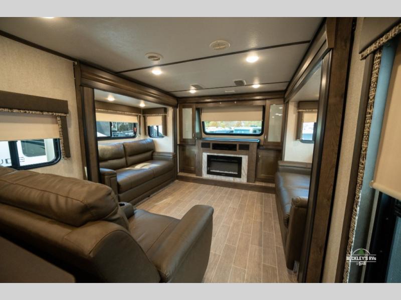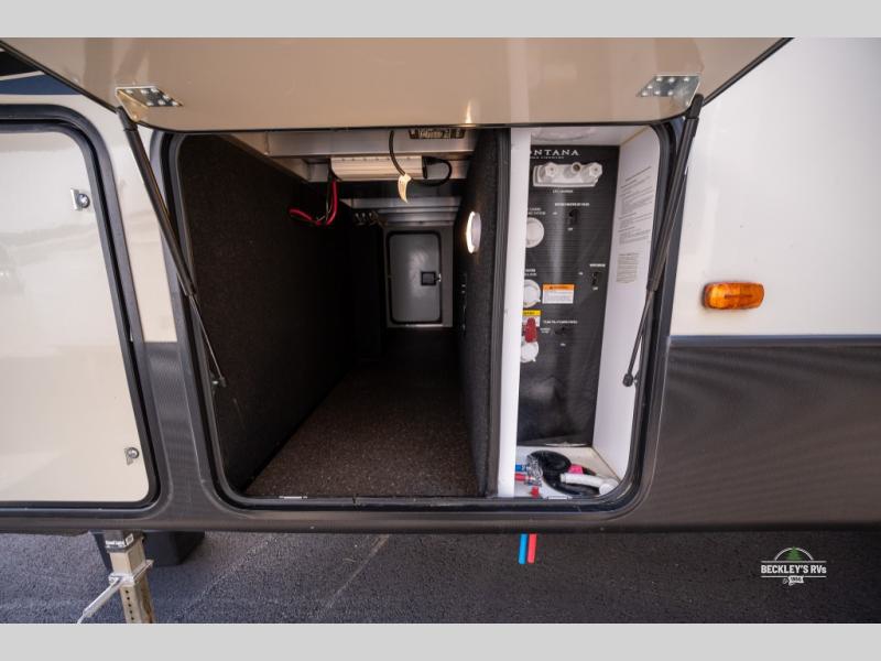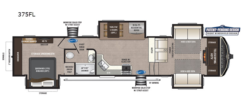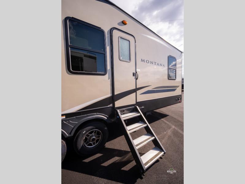 If you like uniqueness with luxury and convenience then it's time to take it up a notch in this Montana High Country fifth wheel. Model 375FL offers a patent-pending front windshield design and unique dual entry, one main entrance along the awning side and one entry across from the bathroom on the opposite side of the fifth wheel. You will enjoy great traffic patterns from this floorplan design. The front living area offers plenty of seating choices plus a HD LED TV above an LED fireplace to keep you warm during the chilly nights. The rear bedroom allows you to relax on a queen bed and watch a show on the HD LED TV before bedtime. You might even choose to add the washer/dryer option so you can clean your clothes while away from home. There is bench seating and a hamper you will also appreciate. Check this unit out today!