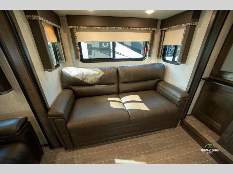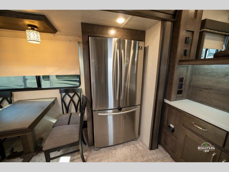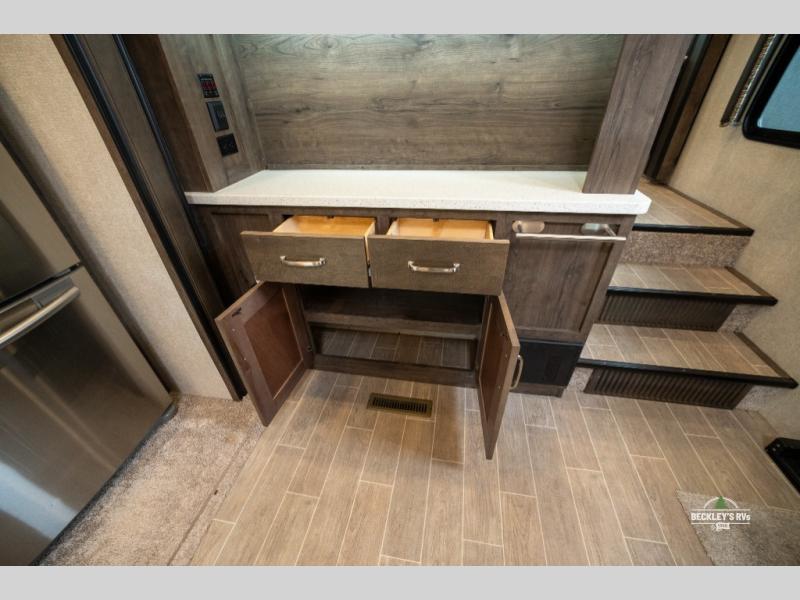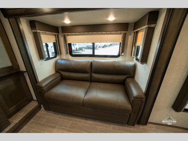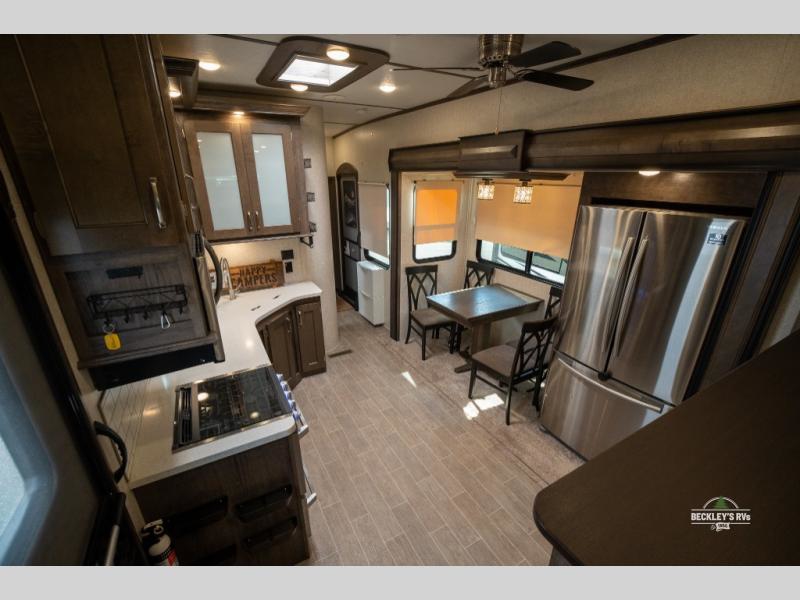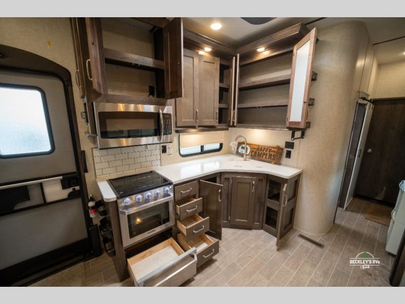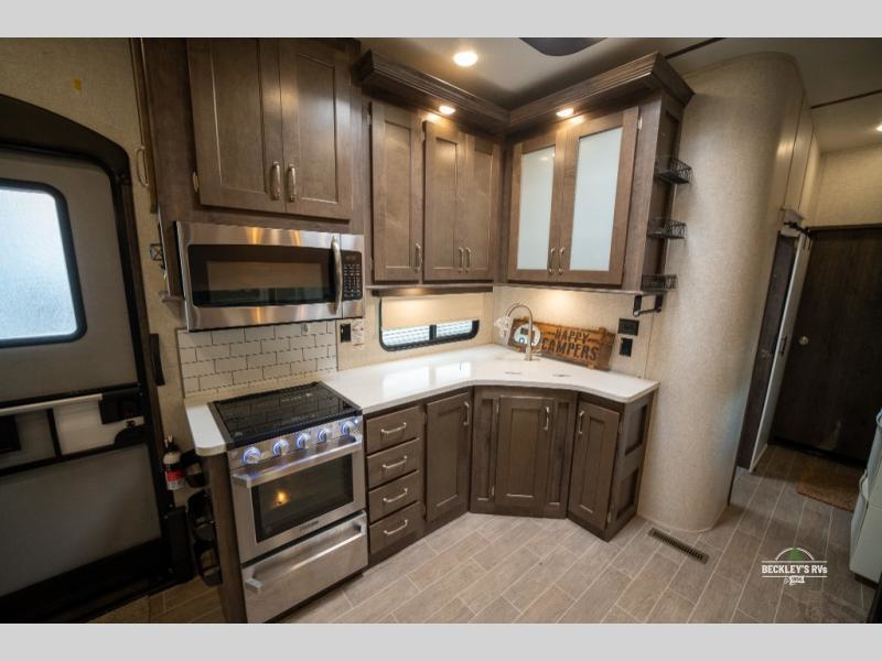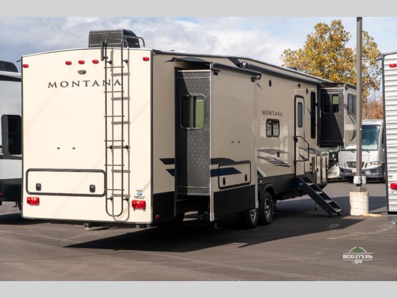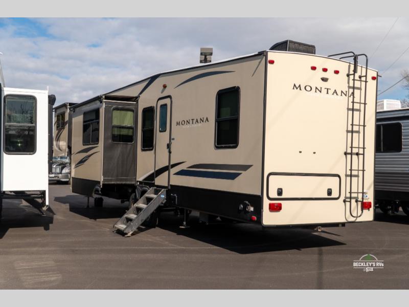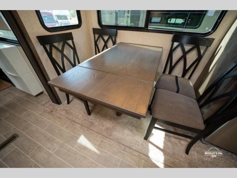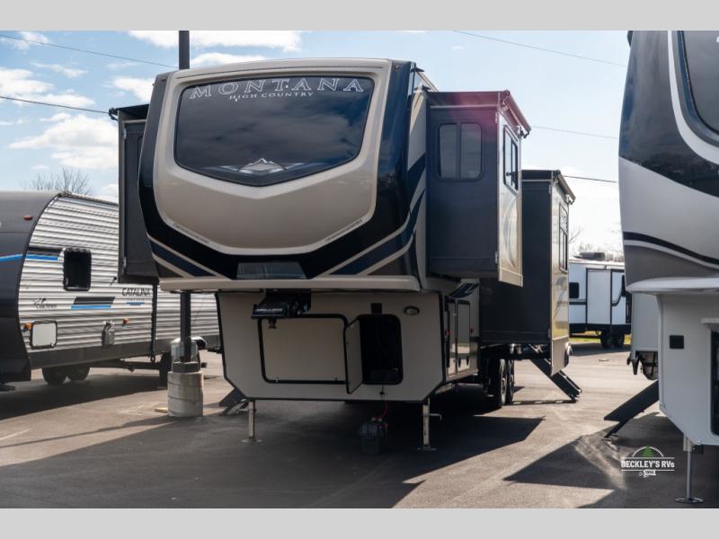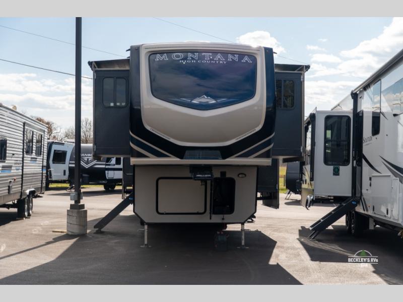 When heading out and setting up in a Keystone Montana High Country fifth wheel you will appreciate the Dexter E-Z Lube axles, Max Turn front cap and radius frame with Hitch Vision, and an enormous drop frame pass-through storage compartment to name a few features. Inside you will find luxury and comfort with the 78" tall main slide outs and flush mounted LED interior lights. The bath features a skylight over the shower, seamless countertops, and a vanity with three drawers for extra storage space!. The chef of the family is going to love the Montana High Country's kitchen with its Furrion 21" two in one stainless steel cooktop and oven, a 30" over-the-range microwave, solid surface countertops, and a high-rise faucet with an integrated pull-out sprayer, plus so much more!