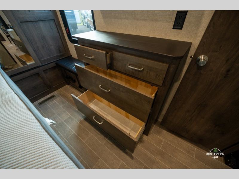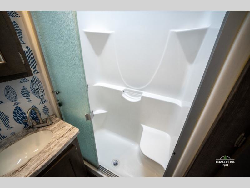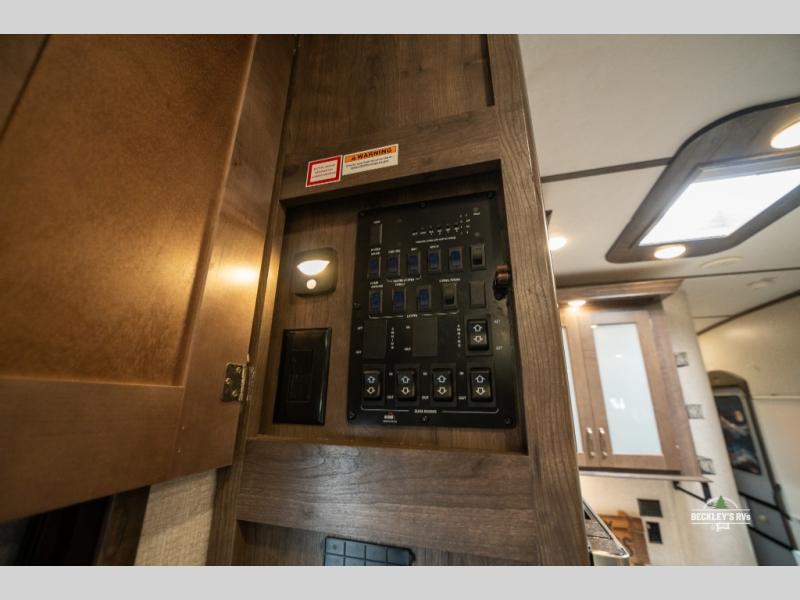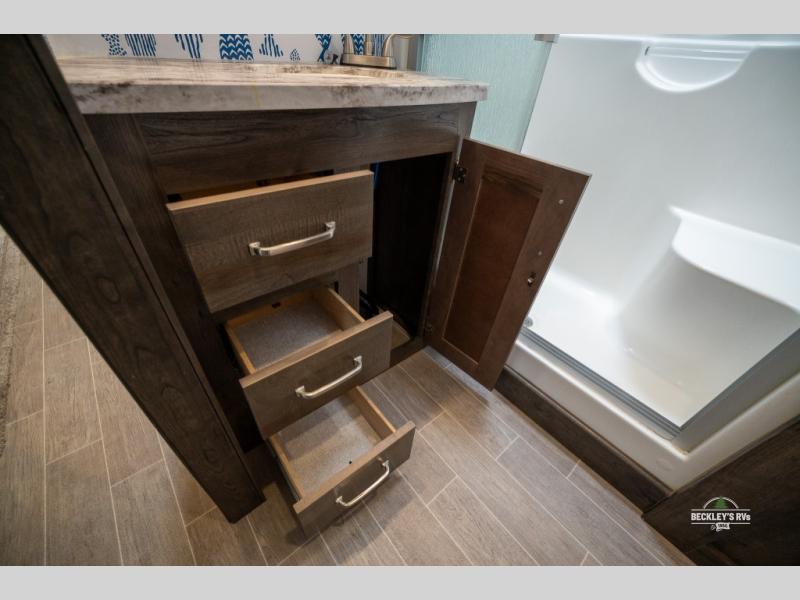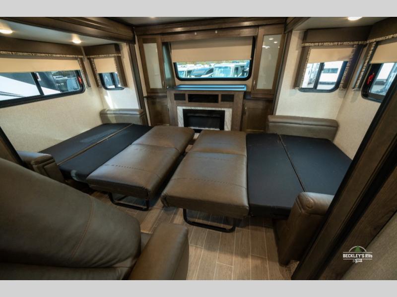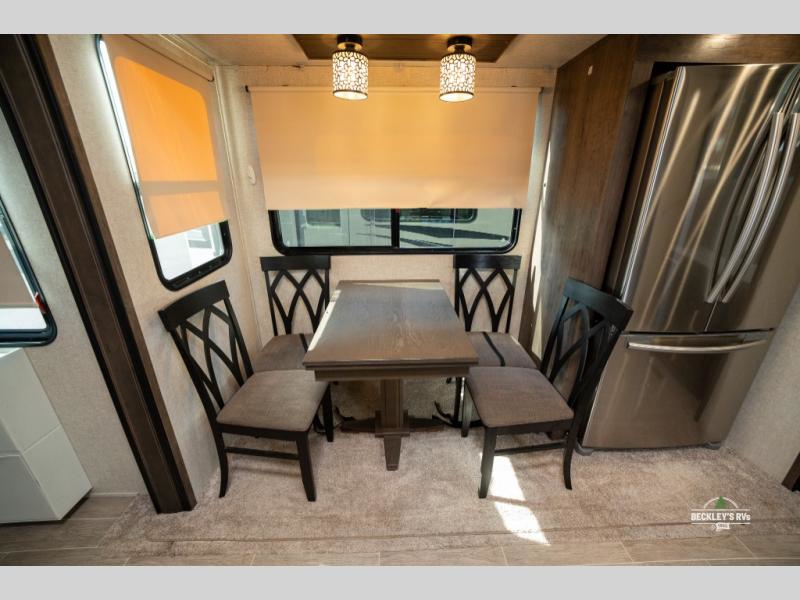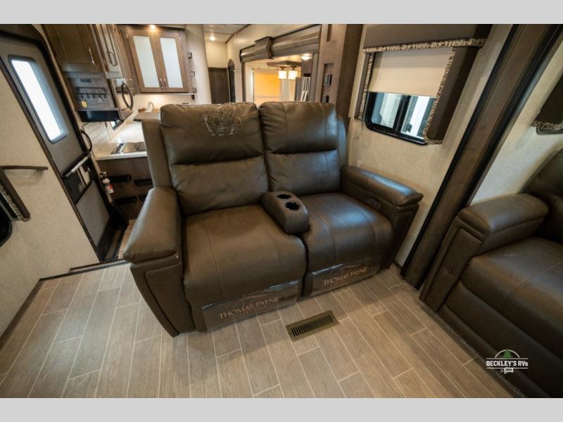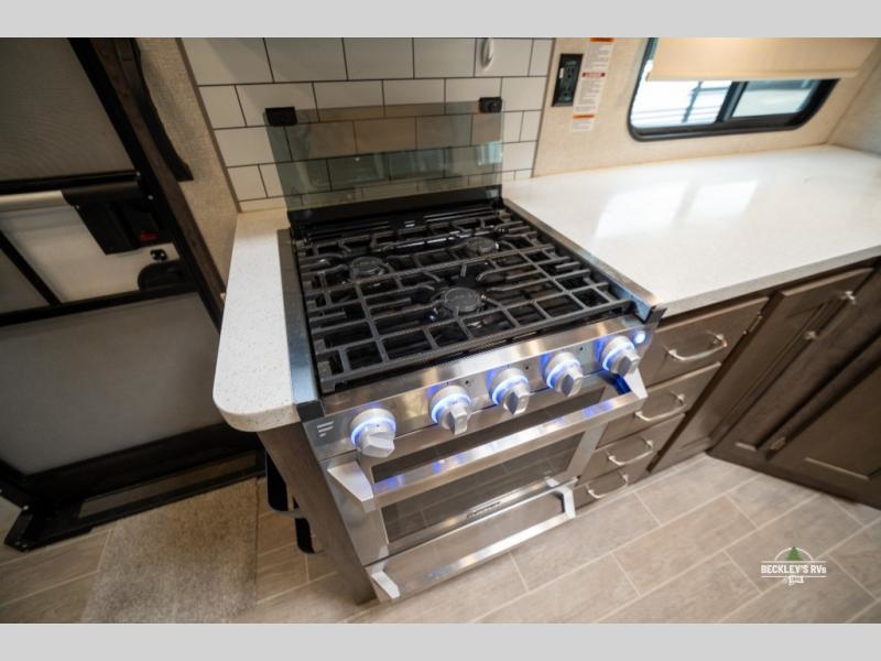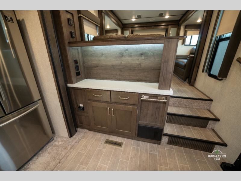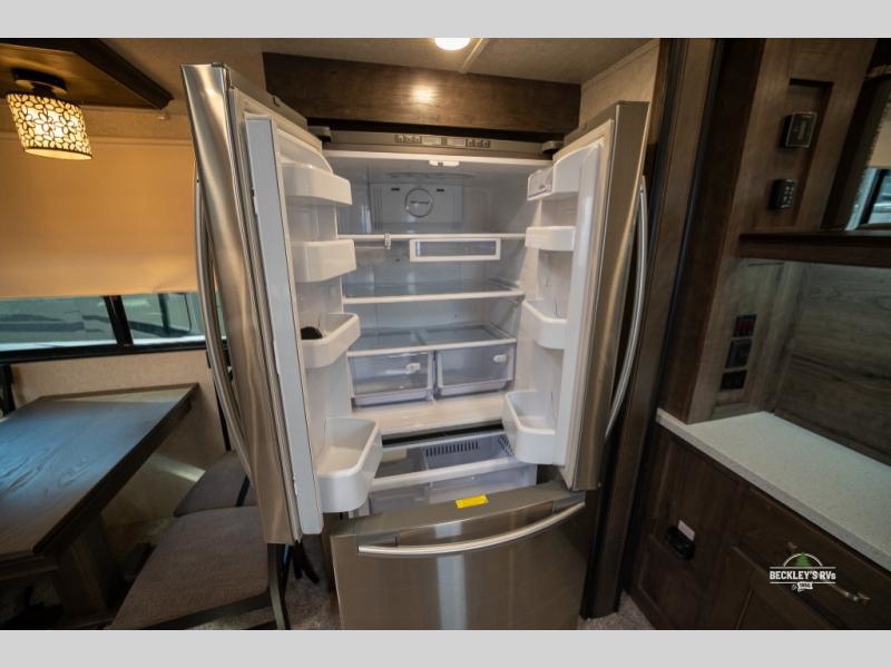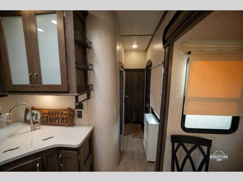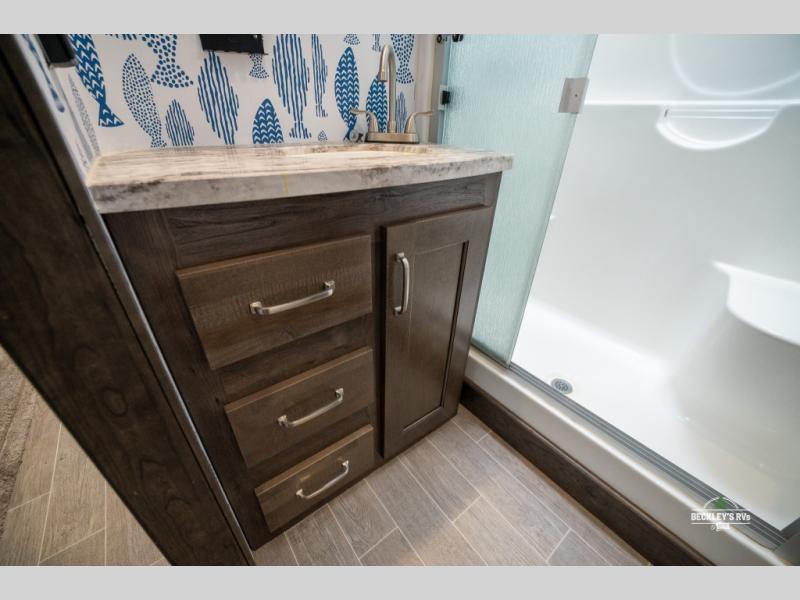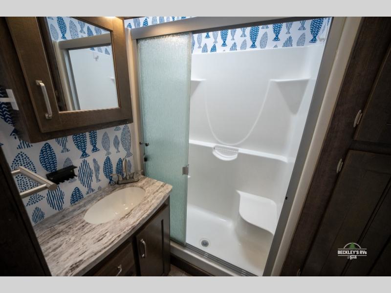 When heading out and setting up in a Keystone Montana High Country fifth wheel you will appreciate the Dexter E-Z Lube axles, Max Turn front cap and radius frame with Hitch Vision, and an enormous drop frame pass-through storage compartment to name a few features. Inside you will find luxury and comfort with the 78" tall main slide outs and flush mounted LED interior lights. The bath features a skylight over the shower, seamless countertops, and a vanity with three drawers for extra storage space!. The chef of the family is going to love the Montana High Country's kitchen with its Furrion 21" two in one stainless steel cooktop and oven, a 30" over-the-range microwave, solid surface countertops, and a high-rise faucet with an integrated pull-out sprayer, plus so much more!