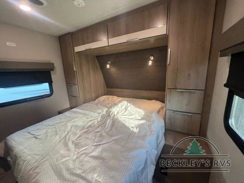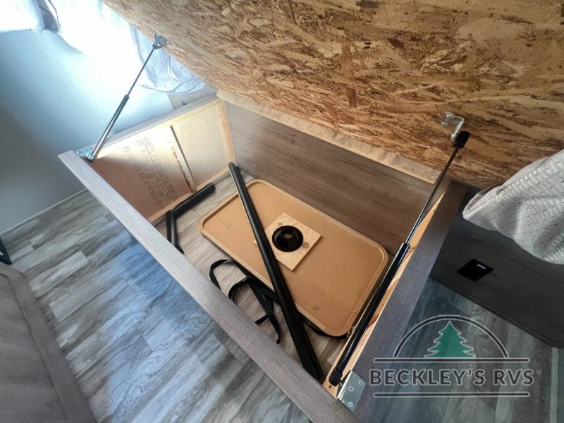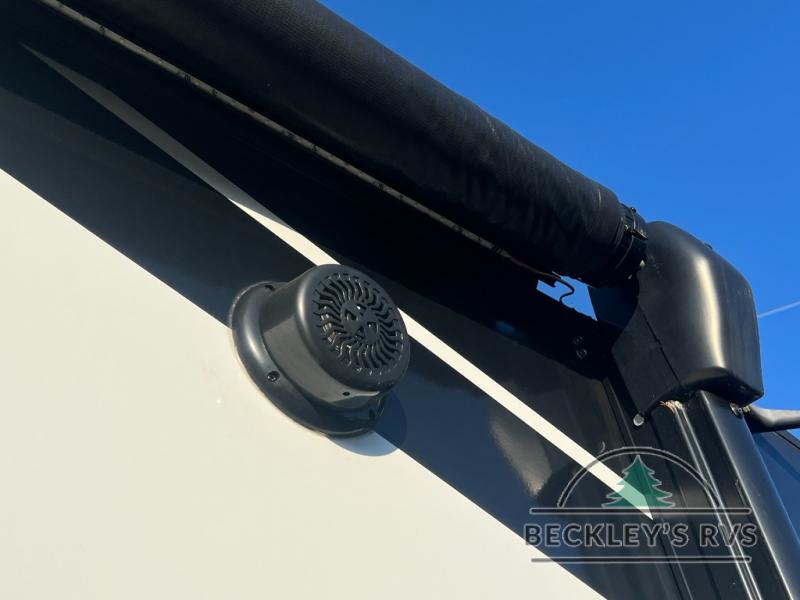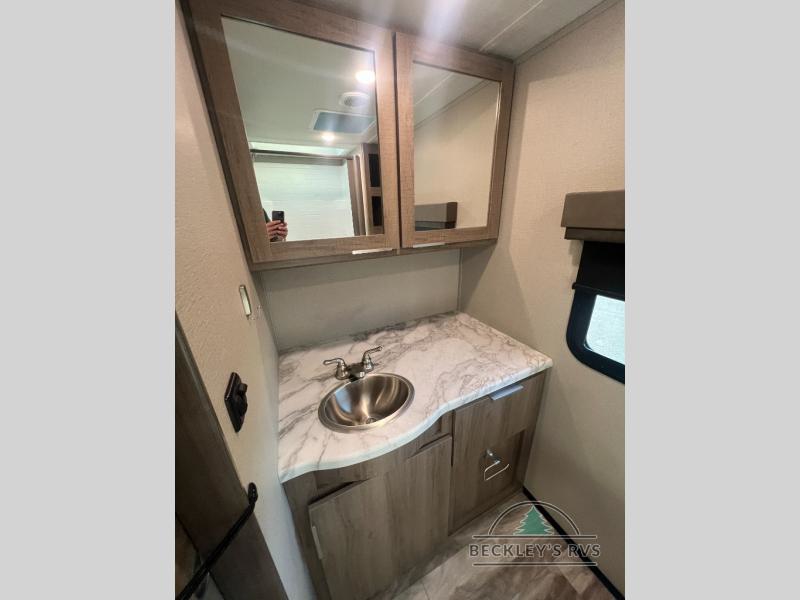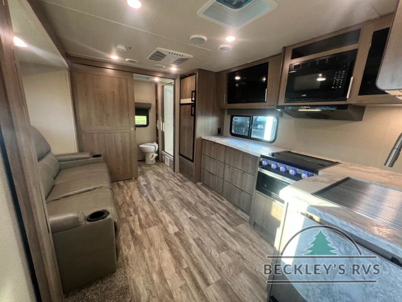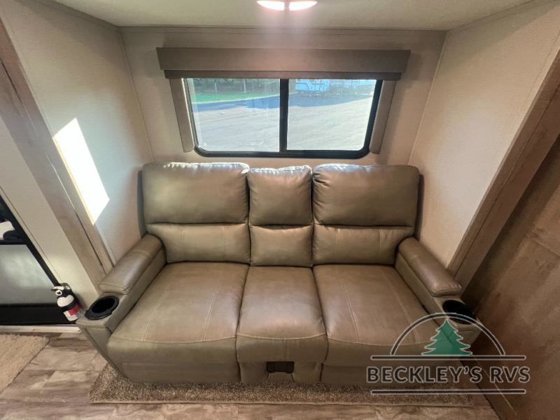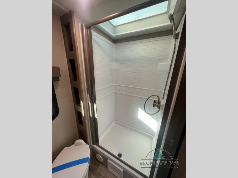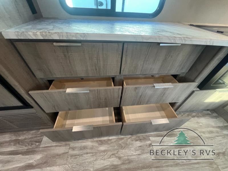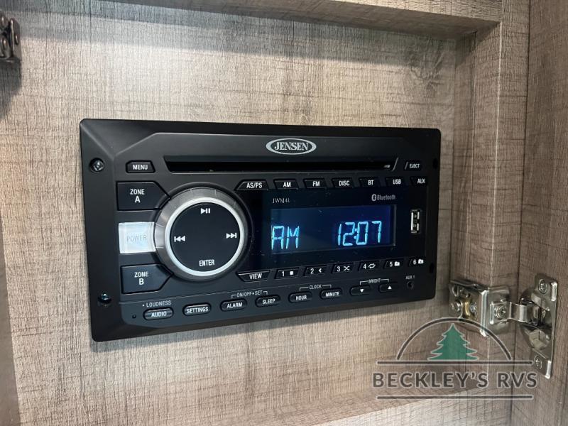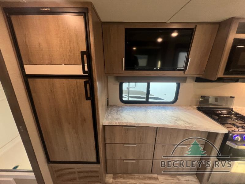 If you appreciate your privacy, this trailer offers a bedroom up front with a space saving door and a rear full bathroom with a space savings door, both giving you more interior space to enter and exit each area. The bathroom even has a window for great views plus extra counter space and storage for your toiletries and such. The bedroom gives a couple their own side of the walk-around queen bed to keep their clothing and such plus windows to check outside for the weather. The main living and kitchen area is spacious with a slide out theater dinette including a removable table or choose a booth dinette option. You can watch the HD TV while the cook makes a warm meal in the full kitchen. And the electric awning offers an outdoor living area when you add your camping chairs taken from the pass-through storage.
