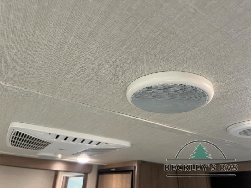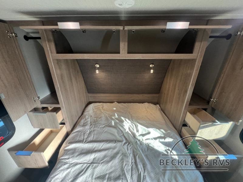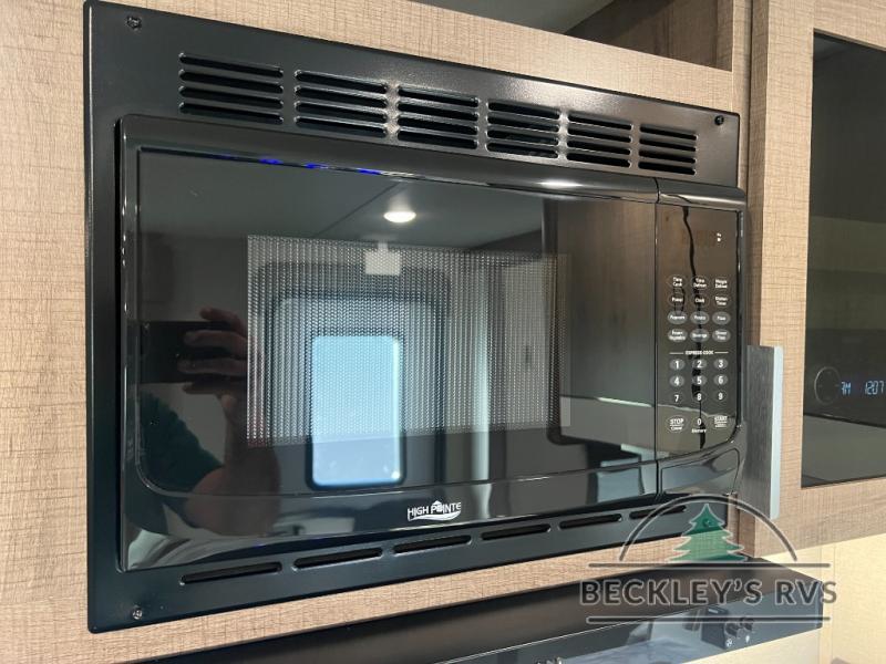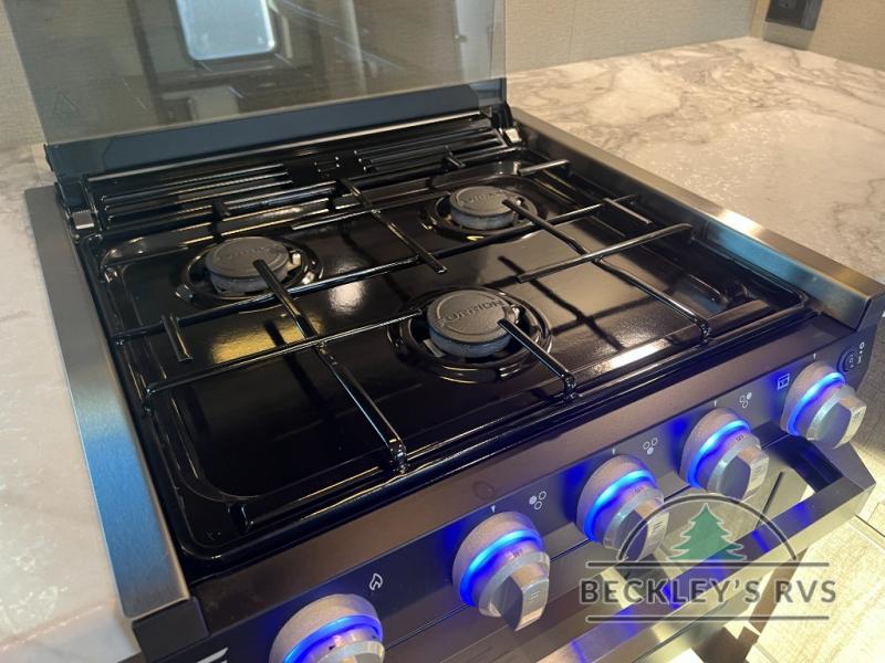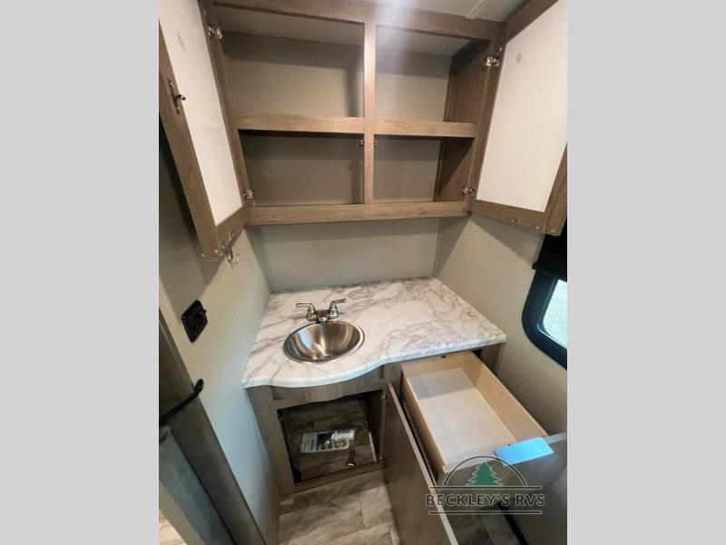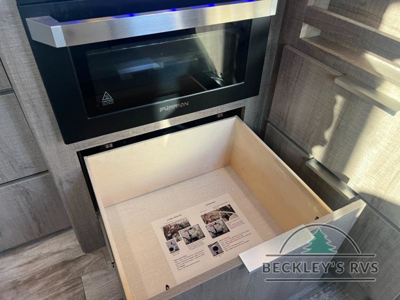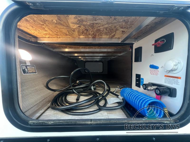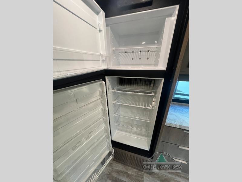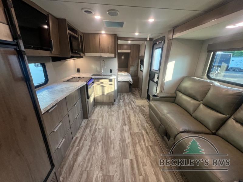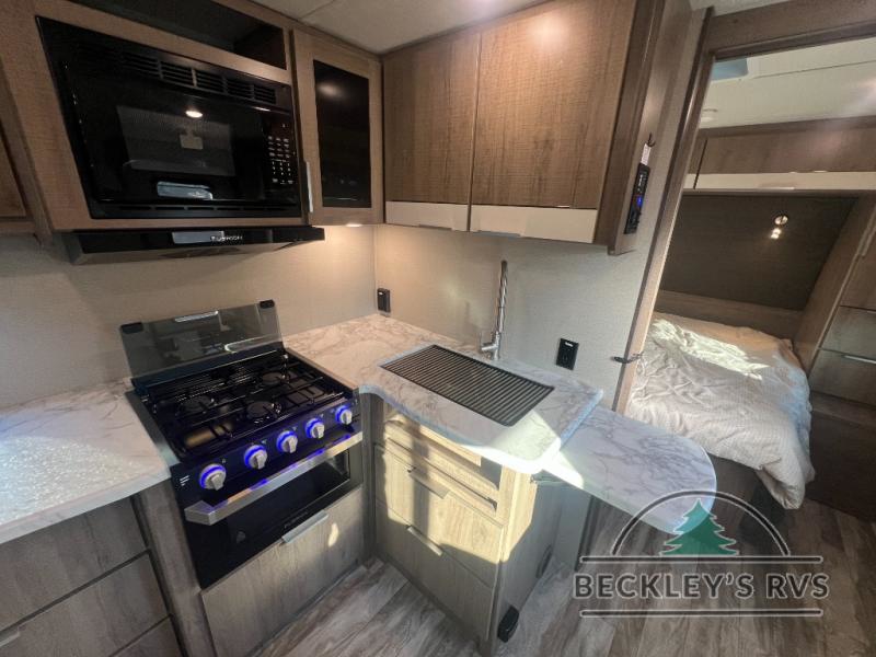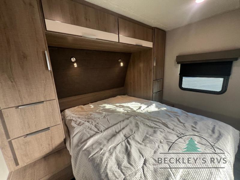 If you appreciate your privacy, this trailer offers a bedroom up front with a space saving door and a rear full bathroom with a space savings door, both giving you more interior space to enter and exit each area. The bathroom even has a window for great views plus extra counter space and storage for your toiletries and such. The bedroom gives a couple their own side of the walk-around queen bed to keep their clothing and such plus windows to check outside for the weather. The main living and kitchen area is spacious with a slide out theater dinette including a removable table or choose a booth dinette option. You can watch the HD TV while the cook makes a warm meal in the full kitchen. And the electric awning offers an outdoor living area when you add your camping chairs taken from the pass-through storage.