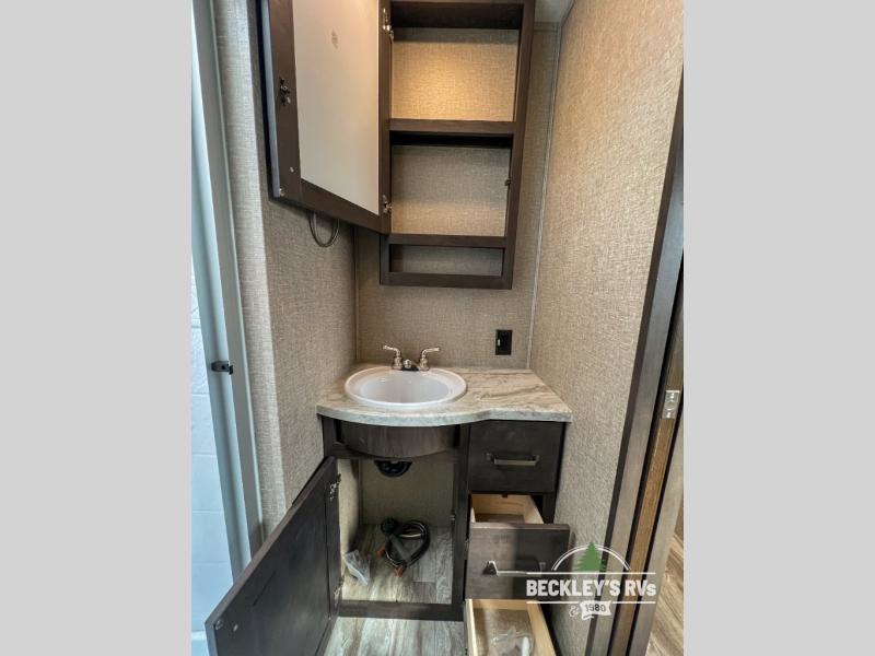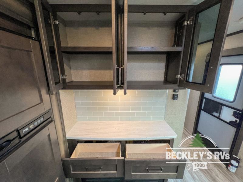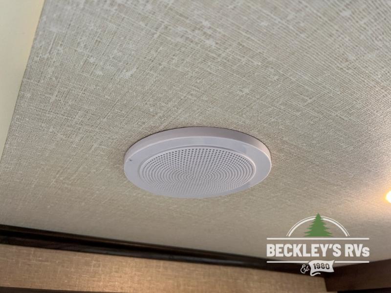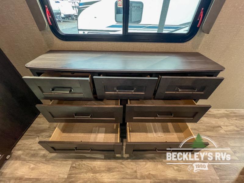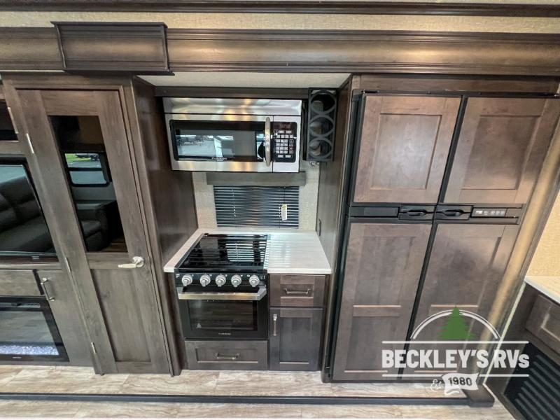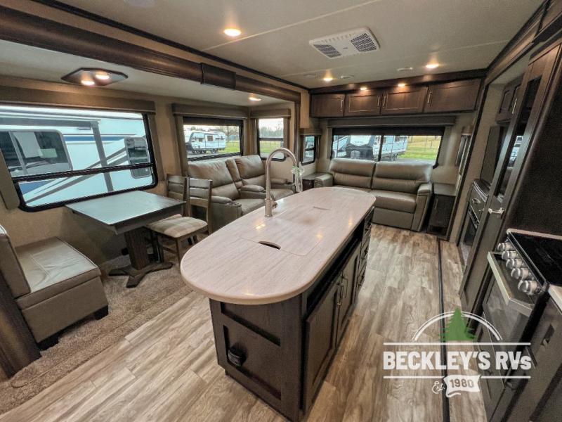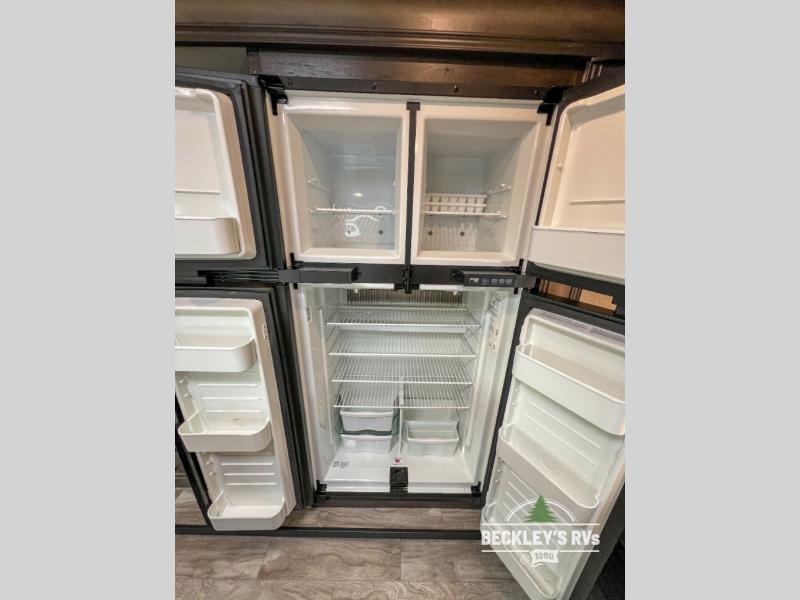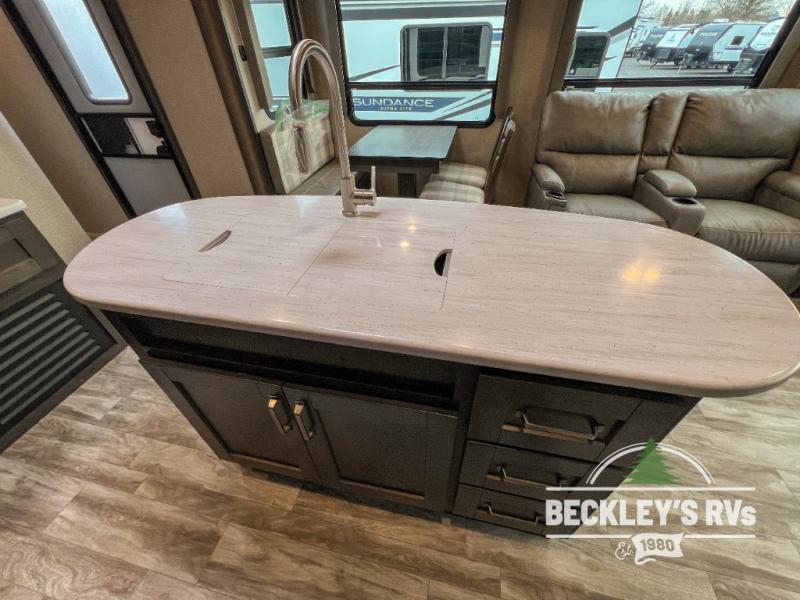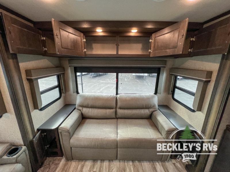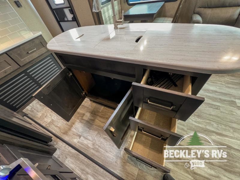 You won't want to camp any other way once you step inside this travel trailer! You can relax in true comfort each night on either the rear tri-fold sofa or the theater seating which is directly across from the entertainment center with a 40" HDTV and fireplace. You can prepare delicious home cooked meals in the gourmet kitchen with the three burner cooktop and the kitchen island, plus there is a 12 cu. ft. refrigerator to store any leftovers and a hutch to store your nice dishes. You can even choose to add the optional free standing dinette with ottoman storage to enjoy your meals at. Start each morning feeling squeaky clean after showering in the 30" x 36" shower with a skylight above for added natural lighting!