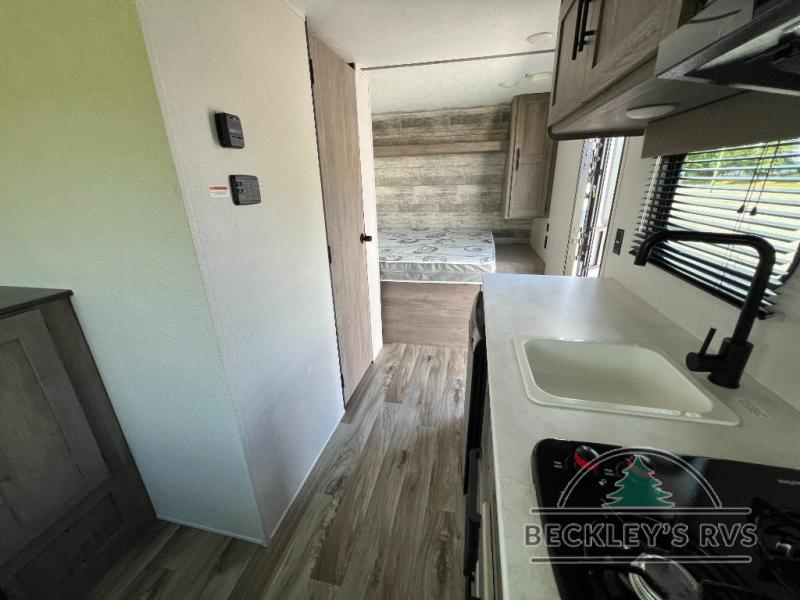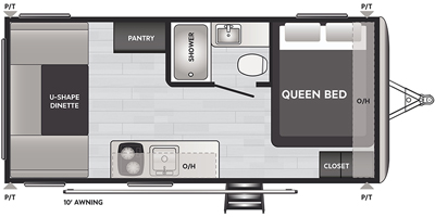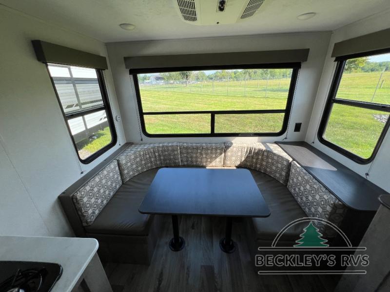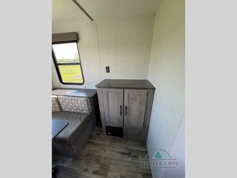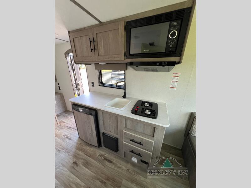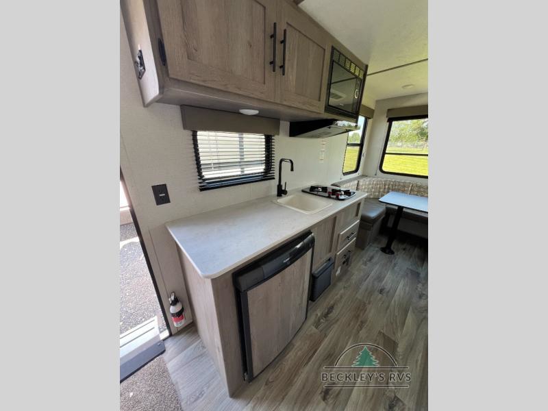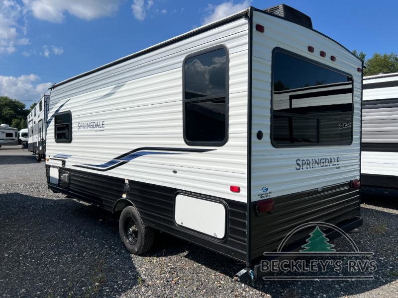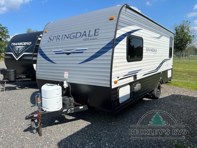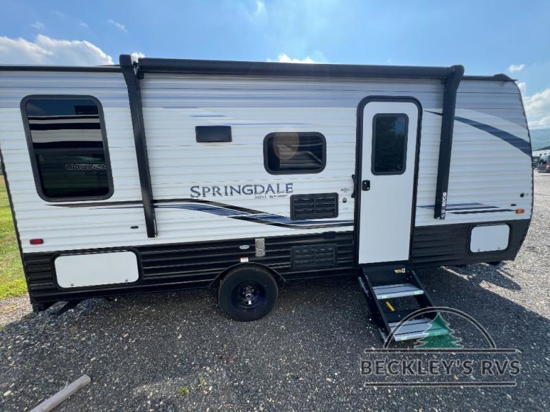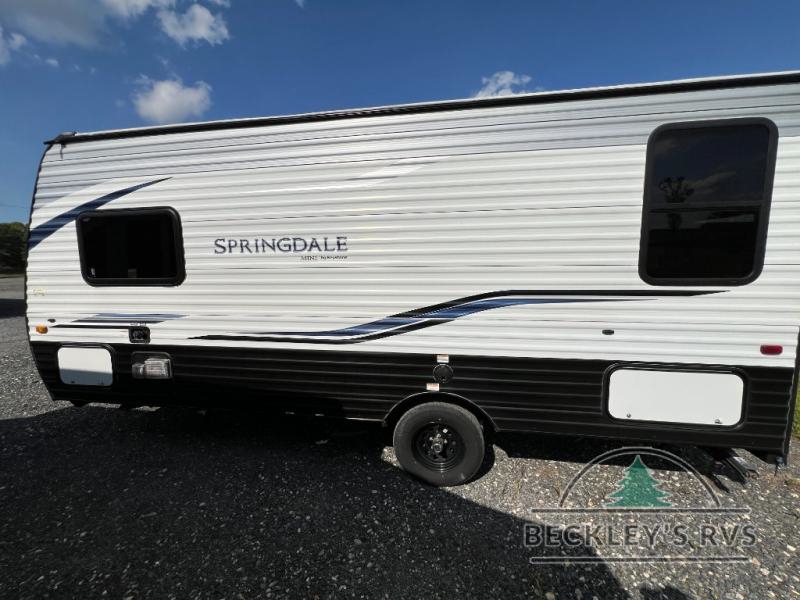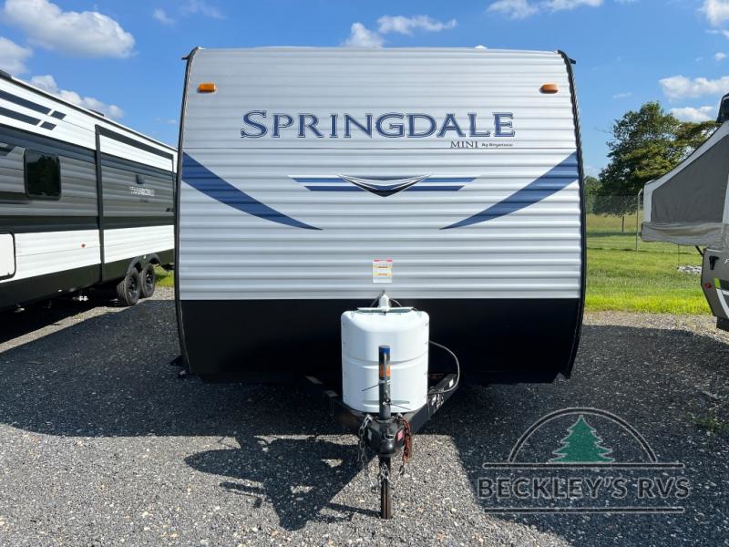 If you're ready for camping near or far, you will want an easy to tow, lightweight Keystone Springdale Mini travel trailer. These models include a power awning with LED lights, a pass-through storage compartment for all your gear, and LCI SolidStep entry steps for your convenience. The interior is made bright and open with a Whitewashed brick accent wall, larger windows, and lighter vinyl flooring throughout. You will find many convenient storage solutions, such as wall-mounted cargo nets next to each USB port for your tablet, camera, or phone, two shelves above the bed for your books, and easy access storage under the sofa or bunks where applicable. These travel trailers also include safety measures for your peace of mind, including GFI receptacles, smoke and carbon monoxide detectors, a fire extinguisher, plus more!