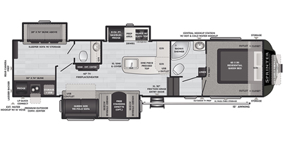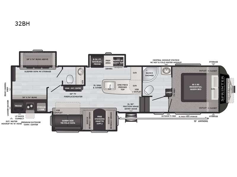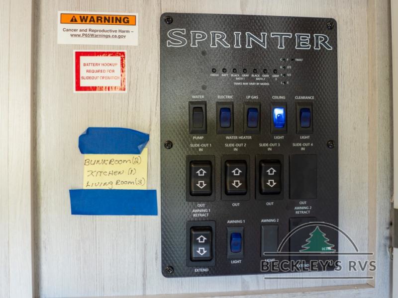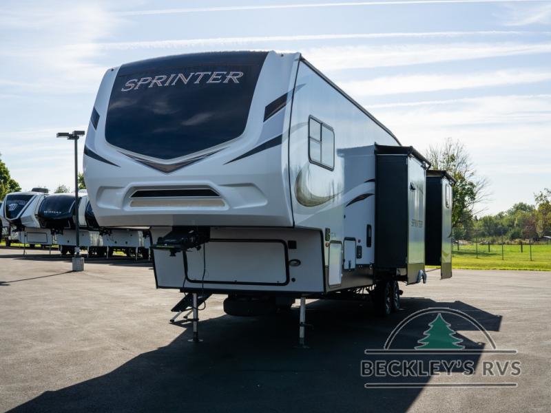 Redefine your camping experience with a Keystone Sprinter fifth wheel! You are sure to appreciate the exclusive features such as the in-floor heat ducts, the color-coded unified wiring, and the Tru-fit slide construction which resist leaking. Some premium features include crown molding, an eight function remote for the awning, stabilizers/leveling, slide outs and awning lights, and deep drawers with full extension heavy-duty guides. Each model is also prepped for solar power, a backup camera, plus 4G LTE and WiFi. Make camping easy by choosing your favorite Sprinter today!