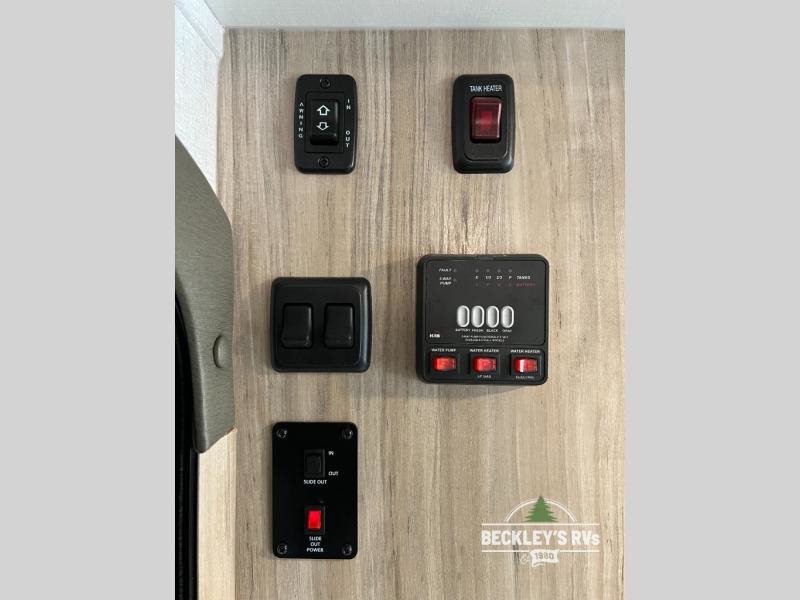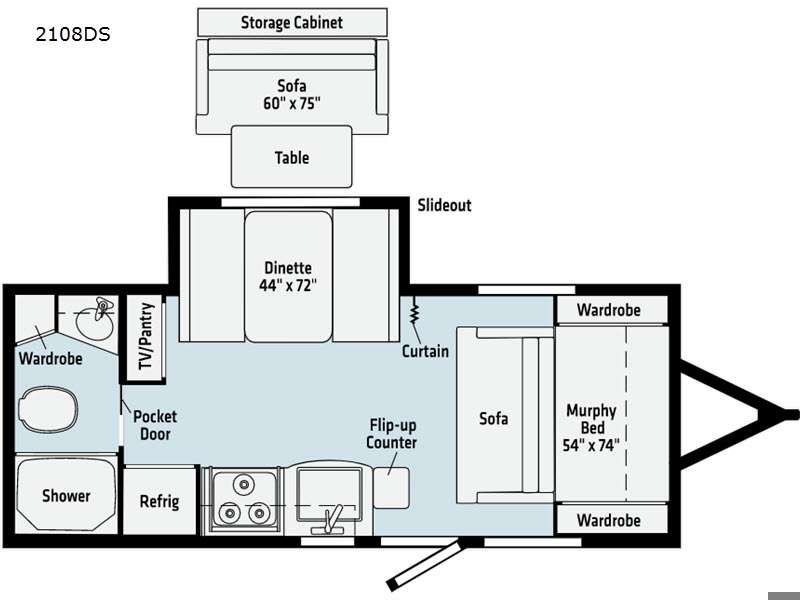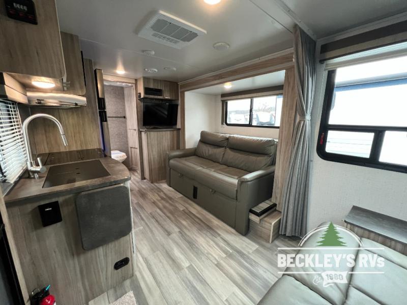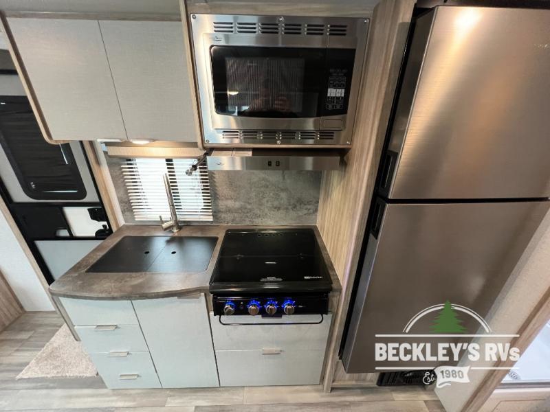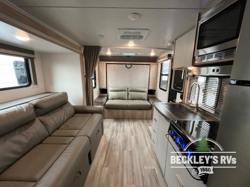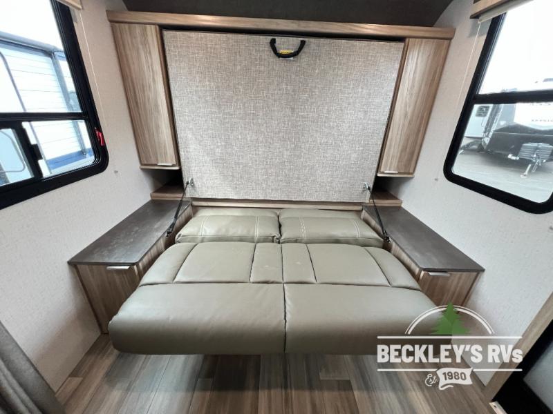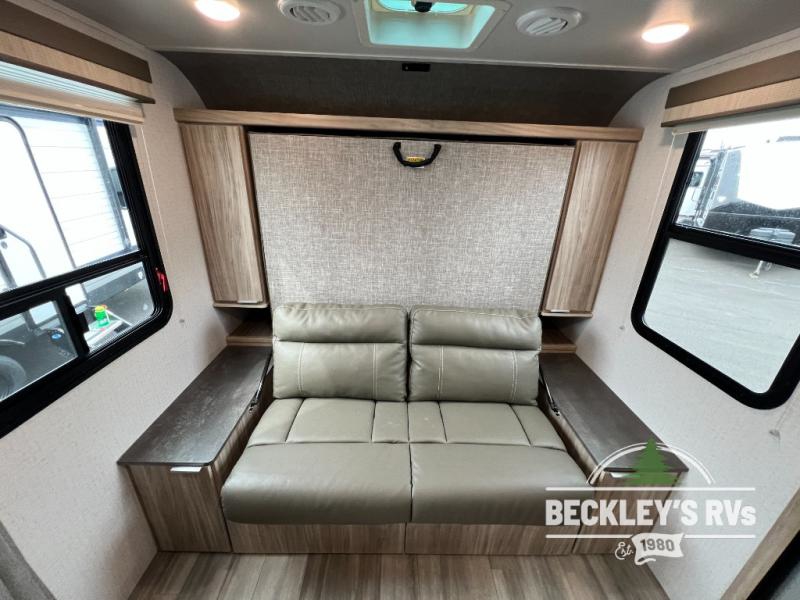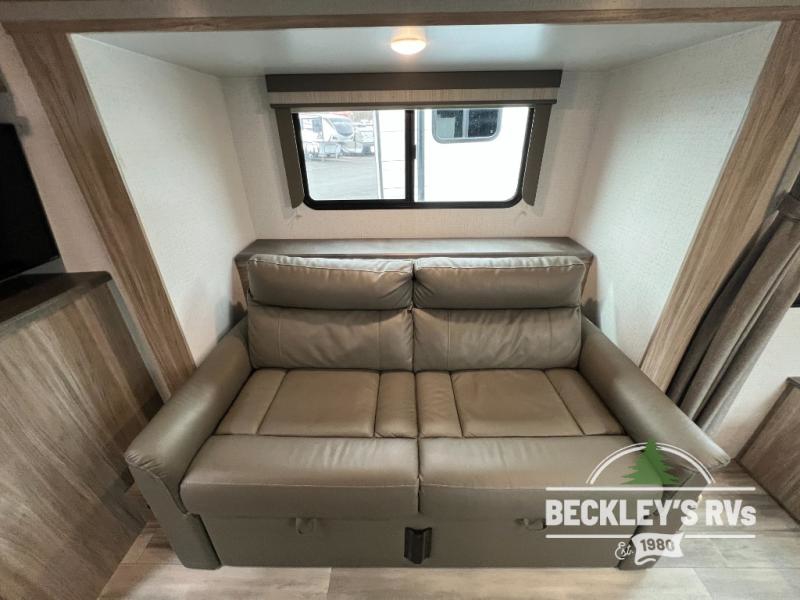 If you're looking for versatility then you need this travel trailer! Depending on the time of day you enter will determine whether you see the Murphy bed or the sofa up front. The 44" x 72" booth dinette slide can be used for eating your meals, playing games, and sleeping space at night. The full rear bathroom is equipped with everything you will need to freshen up each morning and provides a skylight above the shower and a wardrobe for your clothes and linens, plus a pocket door to save space. The LED TV is conveniently located so you can watch your favorite shows, plus the pantry offers a place to store your snacks and such for easy access. And the cook will love all the amenities to make meals including the handy flip-up counter.