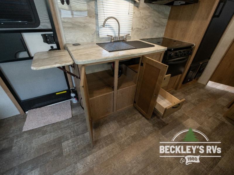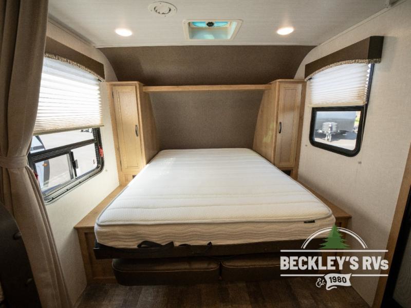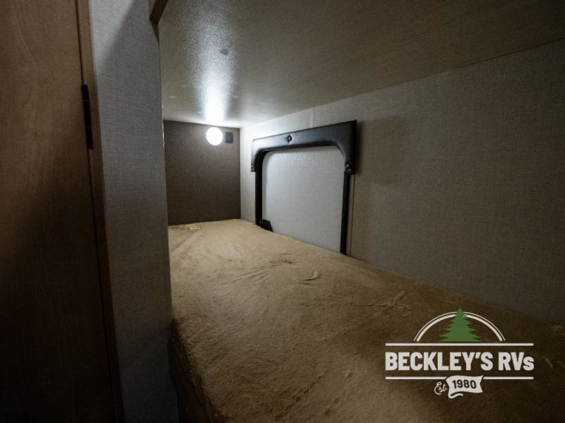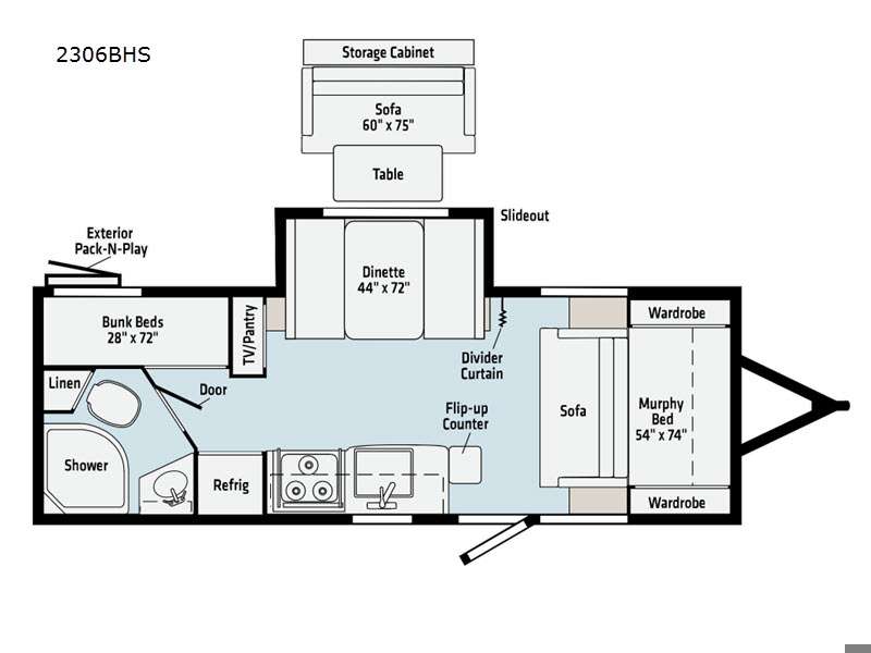 Load your kids into this travel trailer and experience a fun family getaway! The front Murphy bed offers versatile living by transforming into a 54" x 74" bed to sleep on at night and a sofa to sit on while socializing with the chef cooking at the three burner cooktop. The 44" x 72" booth dinette slide is a great place to eat your meals at, play games as a family, and even transform into an extra sleeping space if your kids want a friend to tag along. The kids will love sleeping on the rear corner 28" x 72" bunk beds and having the rear corner bathroom right next to them. As if that wasn't enough, there is an exterior pack-n-play door, a power awning with LED lighting, and patio speakers to crank up the tunes!