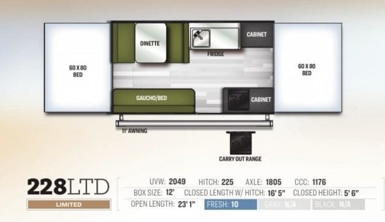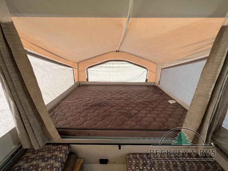 If you are ready for relaxing weekends at your favorite campsite, grab this Flagstaff MAC Series folding pop-up camper and get there! Stop spending your nights sleeping on the cold, hard ground, and enjoy the comfort that comes from the quilted-top mattresses on the two tent end beds. There is also additional sleeping on the main interior part of this camper with the booth dinette and gaucho/bed, and you can choose whether or not you want to prepare your meals inside or outside since this camper has an indoor range that can be taken outside to use as a carry-out range. As you are outside, you can also enjoy the convenience of having your own 11' awning.