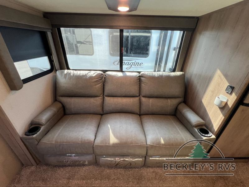 Just imagine leaving the world behind and secluding yourself away with your favorite people in your Grand Design Imagine travel trailer! The Imagine has been designed to enjoy extended season camping with its Four-Season Protection Package. This package includes a high-capacity furnace, a heated and enclosed underbelly with suspended tanks, a designated heat duct to the subfloor, and a high-density roof insulation with attic vent. You'll have maximum head room on the interior with 81" radius ceilings, and there is motion-sensor LED lighting in key areas so that you don't have to search for light switches in the dark. The exclusive drop-frame pass-through storage compartment is going to allow you to bring along lots of equipment, and the universal docking station is an all-in-one location for utilities and hook-ups. You'll also have industry-leading tank capacities so that you can fill and empty your tanks less often.