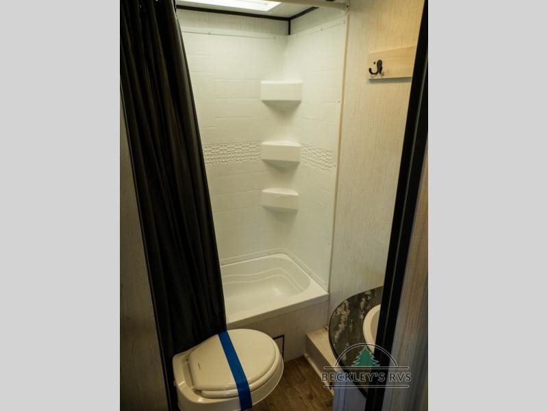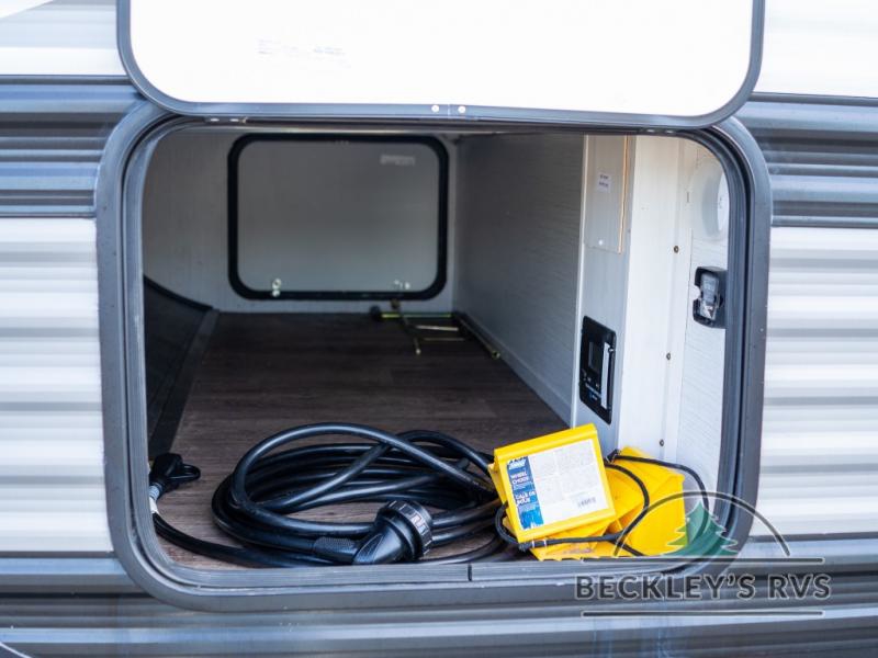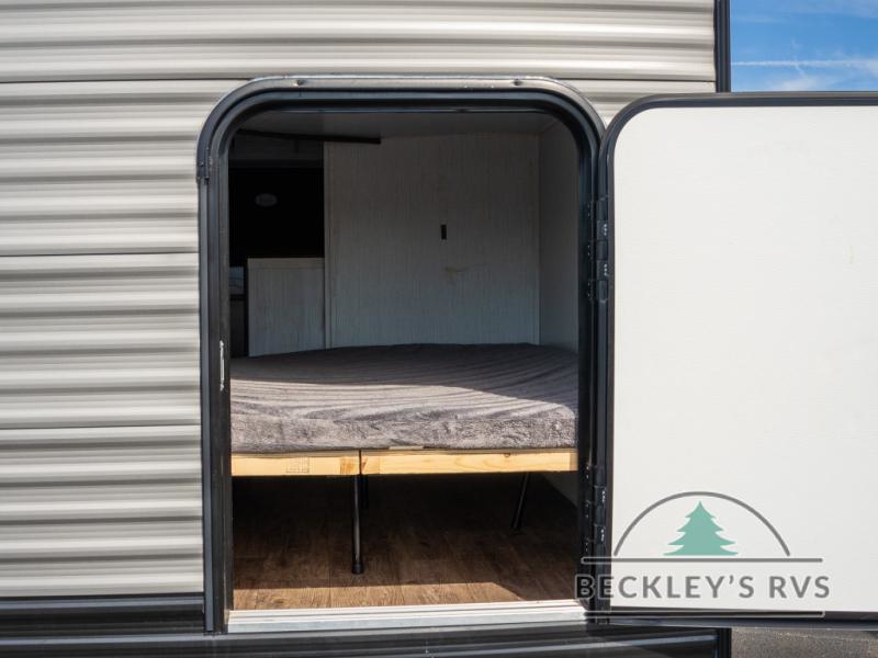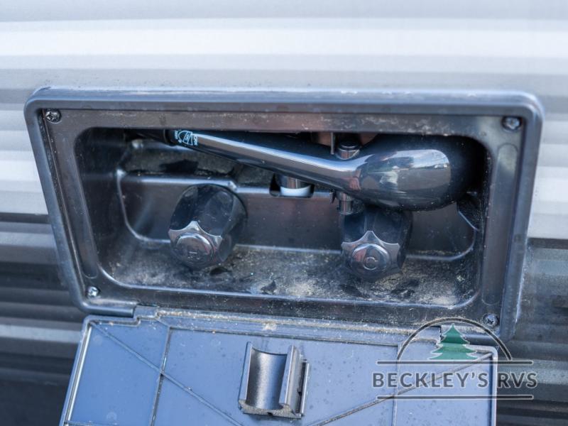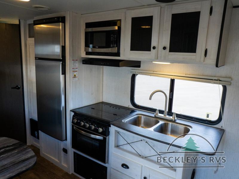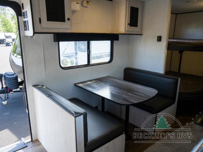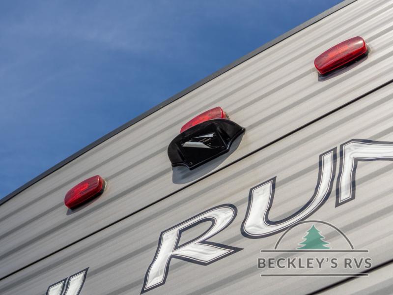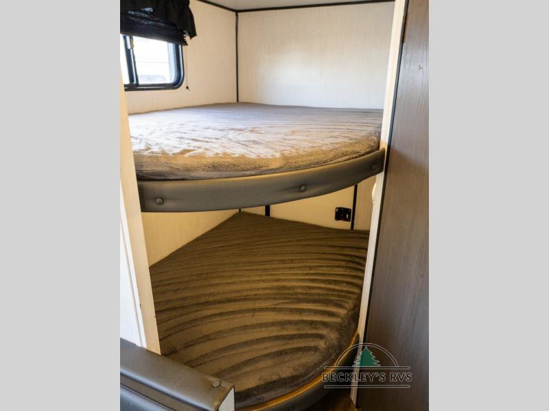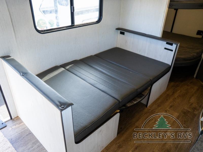 Pack your bags and hitch up this travel trailer for a fun family vacation! It features a set of double bunk beds and a front queen bed with a divider curtain to draw at night. You could even transform the booth dinette into an extra sleeping space when you aren't using it to enjoy a meal prepared with the three burner cooktop and 10 cu. ft. stainless steel refrigerator. Freshen up each morning in the rear corner bathroom with the ABS tub/shower surround and skylight above for added natural lighting as you get ready. Keep the dirt outdoors where it belongs with the outside shower and stay protected rain or shine by the power awning with LED light strip!
