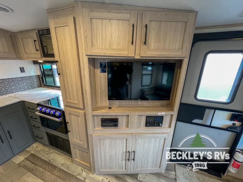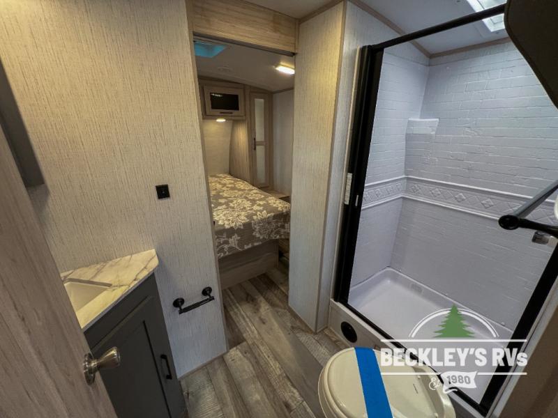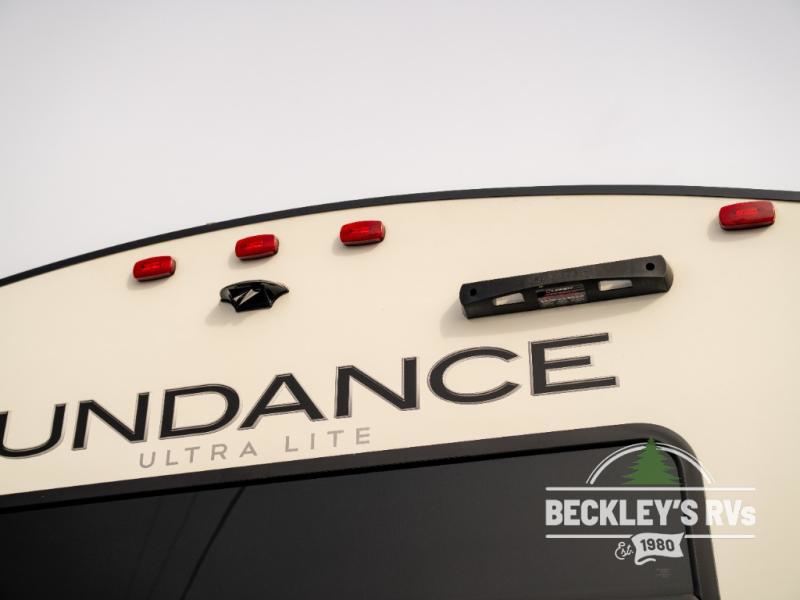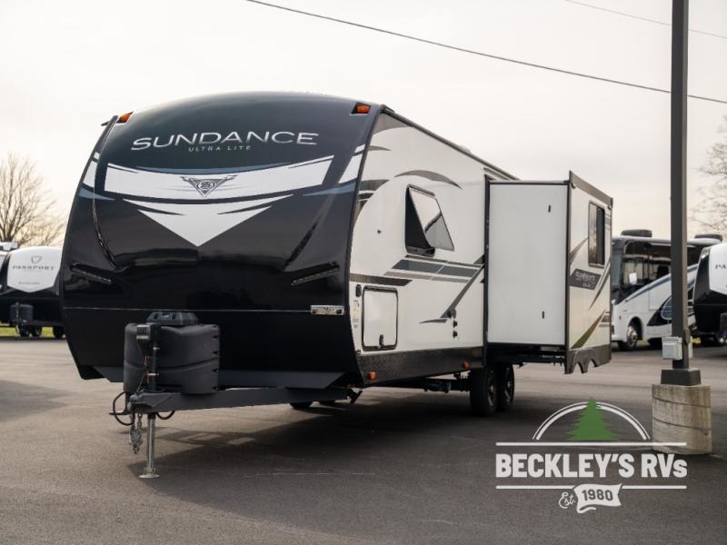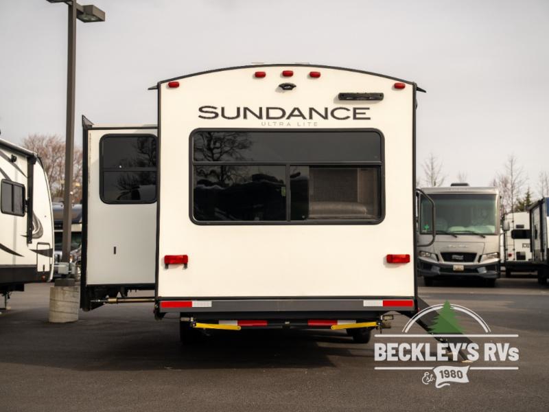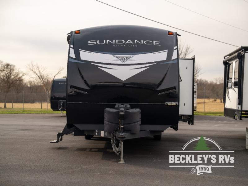 At the heart of every good vacation is this Sundance Ultra Lite travel trailer! You will love having easy access with two entry doors. These doors will allow you to directly enter the front private bedroom when you're outside, so you can come in to grab a sweater if you're getting chilly outside. The walk-through bathroom connects the bedroom to the rest of the trailer, and it offers you a skylight above the shower. The large slide holds the U-shaped and the 12V refrigerator, and it offers you more interior living space. The entertainment center is a great addition, and you can add the optional 39" LED TV.