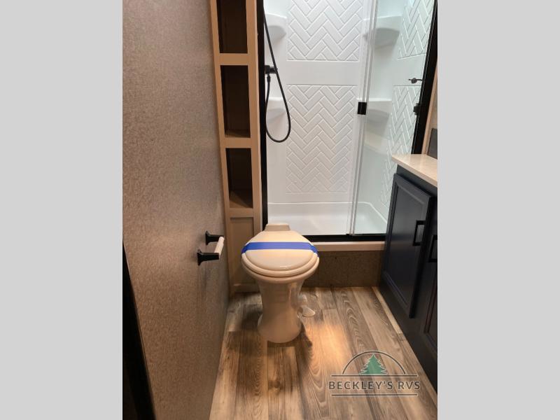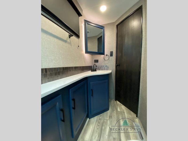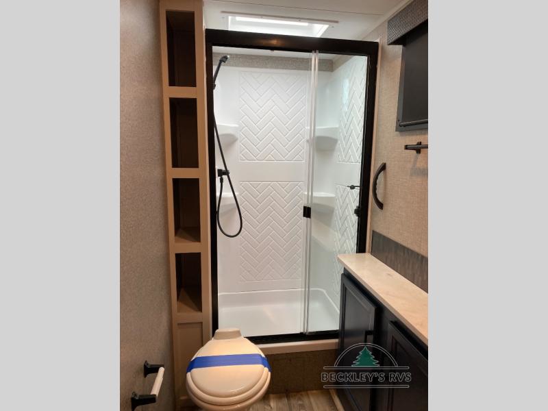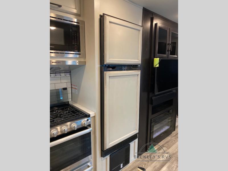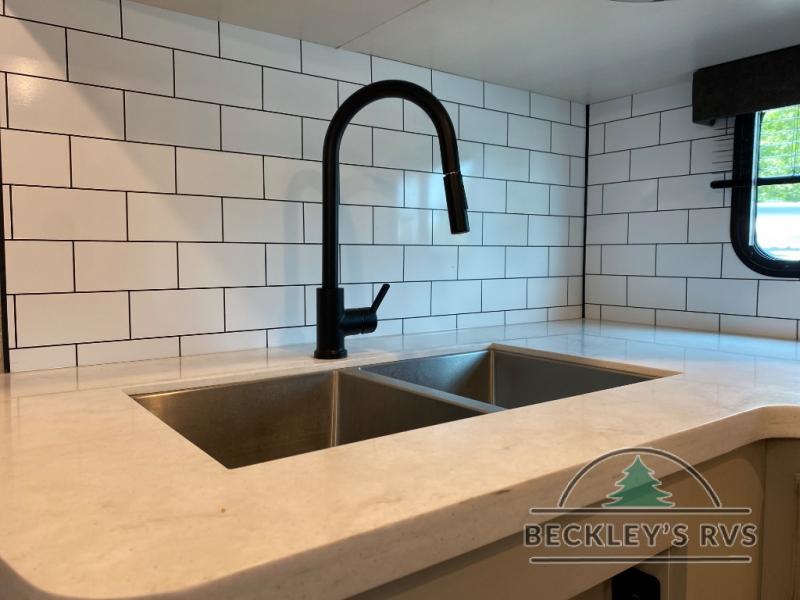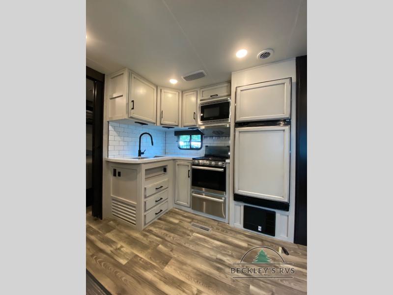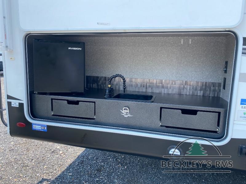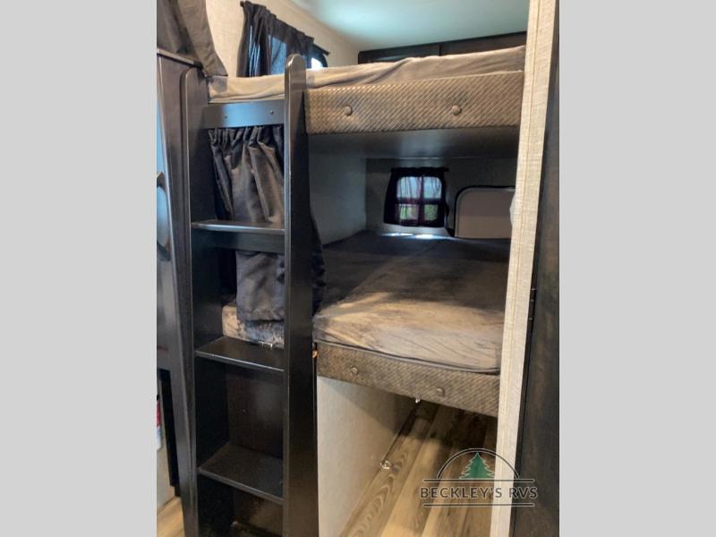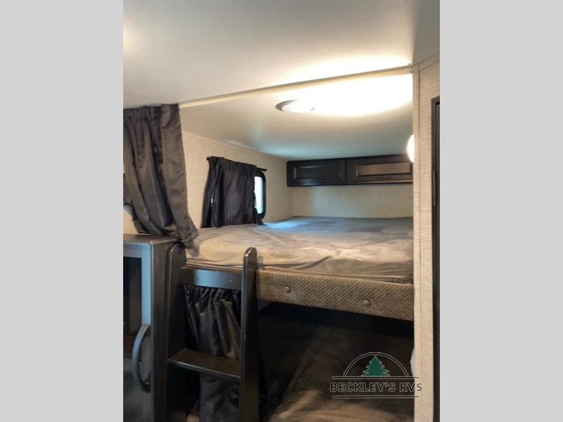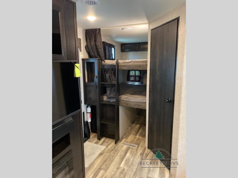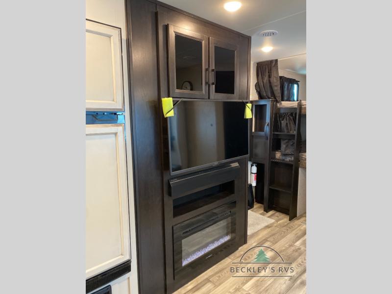 There's a lot to love about this travel trailer! From the set of 48" x 80" bunk beds with storage in the steps to the walk-in pantry behind the swing-out entertainment center with a fireplace for a cozy evening indoors. Everyone can freshen up in the rear corner bathroom with the shower, keep their towel close by with the linen closet, and have plenty of countertop space to get ready in the mornings. The tri-fold sofa and U-shaped dinette slide offer comfortable places to sit, dine, and play games, as well as transform into extra sleeping spaces. The front private bedroom has a queen bed with wardrobes on either side and another wardrobe to keep your clothes looking their best. You even have an outside kitchen to cook your meals at while watching others play a game of cornhole!