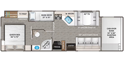 Planning a family vacation, a friend get-away or enjoy traveling with your partner? This coach offers a spacious interior thanks to the full-wall slide that stretches from behind the cab seats to the rear private bedroom. You can rest easy in your own queen bed with access to the double entry bathroom, your kids or guests will enjoy the bunk beds and cab over bunk to sleep on, plus the dream dinette and 68" jack-knife sofa offer even more sleeping space. And the kitchen amenities will impress anyone as they enter the mid-coach entrance. Everyone can watch the 40" TV over the cab that includes a swivel for the perfect view while visiting inside, or head outside to relax under the power awning with integrated LED lighting.