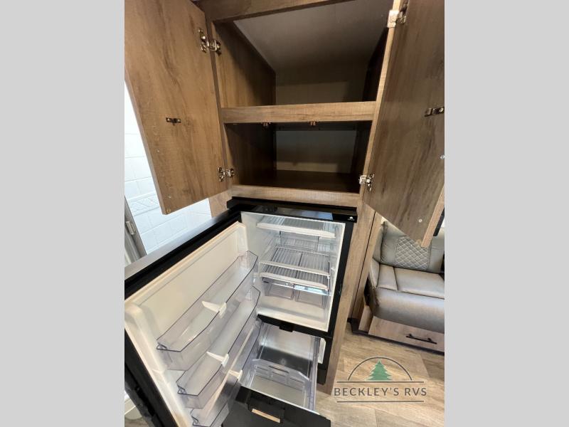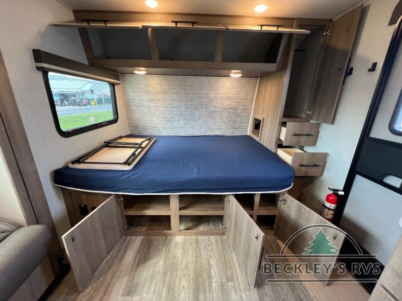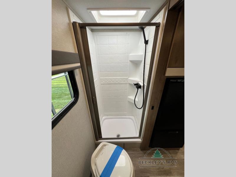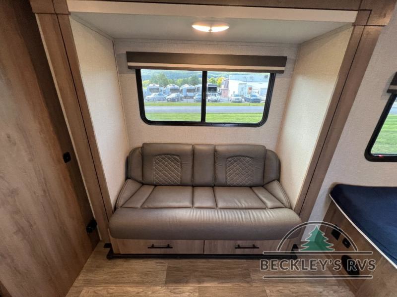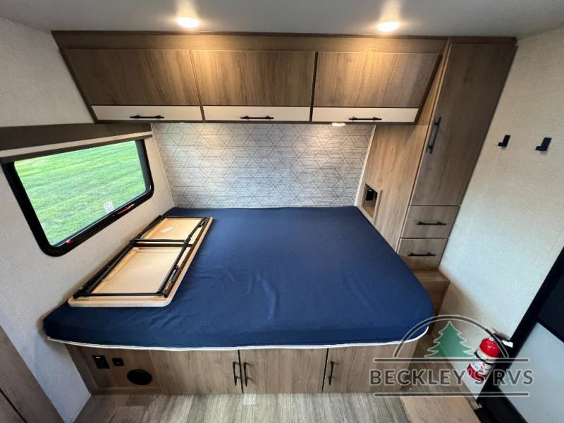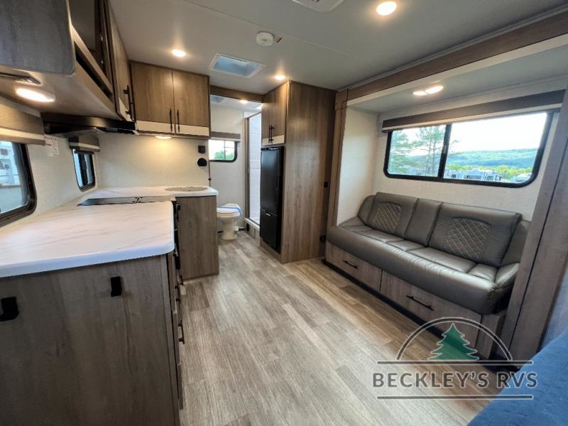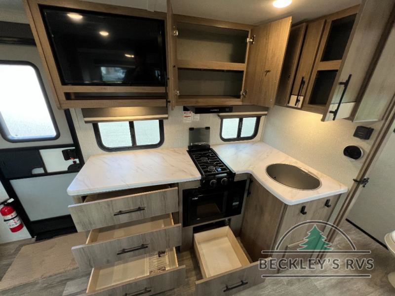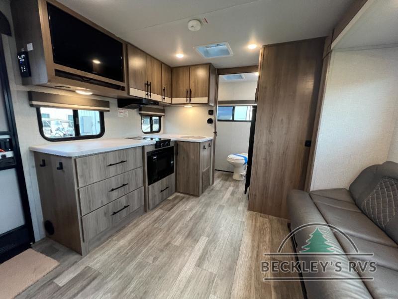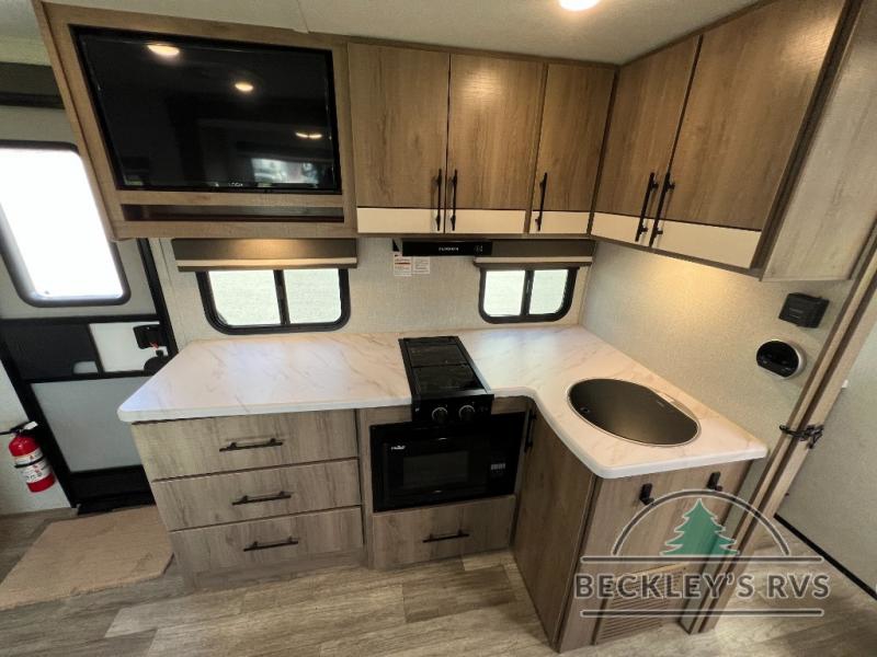 Pack your bags and head out on a fun camping trip in this travel trailer! The front queen bed offers a comfortable place to sleep at night, as well as the roll-over sleeper sofa slide. You can hang your jacket up on one of the coat hooks when you enter, and then start preparing a delicious meal on the two burner cooktop. You even have an outside griddle to fry up the catch of the day. The full rear bathroom has a walk-in shower with skylight to freshen up in and overhead cabinets for your toiletries!