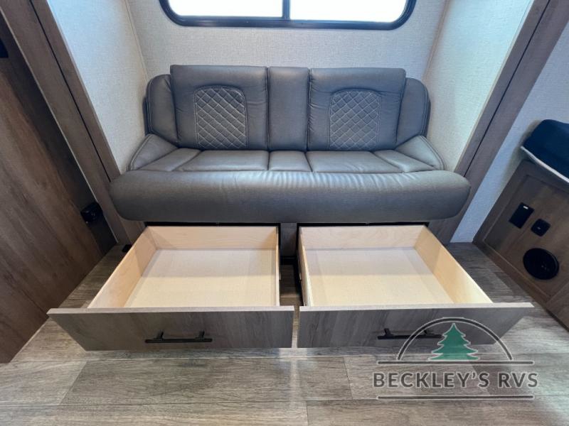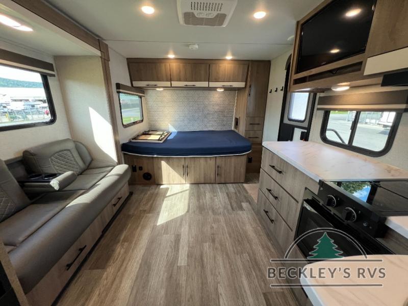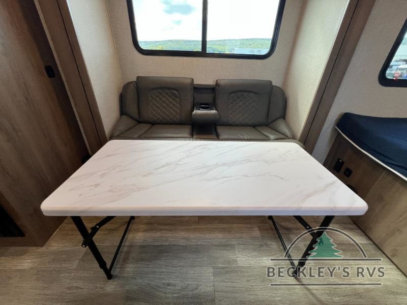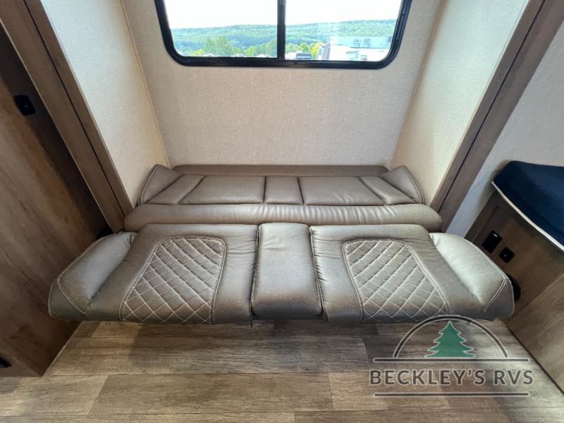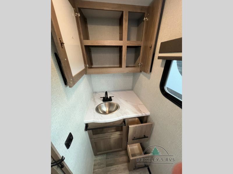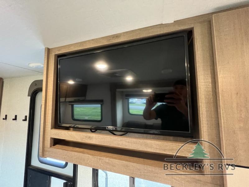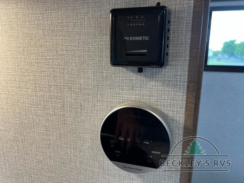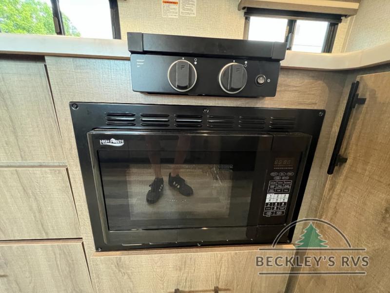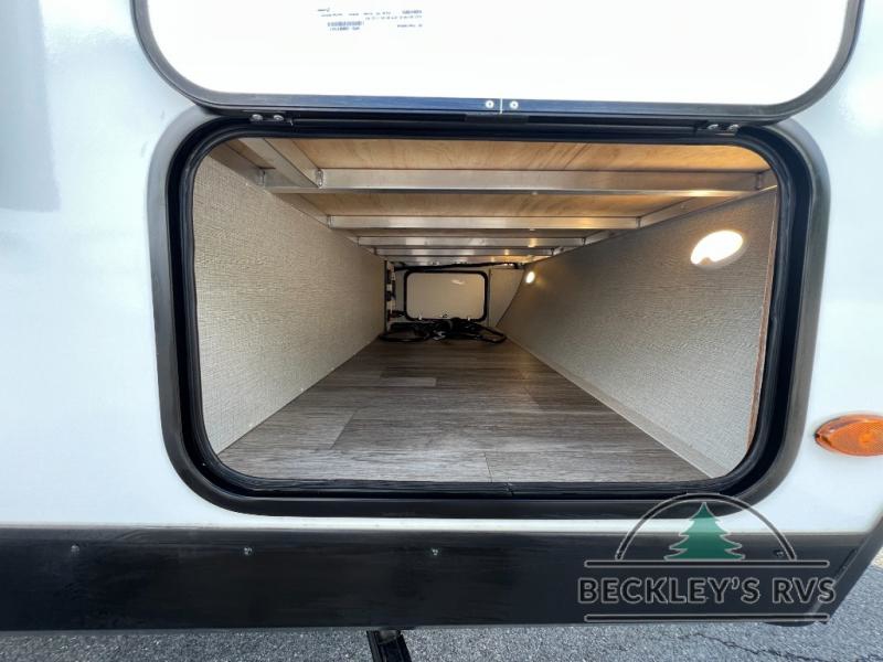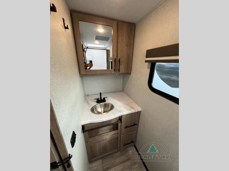 Pack your bags and head out on a fun camping trip in this travel trailer! The front queen bed offers a comfortable place to sleep at night, as well as the roll-over sleeper sofa slide. You can hang your jacket up on one of the coat hooks when you enter, and then start preparing a delicious meal on the two burner cooktop. You even have an outside griddle to fry up the catch of the day. The full rear bathroom has a walk-in shower with skylight to freshen up in and overhead cabinets for your toiletries!