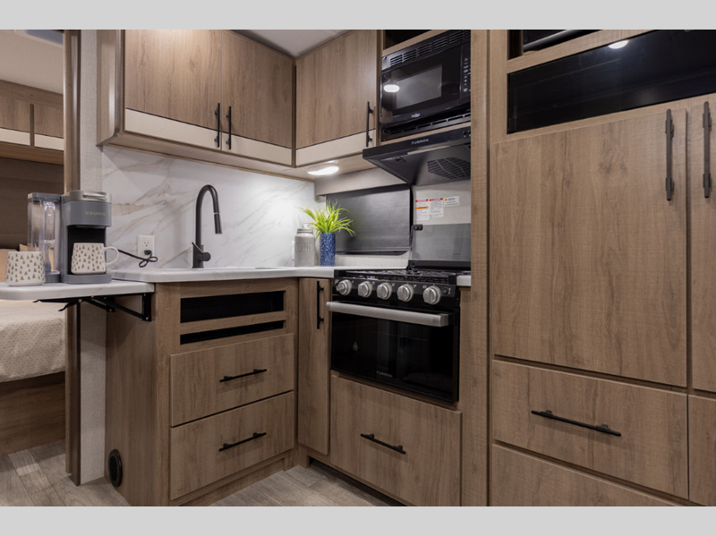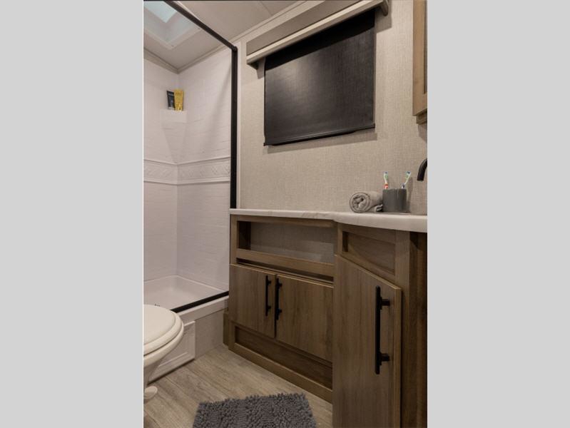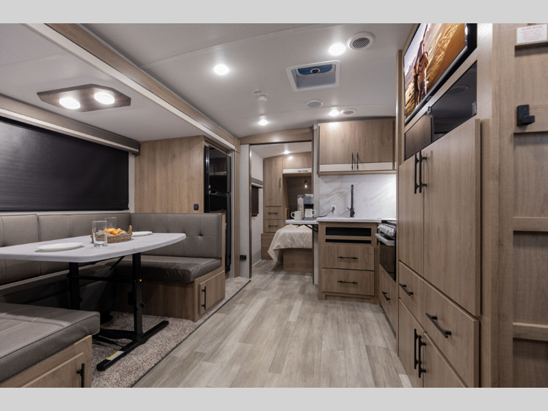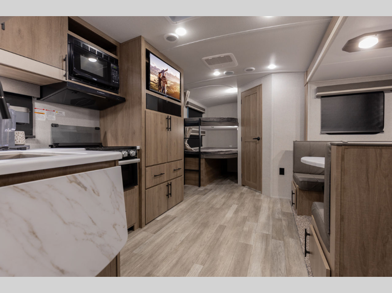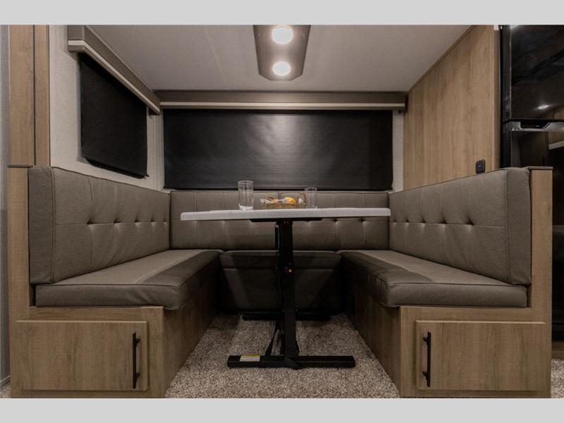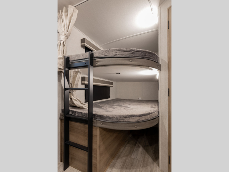 Just imagine what you can do with this Imagine travel trailer! You'll have a U-shaped dinette with removable ottoman so that you can relax in true comfort. The kitchen sits across from the dinette and includes a flip-up countertop extension for more prep space. The private bedroom includes a 60" x 80" queen bed with overhead cabinets and closets on either side of the bed, and the 47" x 76" bunks have privacy curtains that you can close to create a private sleeping area. You'll love having your own bathroom with 30" x 36" shower and skylight so that you don't have to wait in line to use the campsite's facilities, and you can head outside anytime to create a delicious meal at the outdoor griddle with nearby 1.6 cu. ft. refrigerator.