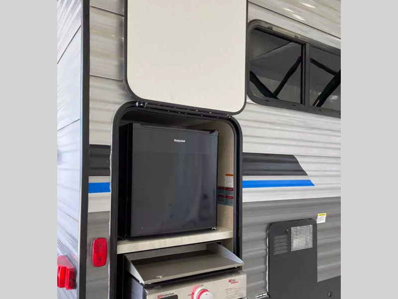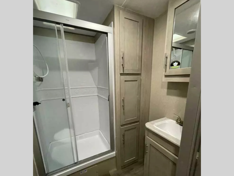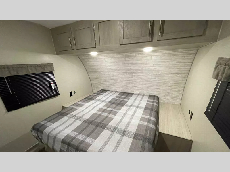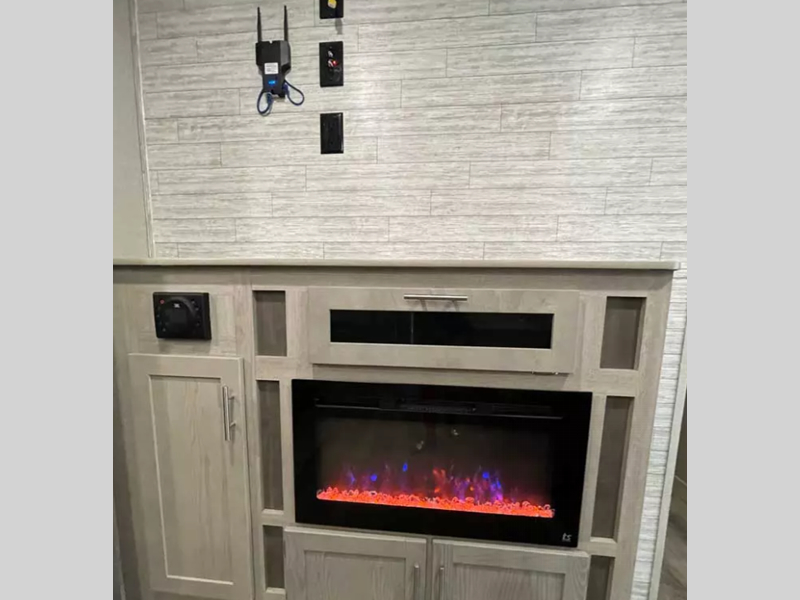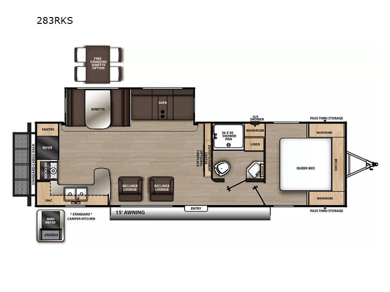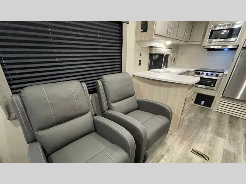 Whether you camp to relax indoors or play outdoors, this trailer offers interior comforts for a couple or a family of four! From the spacious rear kitchen thanks to the large slide out that includes a booth dinette and sofa. Yet you might like to choose the free standing dinette option in place of the booth dinette. The U-shaped counter offers plenty of space to dry dishes and prep meals. There is a 10 cu. ft. refrigerator and pantry for food storage, and everyone can enjoy the entertainment center with a fireplace option below while cooking, cleaning, dining and relaxing. And the recliner lounges will probably be popular seats. At night head to the front bedroom to sleep on the walk-around king bed after stopping off at the full bathroom to get cleaned up.