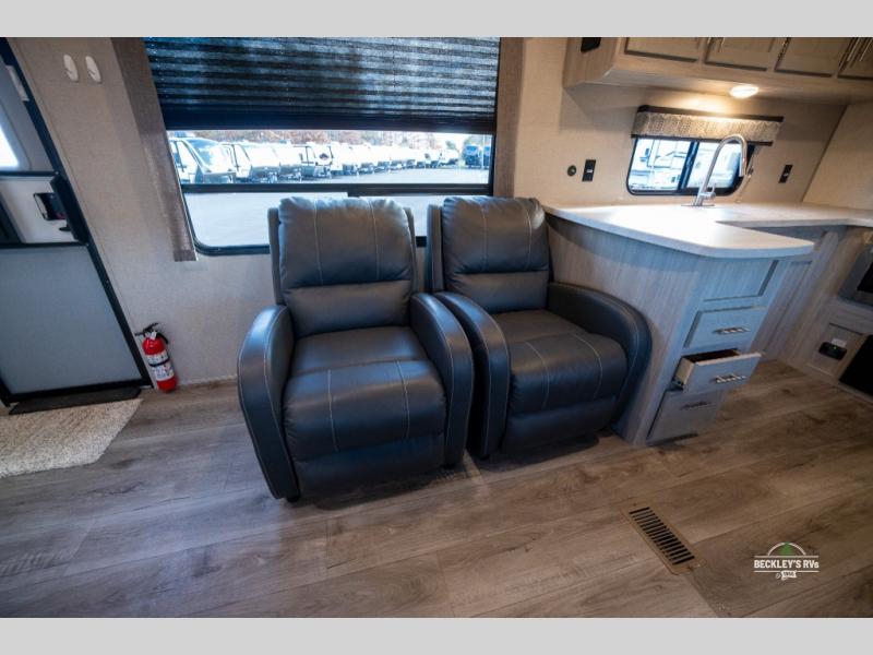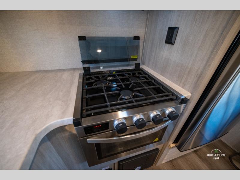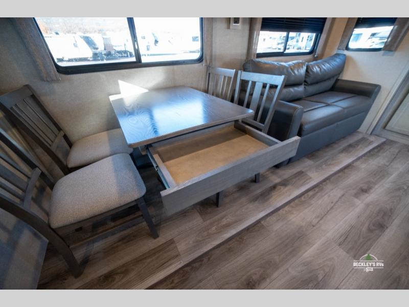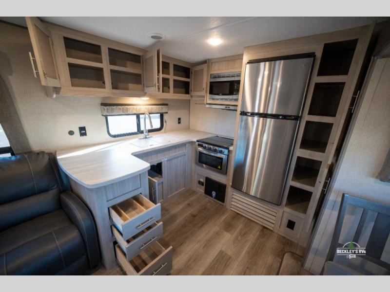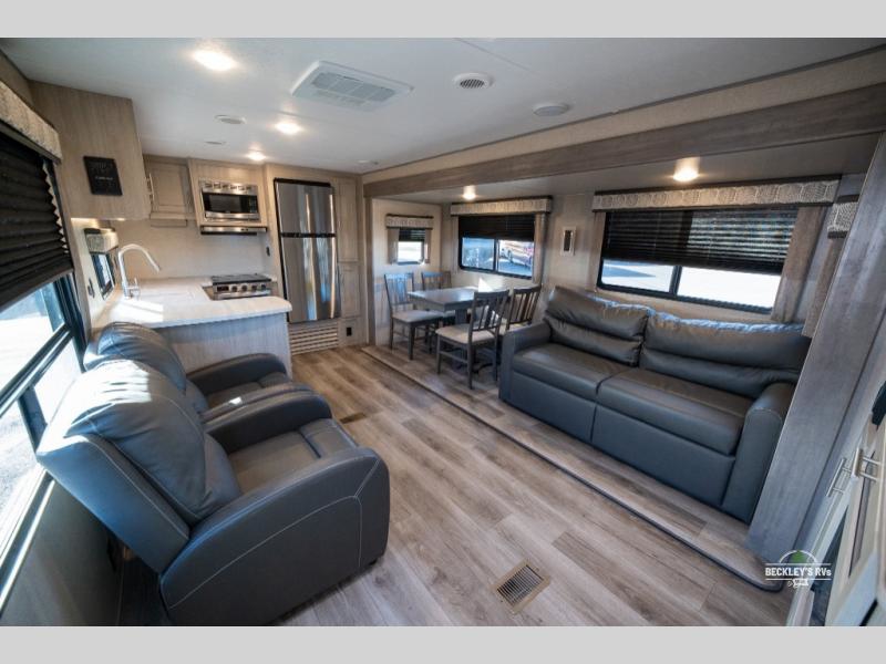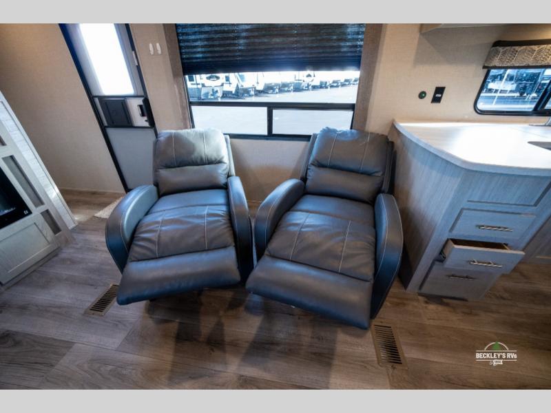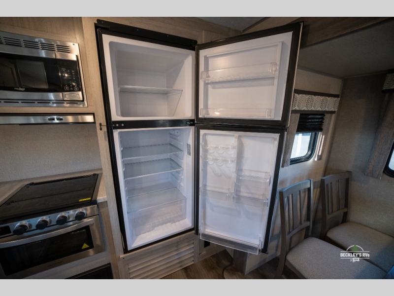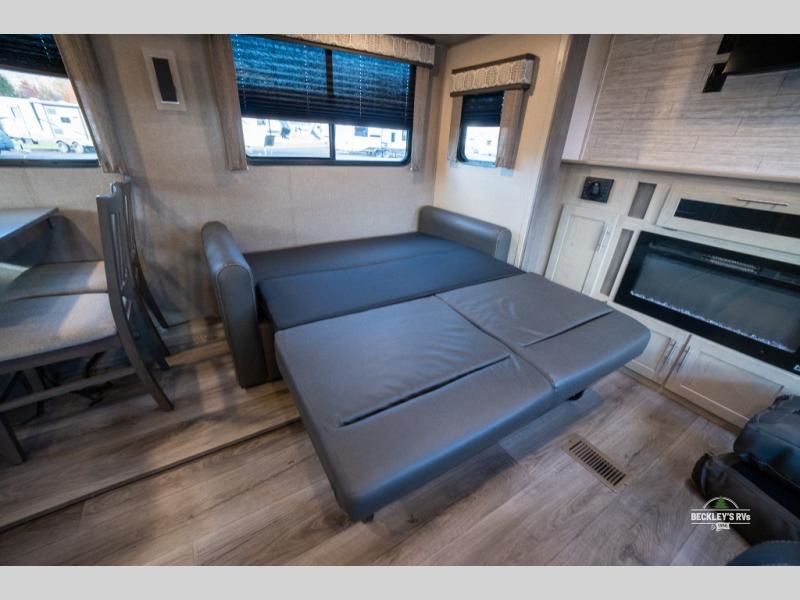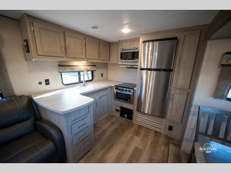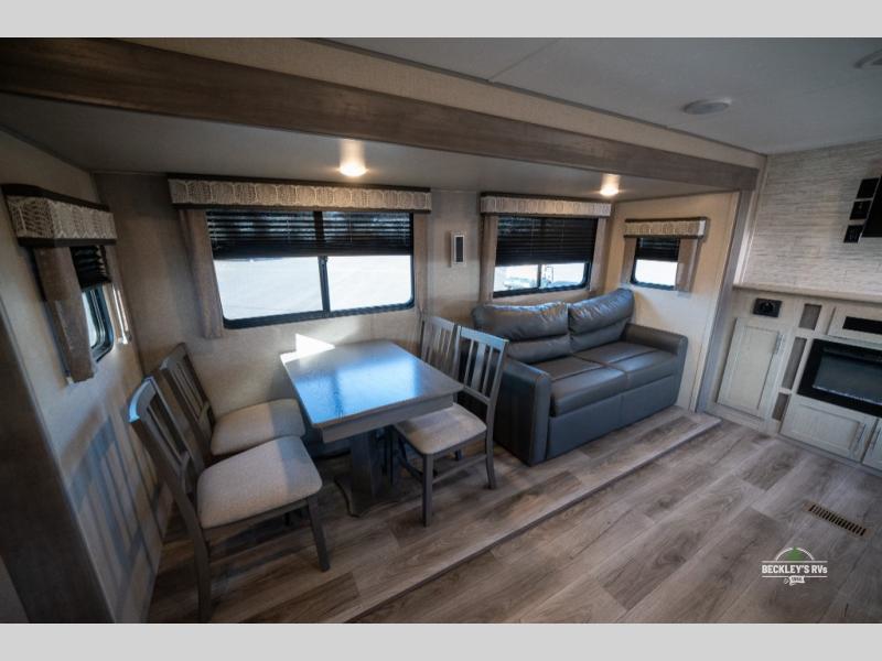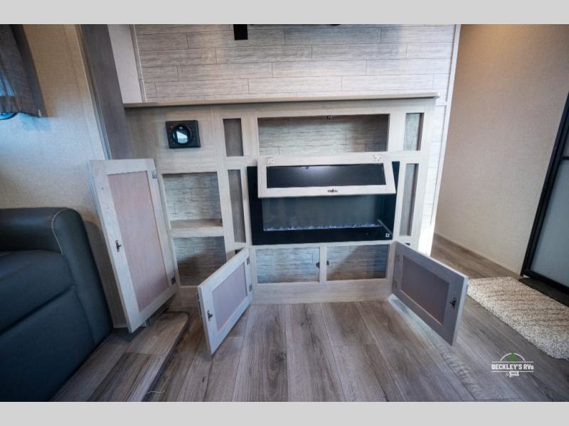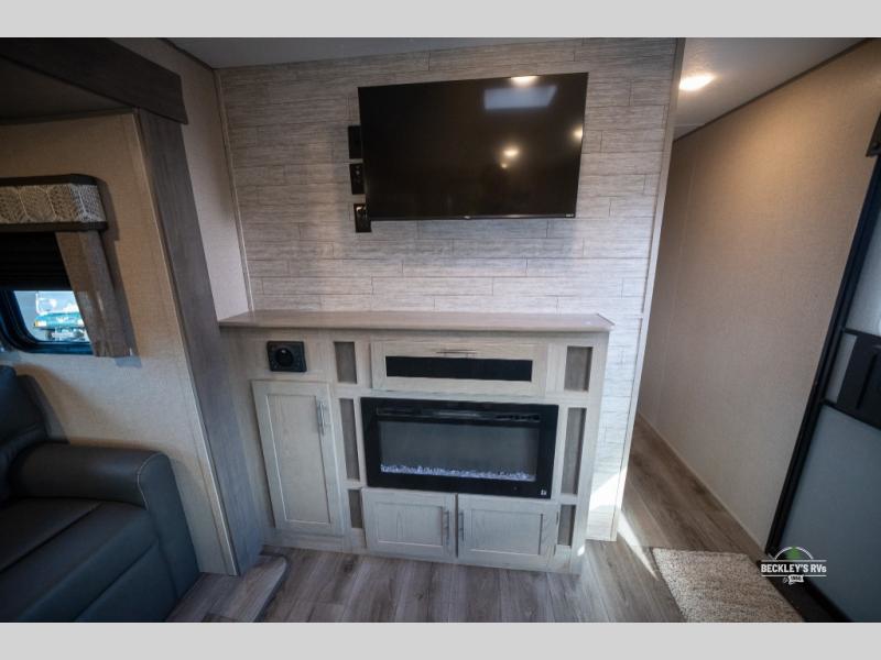 Whether you camp to relax indoors or play outdoors, this trailer offers interior comforts for a couple or a family of four! From the spacious rear kitchen thanks to the large slide out that includes a booth dinette and sofa. Yet you might like to choose the free standing dinette option in place of the booth dinette. The U-shaped counter offers plenty of space to dry dishes and prep meals. There is a 10 cu. ft. refrigerator and pantry for food storage, and everyone can enjoy the entertainment center with a fireplace option below while cooking, cleaning, dining and relaxing. And the recliner lounges will probably be popular seats. At night head to the front bedroom to sleep on the walk-around king bed after stopping off at the full bathroom to get cleaned up.