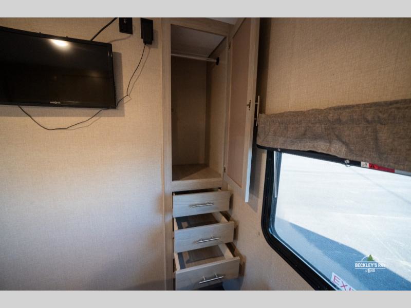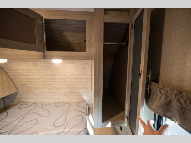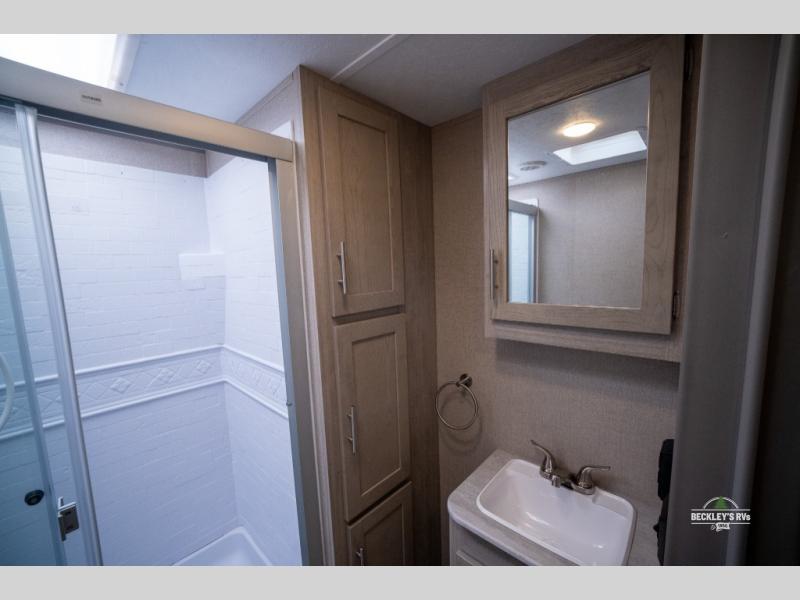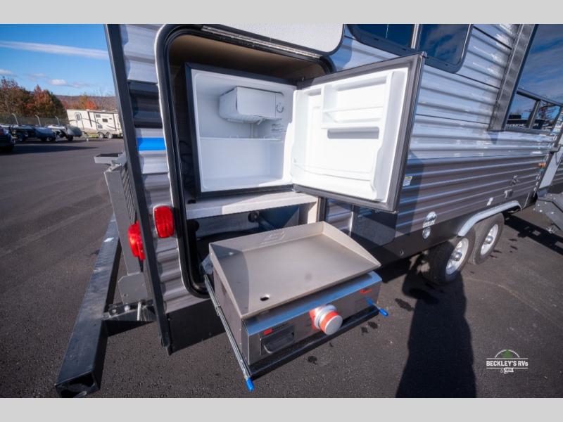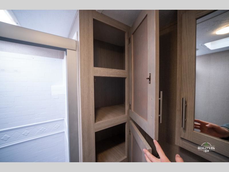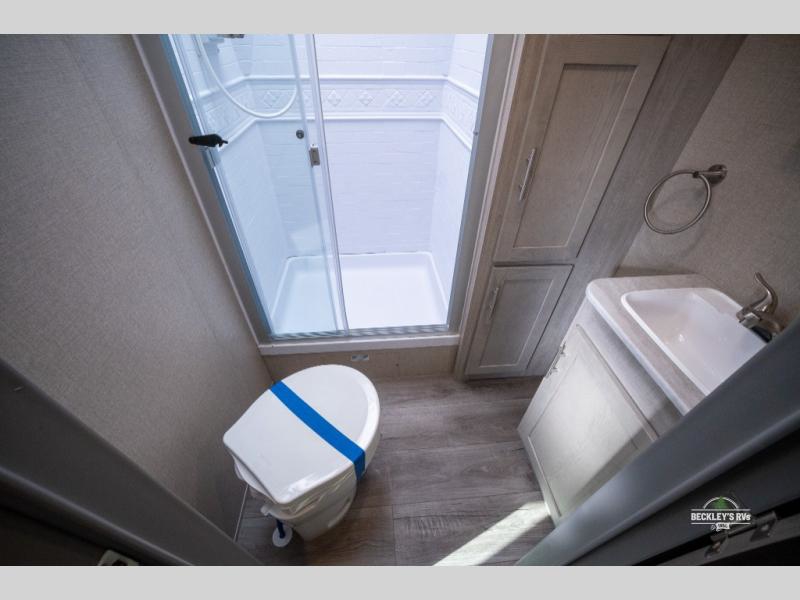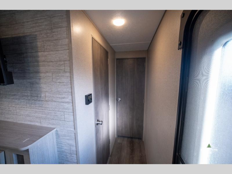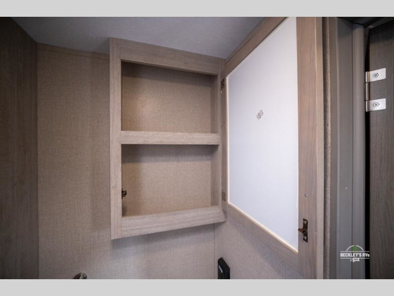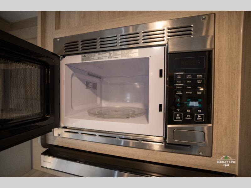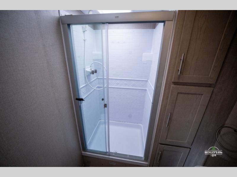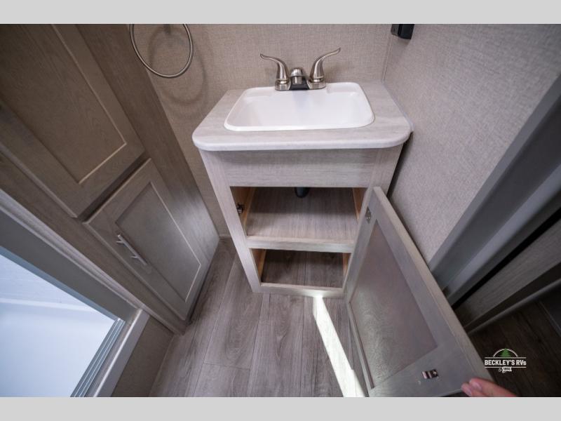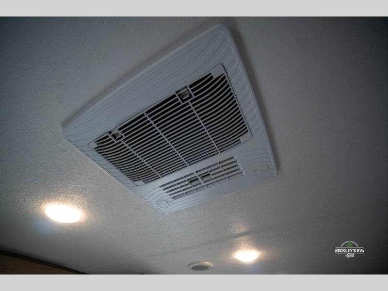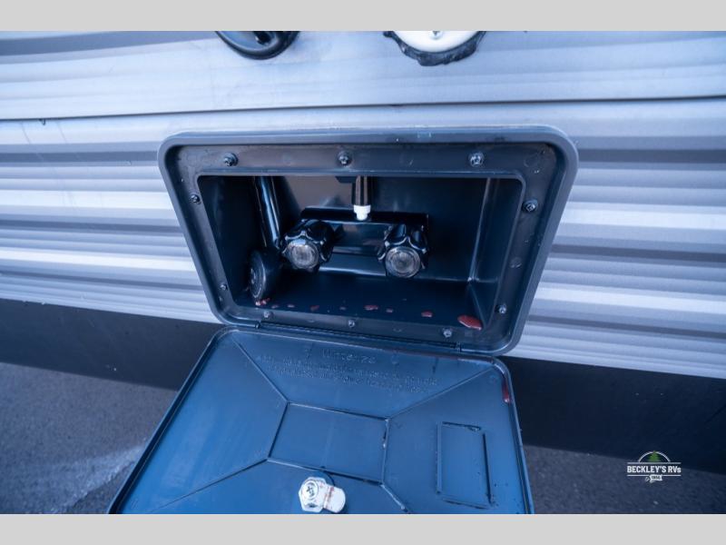 Whether you camp to relax indoors or play outdoors, this trailer offers interior comforts for a couple or a family of four! From the spacious rear kitchen thanks to the large slide out that includes a booth dinette and sofa. Yet you might like to choose the free standing dinette option in place of the booth dinette. The U-shaped counter offers plenty of space to dry dishes and prep meals. There is a 10 cu. ft. refrigerator and pantry for food storage, and everyone can enjoy the entertainment center with a fireplace option below while cooking, cleaning, dining and relaxing. And the recliner lounges will probably be popular seats. At night head to the front bedroom to sleep on the walk-around king bed after stopping off at the full bathroom to get cleaned up.