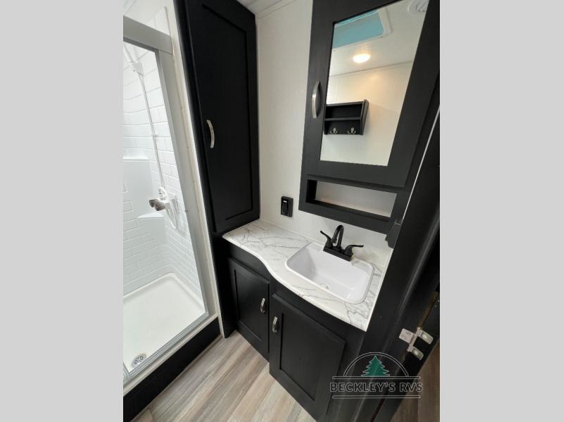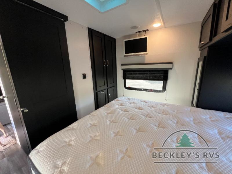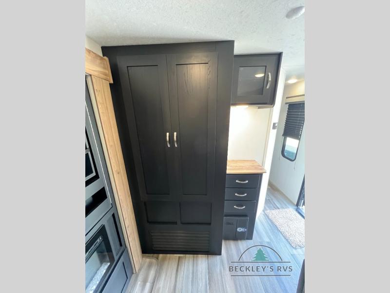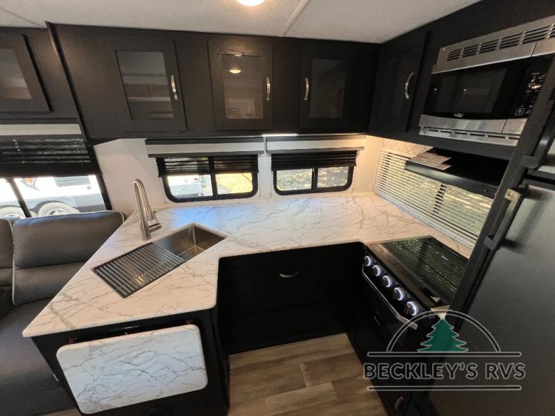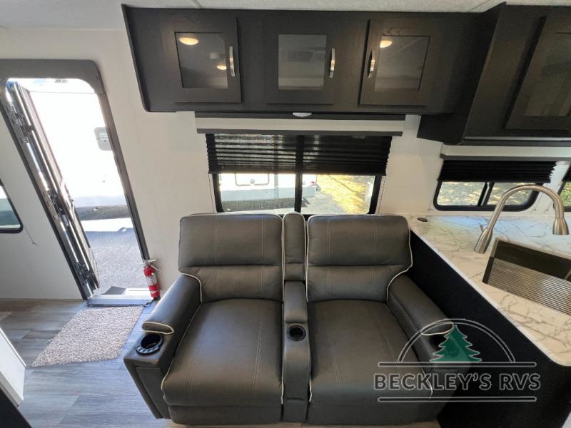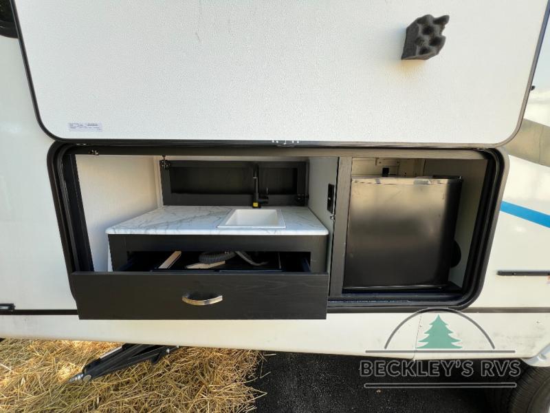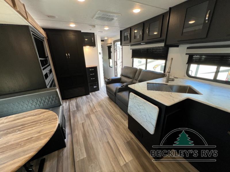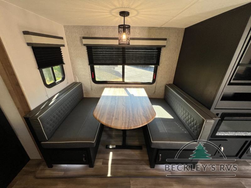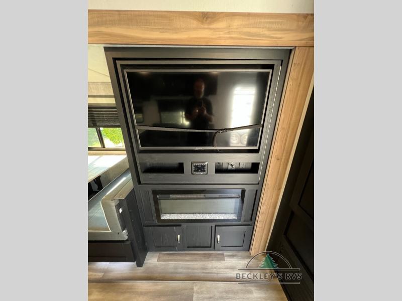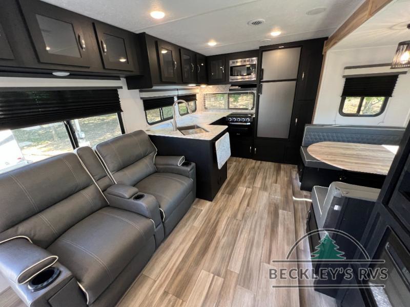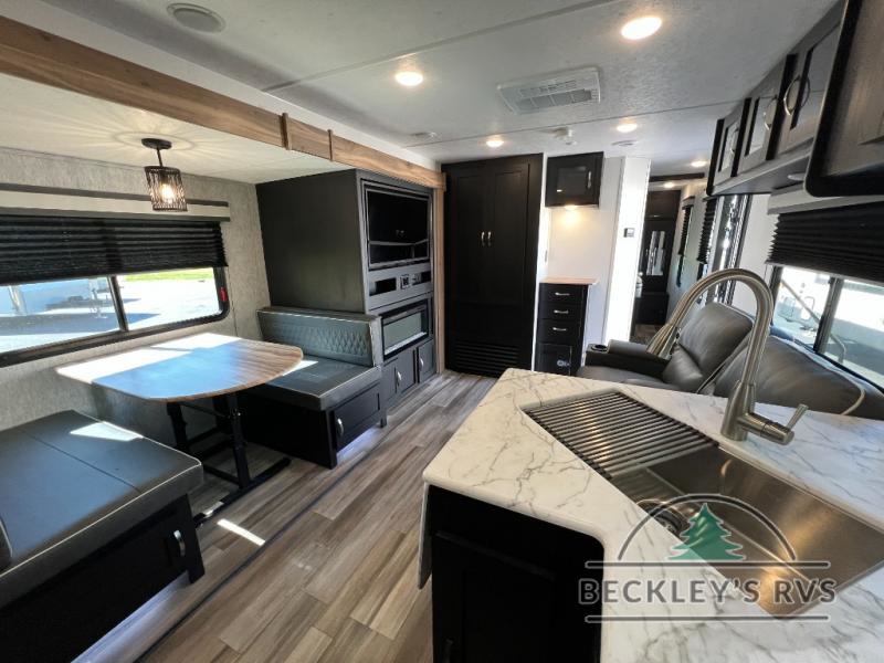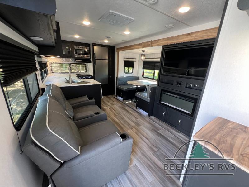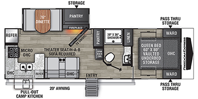 Are you looking for a travel trailer that will feel more like home? Look no further than this model that features a private bedroom up front, a full bath, plus a spacious rear kitchen. You will love to relax on the theatre sofa/hide-a-bed sofa across from the LED TV and fireplace, and there is a booth dinette for dining. If the weather is nice you may just want to sit outdoors under the 20' power awning with LED lights. The chef of your group can prepare a meal on the pull-out camp kitchen, and the kids can grab their scooters from the pass-through storage.