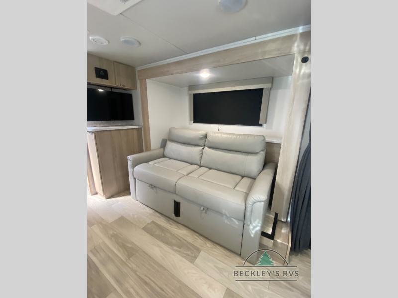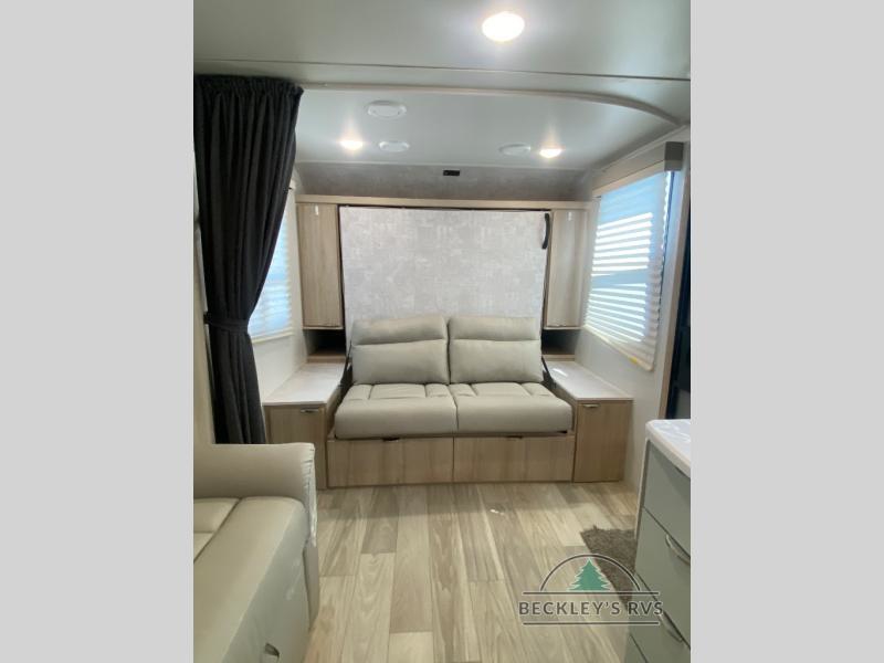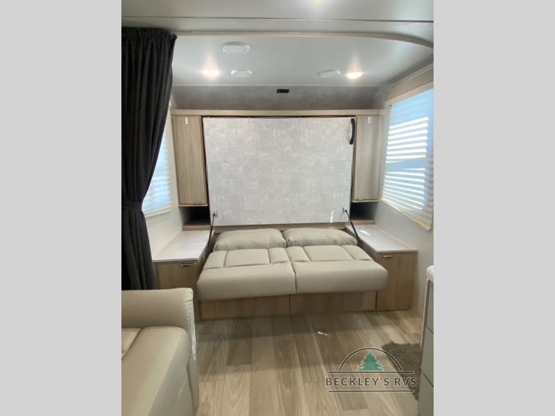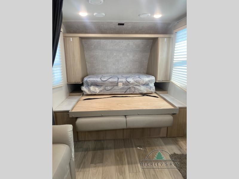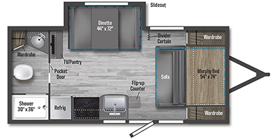 If you're looking for versatility then you need this travel trailer! Depending on the time of day you enter will determine whether you see the Murphy bed or the sofa up front. A slide out 44" x 72" booth dinette can be used for dining, playing games, and sleeping space at night. The full rear bathroom is equipped with everything you will need to freshen up each morning and features a wardrobe for your clothing and linens, and a pocket door into the bath saves space in the main room. The LED TV is conveniently located so you can watch your favorite shows from the sofa or Murphy bed as well as the dinette, plus the pantry offers a place to store your snacks and such for easy access. The cook in your bunch will love all the amenities to make meals including the handy flip-up counter for more prep space.