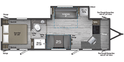 You're going to love this spacious travel trailer thanks to the tri-fold sofa slide out! There are convenient dual entry doors so you can enter in through the rear master bedroom or the front kitchen. The chef of your group is sure to appreciate ample counter space to prep meals, plus a pantry and 10.3 cu. ft. 12V refrigerator for food storage. Your crew can dine at the booth dinette or take your plate outdoors to sit under the 21' power awning with LED lights. Clean up in the walk-through bath before retreating to your queen bed in the rear bedroom, while your guests sleep on the furniture in the main living area!