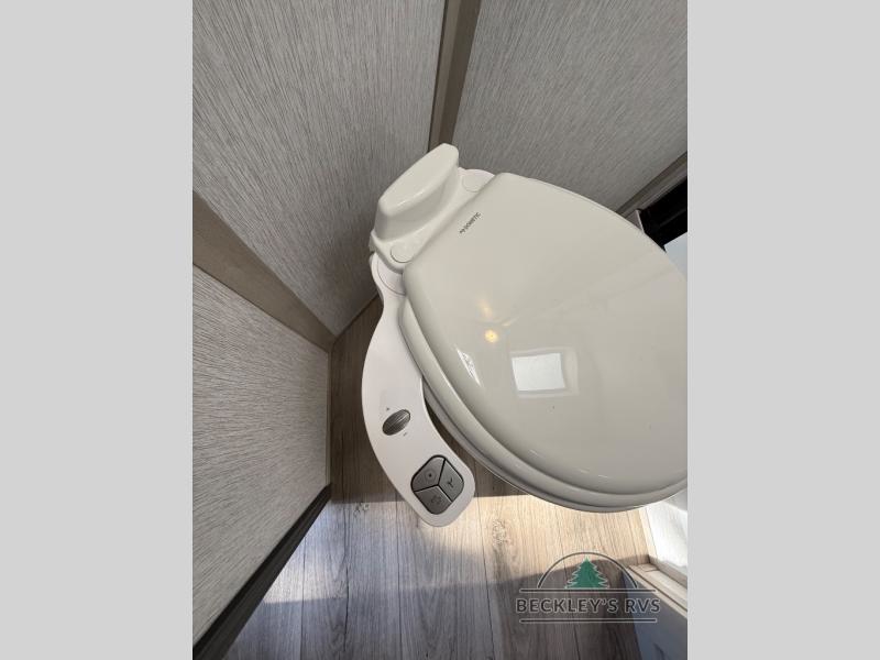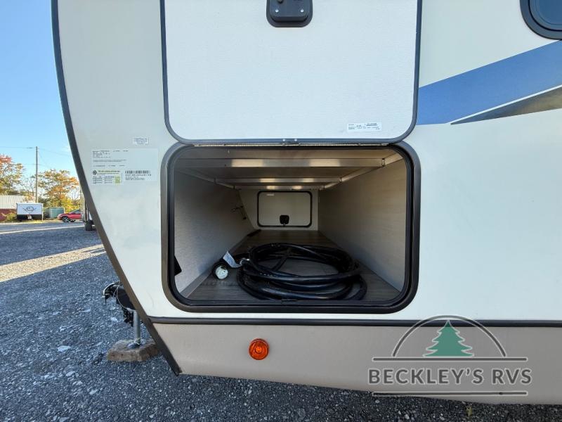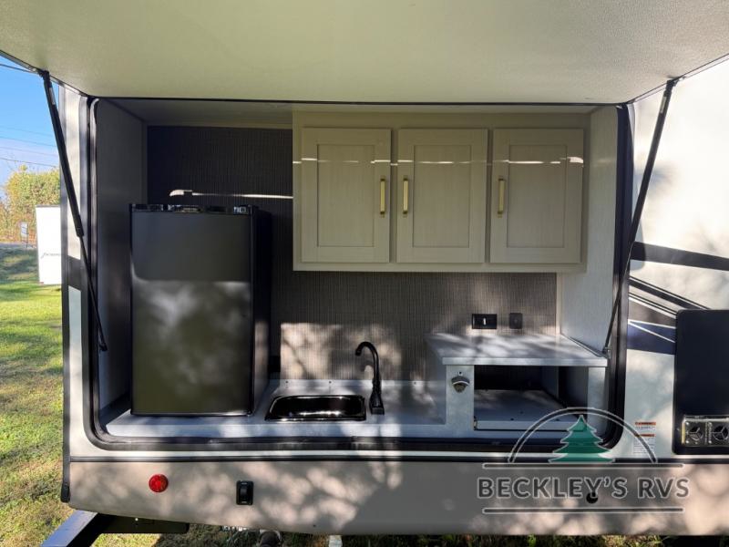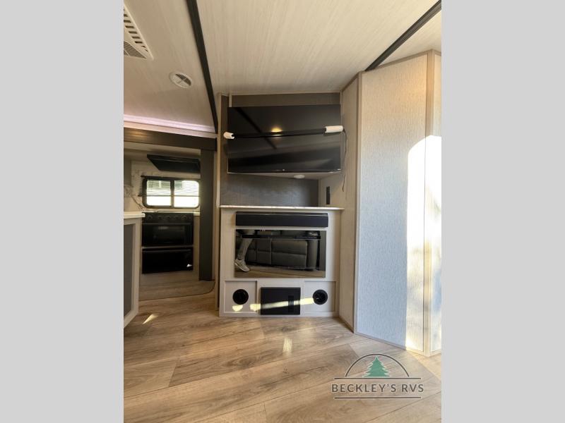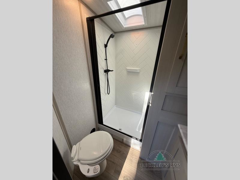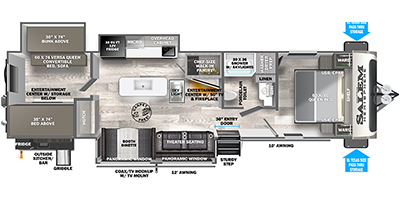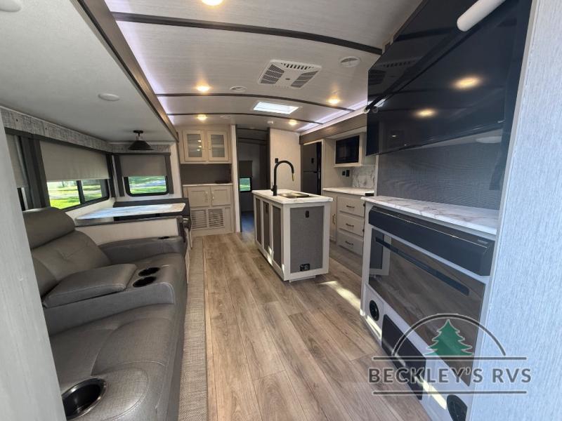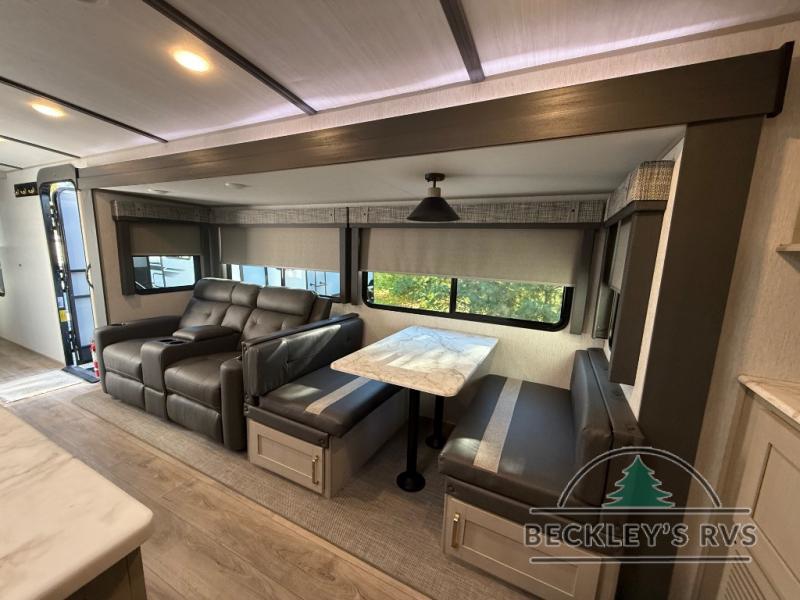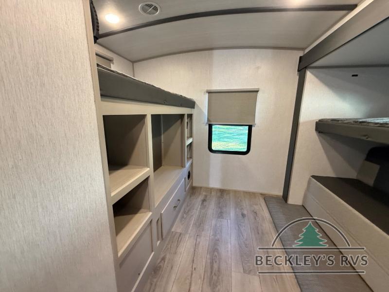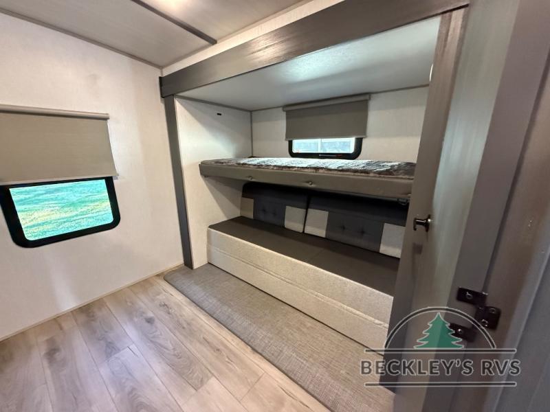 Your kids or friends are going to love camping in this travel trailer! It features a rear private bunkhouse with a bunk above a Versa queen convertible bed/sofa plus an additional bunk above an entertainment center with storage below. Just outside the bunkhouse is the kitchen with a 10 cu. ft. 12V black refrigerator, a microwave, a kitchen island, and a chef-sized walk-in pantry big enough to store everyone's favorite snacks. The booth dinette and the theatre seating are right next to panoramic windows so you can enjoy looking out at your beautiful scenery. You will also love taking a hot, steamy shower in the 30" x 36" shower with skylights and get a good night's rest on the queen bed with Versa Tilt in the front private bedroom!