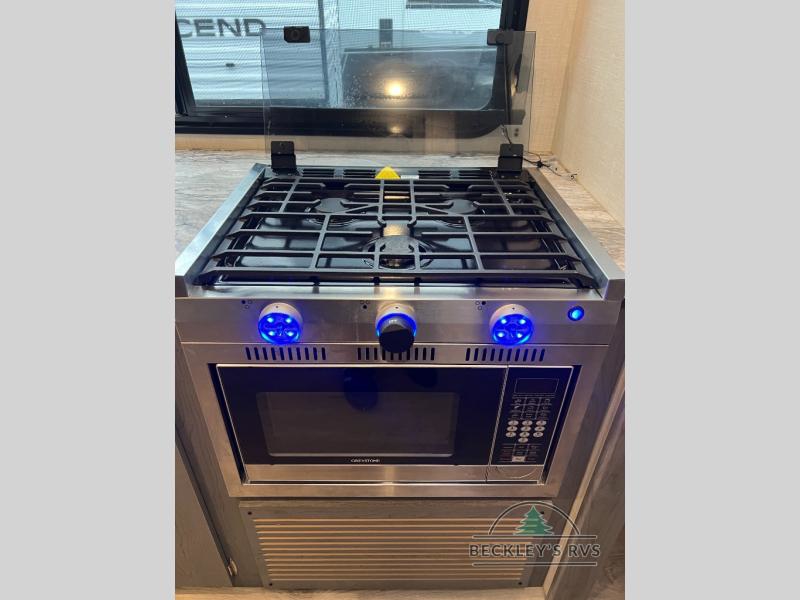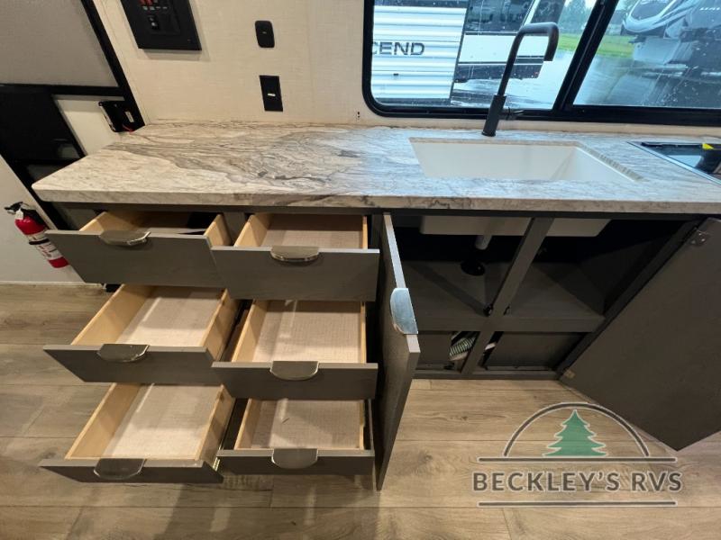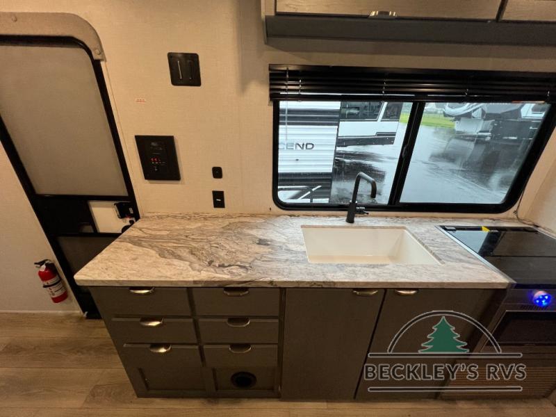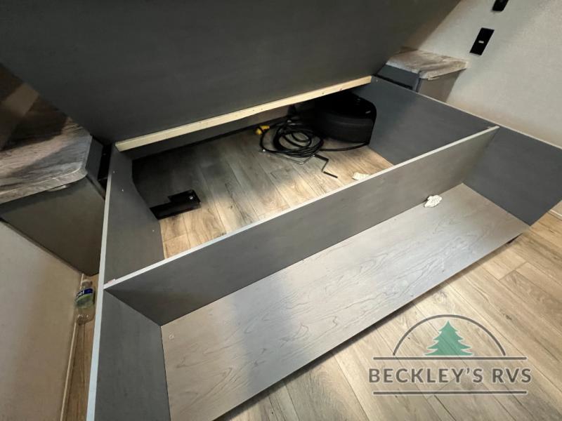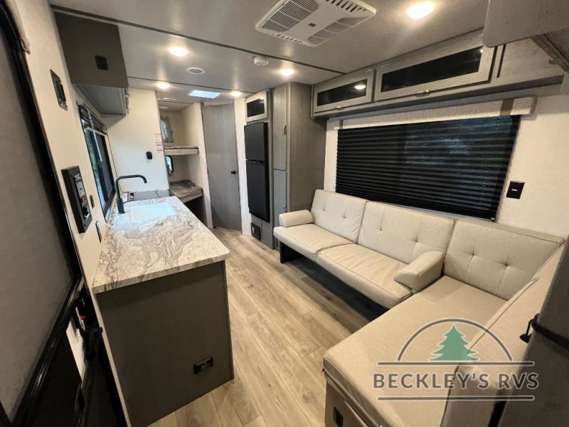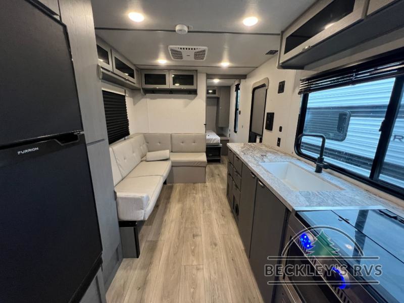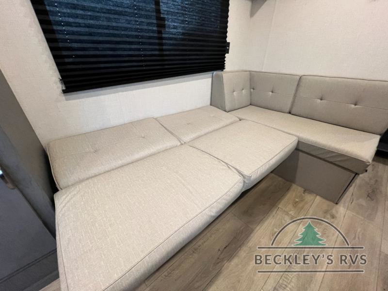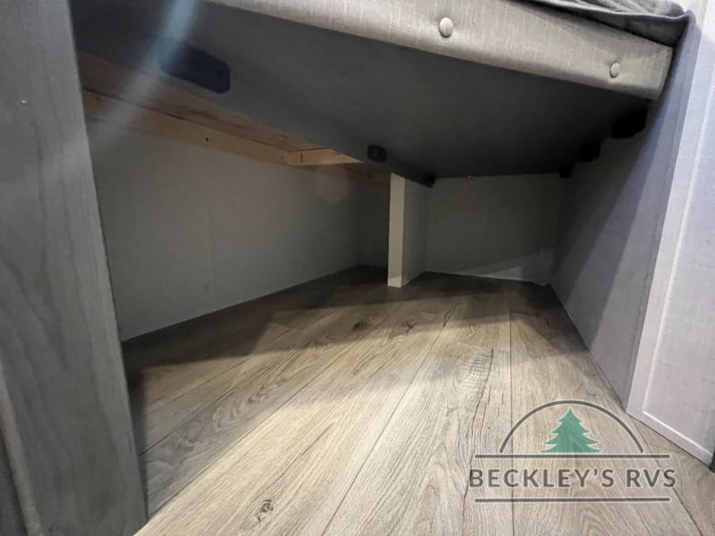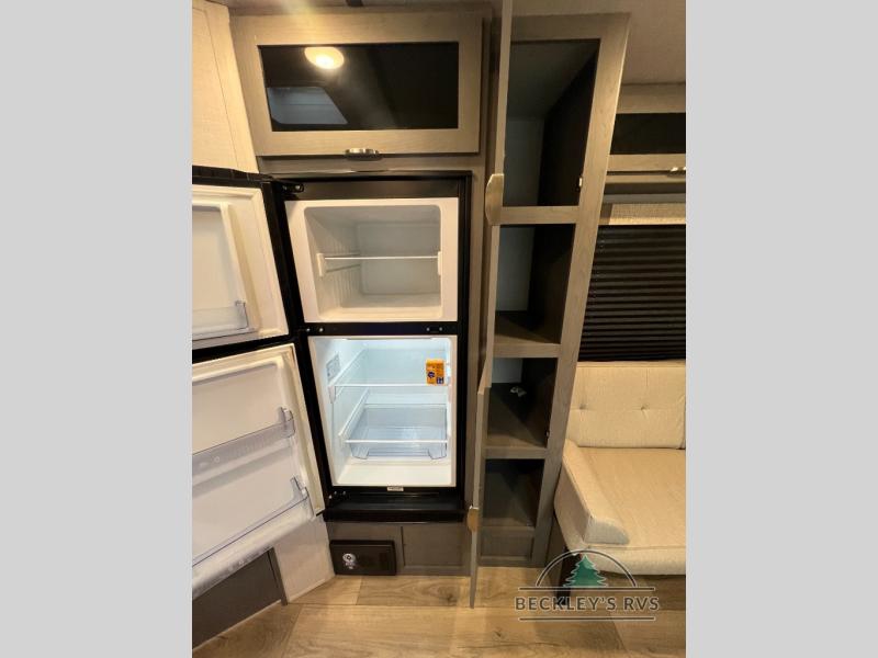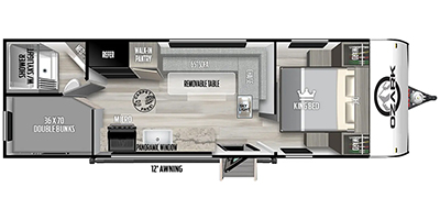 This Limited Edition model resembles the layout of 2300RBLE, but you'll enjoy added double-size bunks in the rear corner, with a full bath in the other rear corner! You'll have the front private bedroom all to yourselves with a king bed and dual wardrobes, and other guests can sleep on the L-shaped sofa with a chaise when it's not being used to relax on. The kitchen on this Ozark includes a two burner cooktop with a glass top, a microwave oven, and a panoramic window by the sink so you can have open views as you clean up. There is also a walk-in pantry and an 8 cu. ft. refrigerator that is 128% larger than normal!