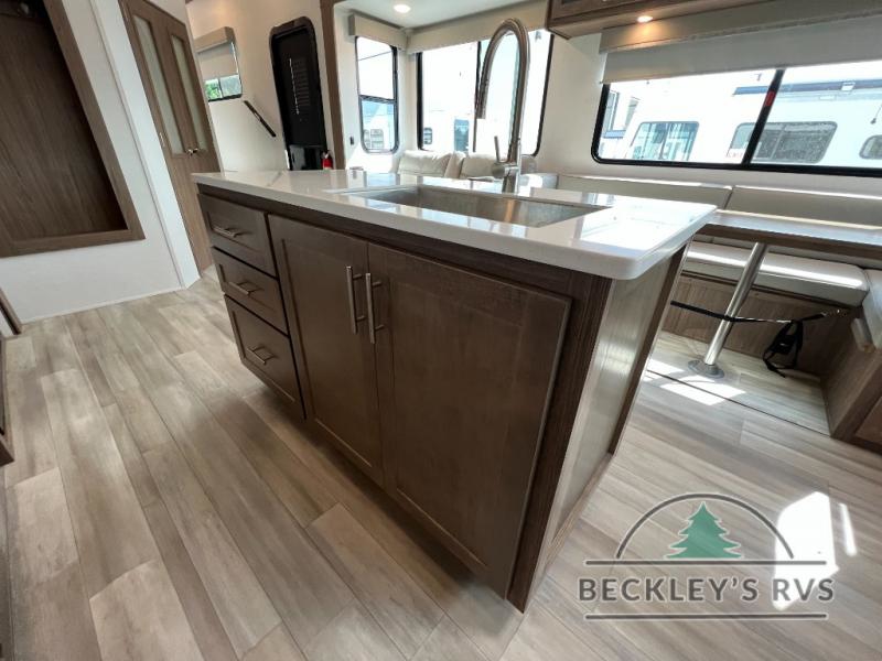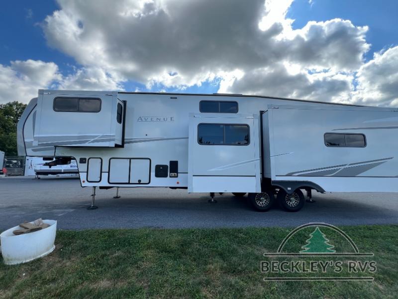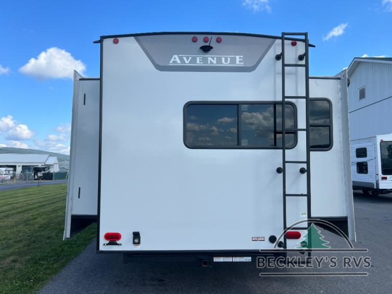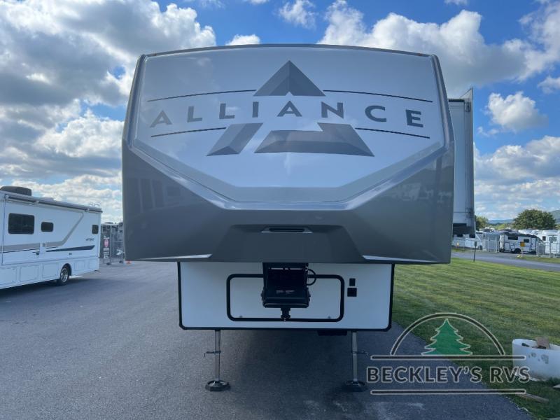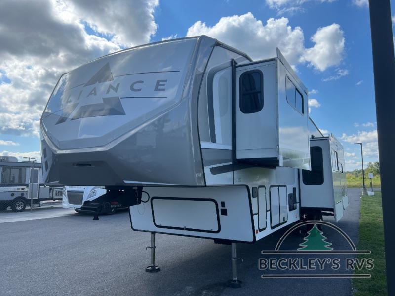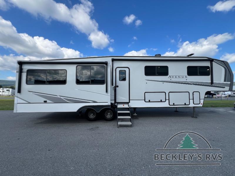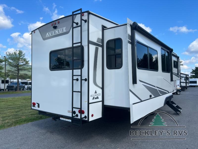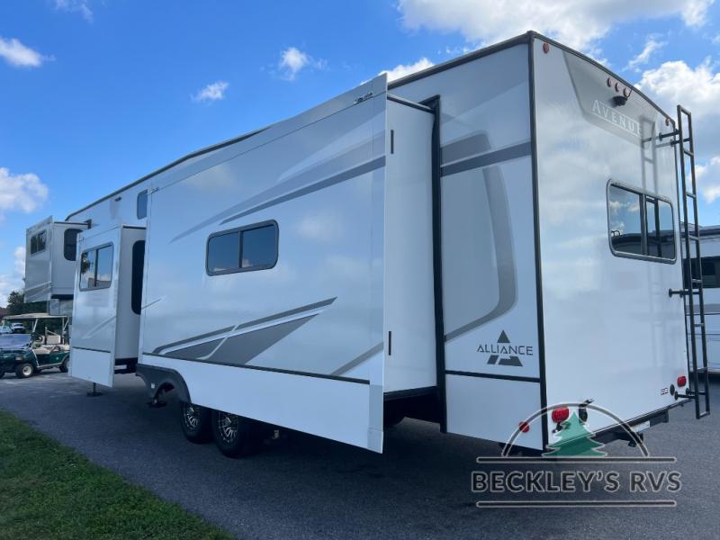 A benchmark chassis creates a space saver upper deck with each one of these Avenue fifth wheels by Alliance RV! The 101 in. wide-body construction gives you more room to walk around and the flush slide out floors throughout prevent any tripping. There are Azdel composite sidewalls inside and out, and a seamless fully walkable PVC roof for extreme durability, zero maintenance, and it is more solar reflective because of the bright white color. Twin 13,500 BTU A/C units provide 27,000 BTUs of cooling power which are ultra quiet and independently controlled keeping you comfortable during your entire trip. And, the fully enclosed and heated underbelly means that you can extend your camping season into the colder months if you like. You are sure to love the "no carpet zone" making each Avenue easy to clean and allergen free, not to mention pet friendly with vinyl flooring throughout. And, strategically placed Atrium windows in the bedroom and living area will not only provide more light, cross ventilation and fresh air, but bring a spectacular view of your surroundings right inside. You can maximize your space throughout with innovative storage solutions like the hidden storage behind the TV, inside the end tables, ottoman, and dinette chairs. Come choose your favorite model today!