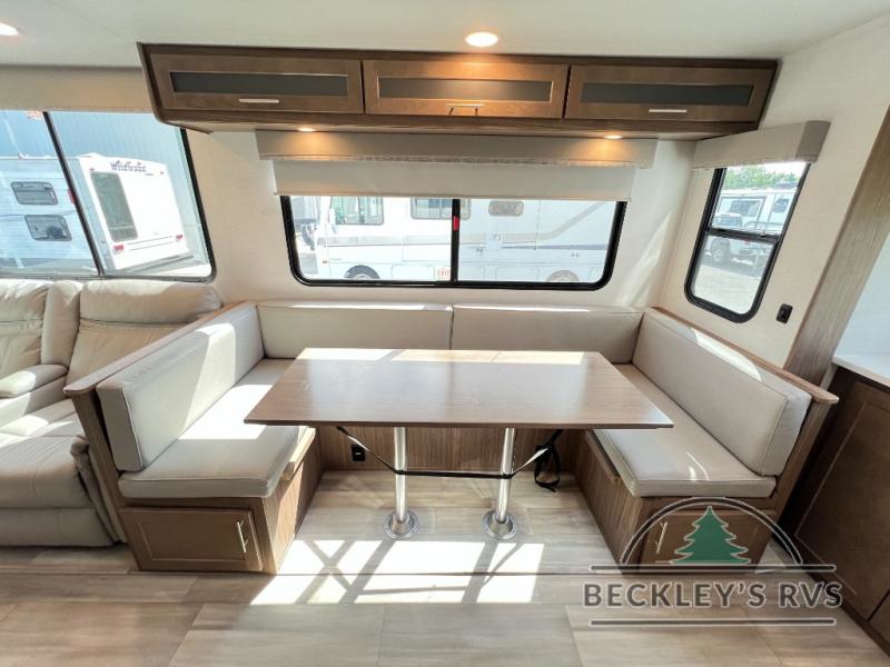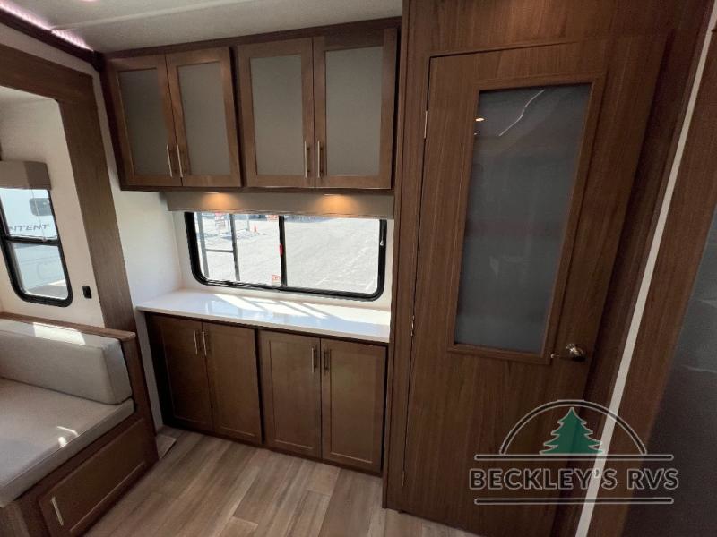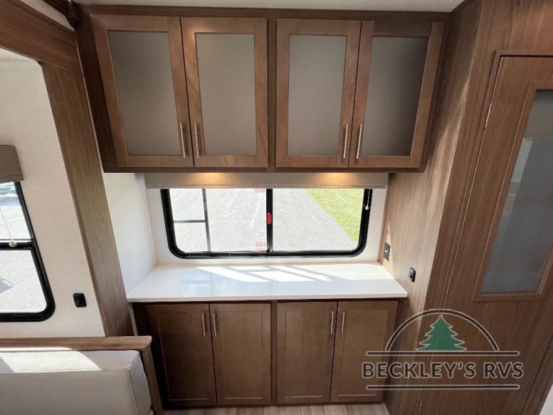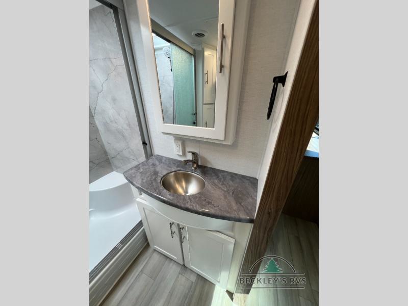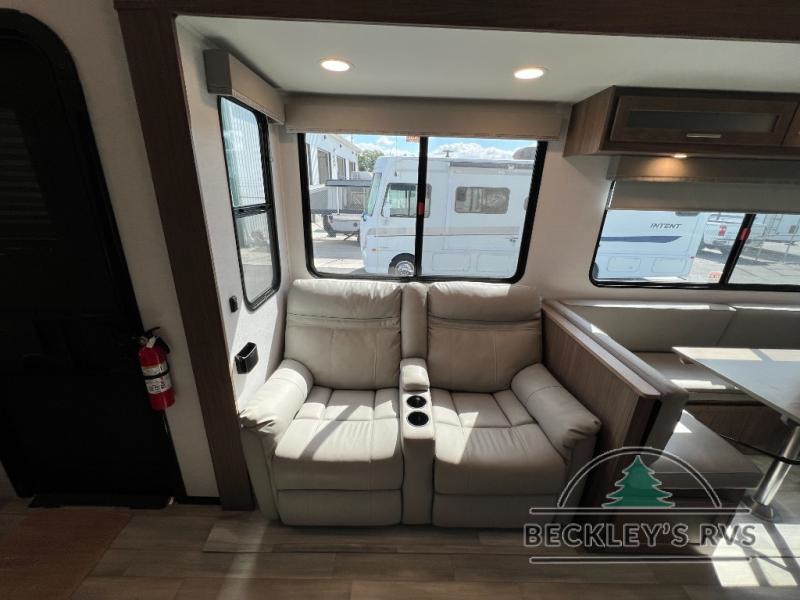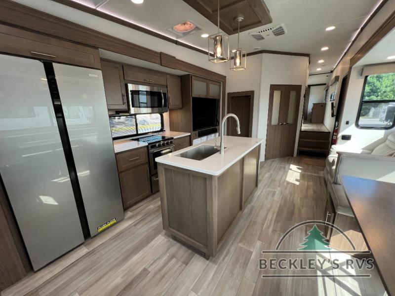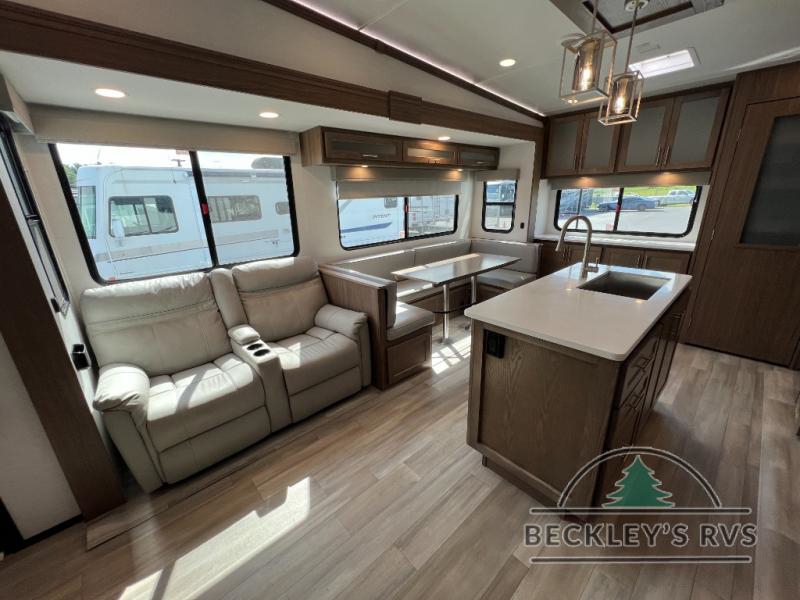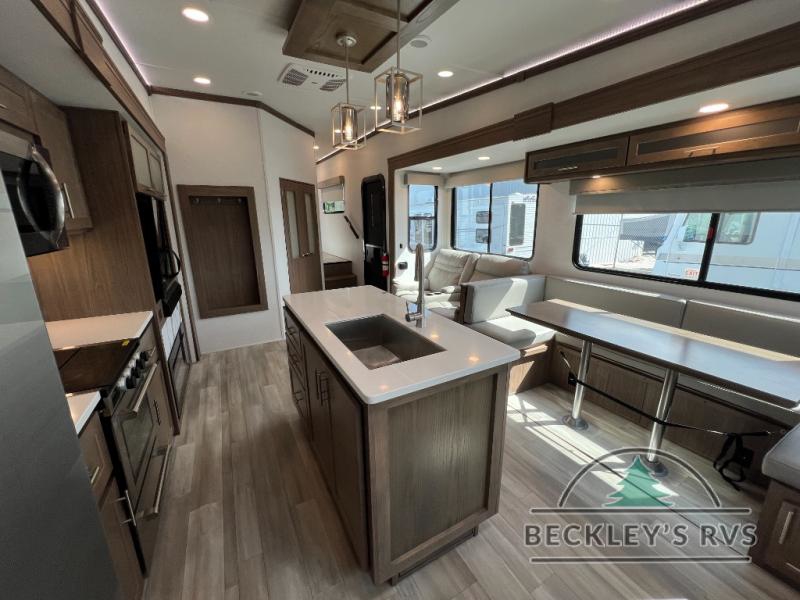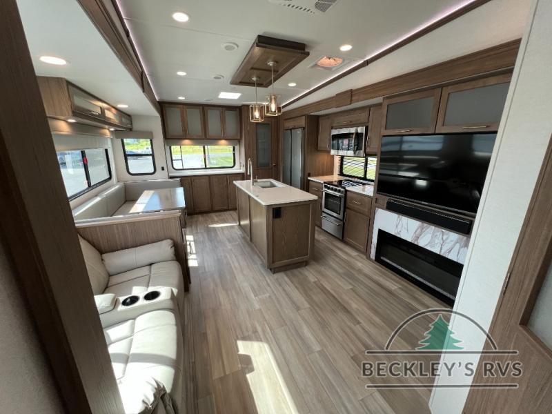 A benchmark chassis creates a space saver upper deck with each one of these Avenue fifth wheels by Alliance RV! The 101 in. wide-body construction gives you more room to walk around and the flush slide out floors throughout prevent any tripping. There are Azdel composite sidewalls inside and out, and a seamless fully walkable PVC roof for extreme durability, zero maintenance, and it is more solar reflective because of the bright white color. Twin 13,500 BTU A/C units provide 27,000 BTUs of cooling power which are ultra quiet and independently controlled keeping you comfortable during your entire trip. And, the fully enclosed and heated underbelly means that you can extend your camping season into the colder months if you like. You are sure to love the "no carpet zone" making each Avenue easy to clean and allergen free, not to mention pet friendly with vinyl flooring throughout. And, strategically placed Atrium windows in the bedroom and living area will not only provide more light, cross ventilation and fresh air, but bring a spectacular view of your surroundings right inside. You can maximize your space throughout with innovative storage solutions like the hidden storage behind the TV, inside the end tables, ottoman, and dinette chairs. Come choose your favorite model today!