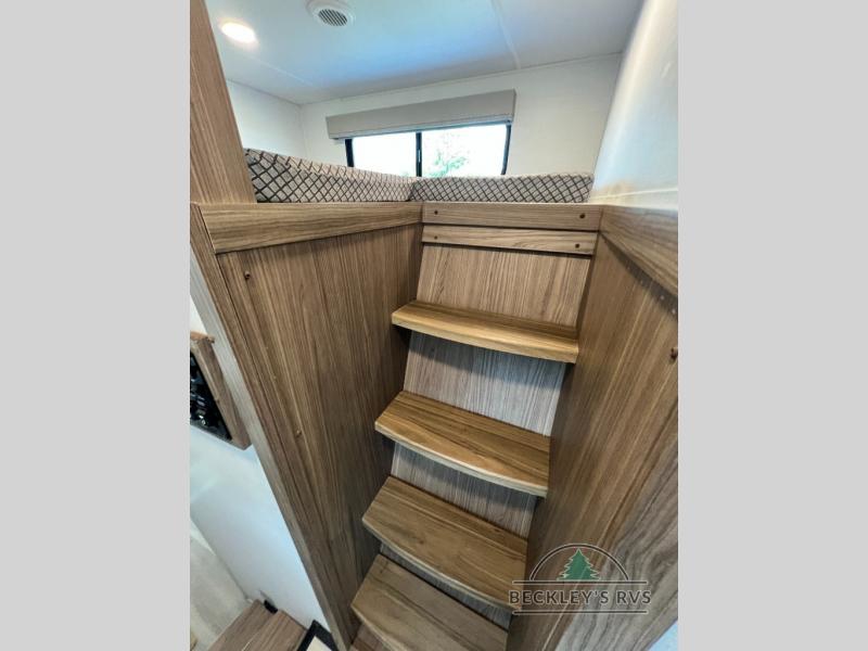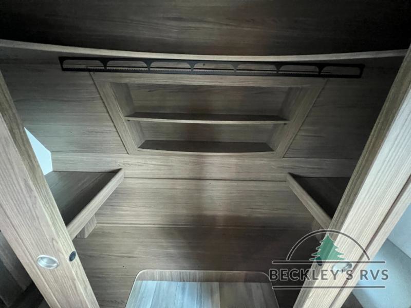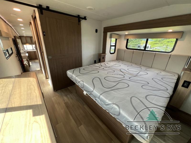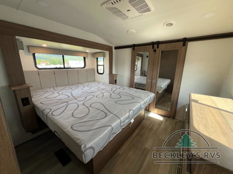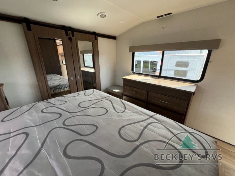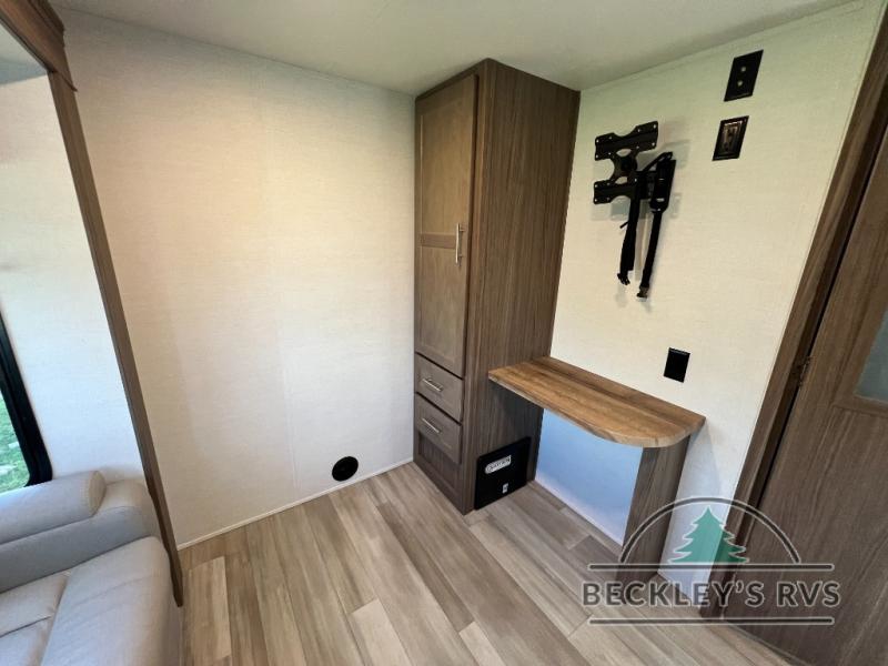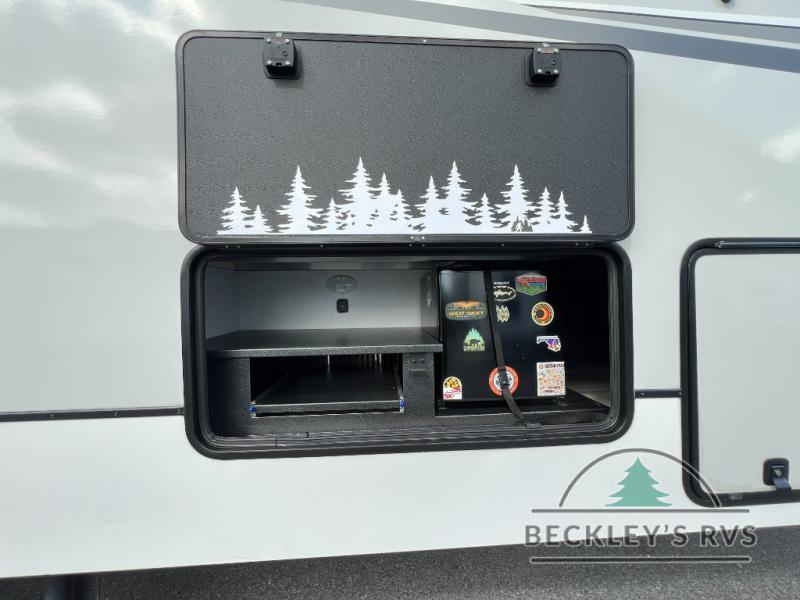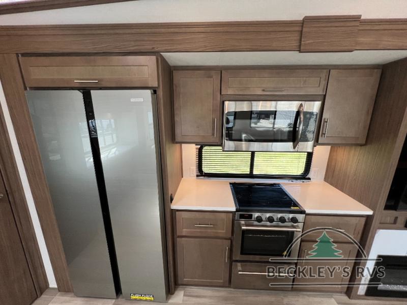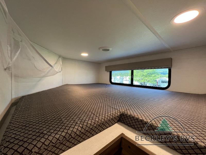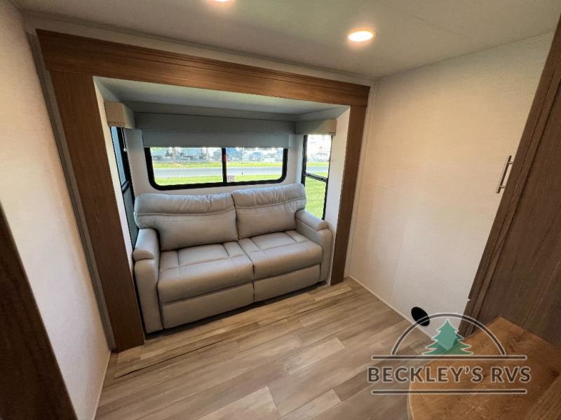 This fifth wheel is packed full with comfortable features! The front private bedroom has a queen bed slide that can be switched out for an optional king bed, a dresser, and a front wardrobe that is prepped to add an optional washer and dryer. Freshen up each morning in the full bathroom with a 30" x 50" shower then head to the full kitchen to prepare breakfast using the kitchen island and three burner cooktop. The second bedroom has a sofa slide with a loft above it all accessible from a staircase at the top of the steps up to the front master bedroom and bath, right before the bathroom door on your left. Relax each night on the dual recliner theater seating across from the swing mount 50" HDTV with hidden storage behind it, or play a few games at the U-shaped dinette. This model also has the option to switch out the U-shaped dinette for an optional floating dinette table beside the theater seat. You also have an outside refrigerator and outside griddle by a flip-up baggage door for storage!
