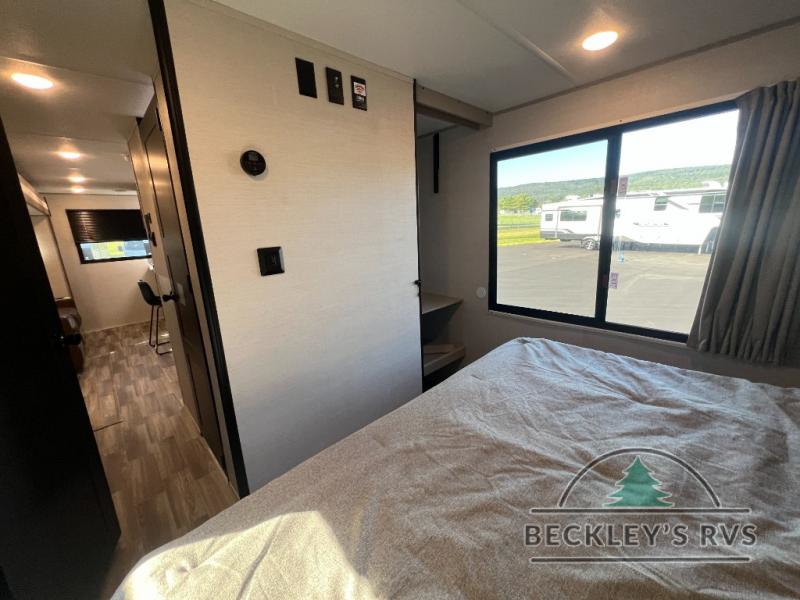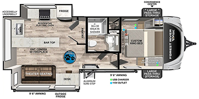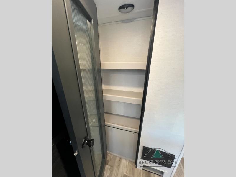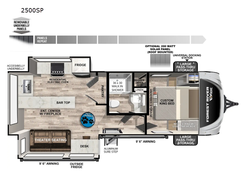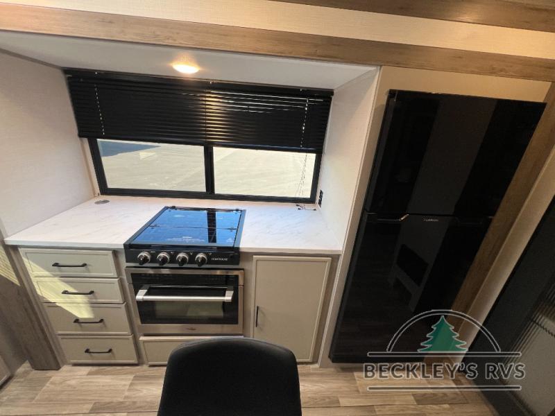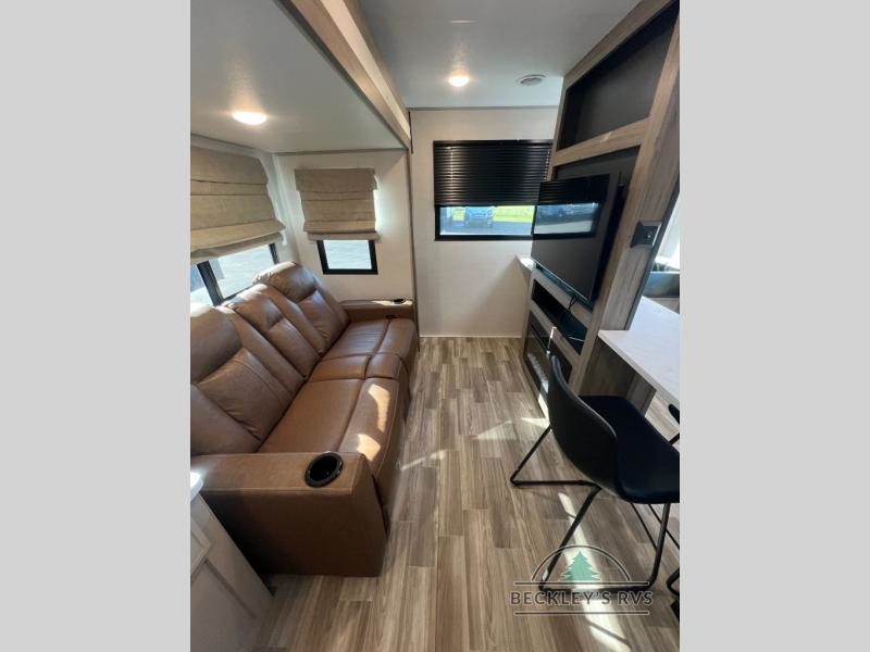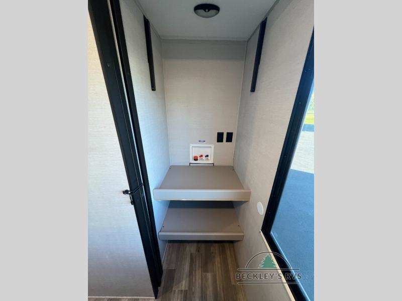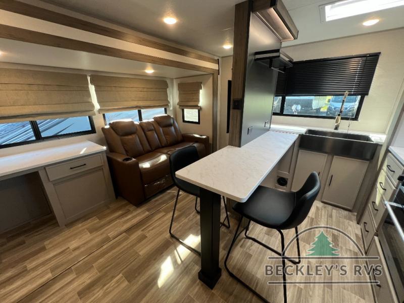 This Vibe travel trailer is perfect for your next getaway! Relax on the theater seating opposite the entertainment center with fireplace. A bar top counter provides plenty of space in the kitchen, where you will also love the fridge, electric oven, and spacious pantry. A desk area even allows you to work if you have to! At night retire to the front bedroom with its custom king bed. The full bath features a spacious 36" x 30" shower, linen closet, and even prep for an optional washer/dryer. Outside you will find dual awnings and an outside fridge so you can grab drinks on the go.