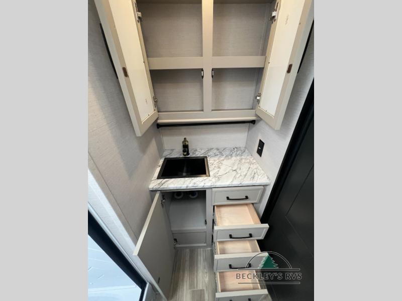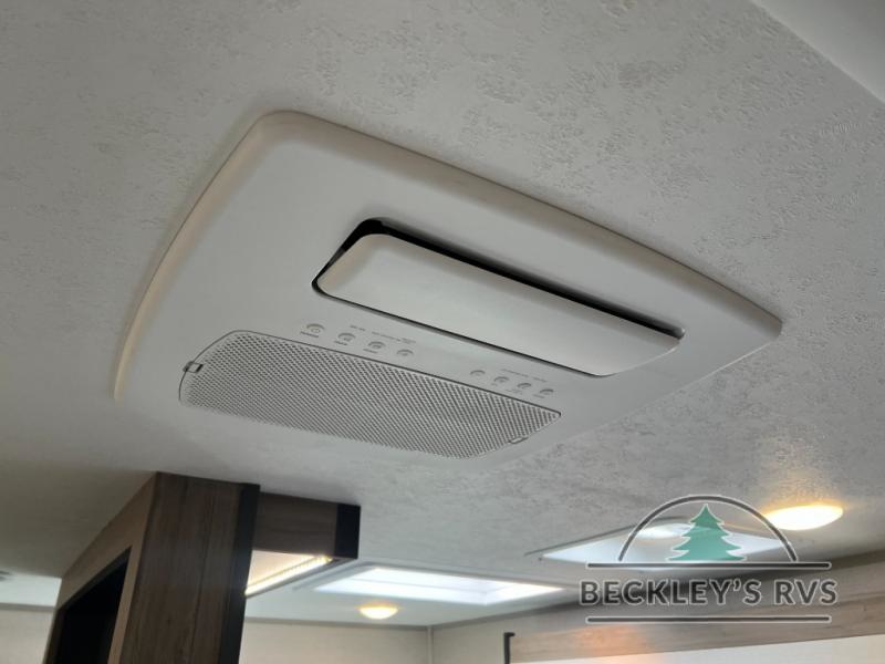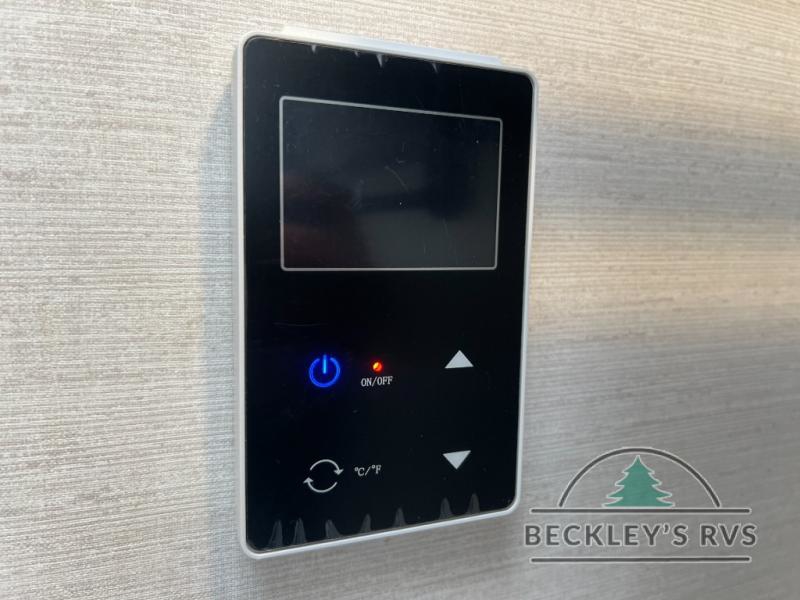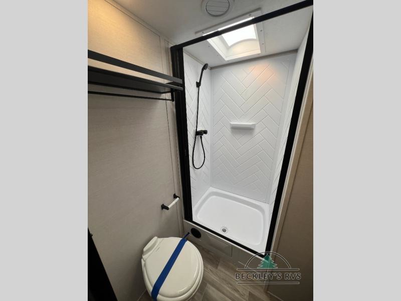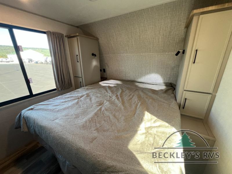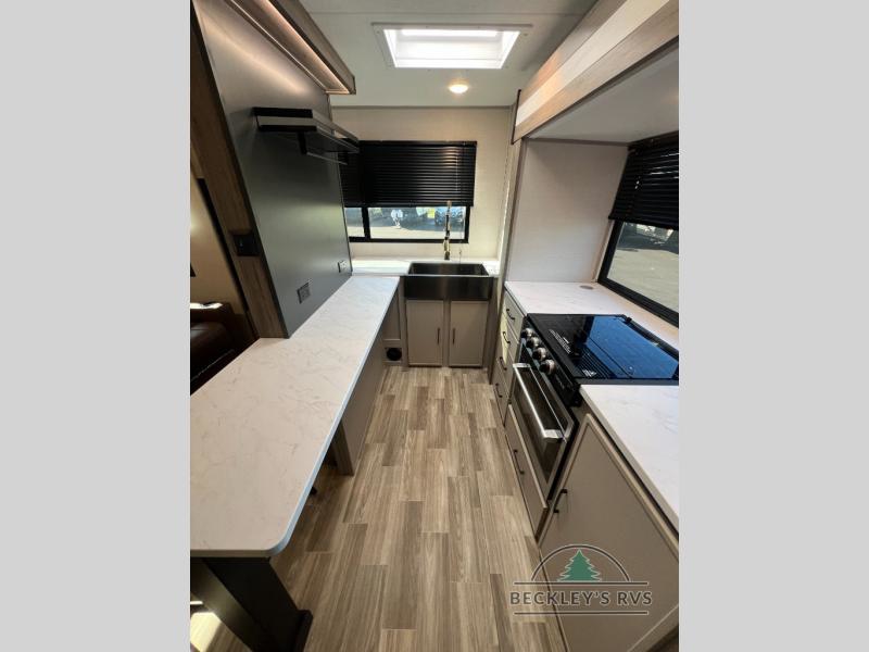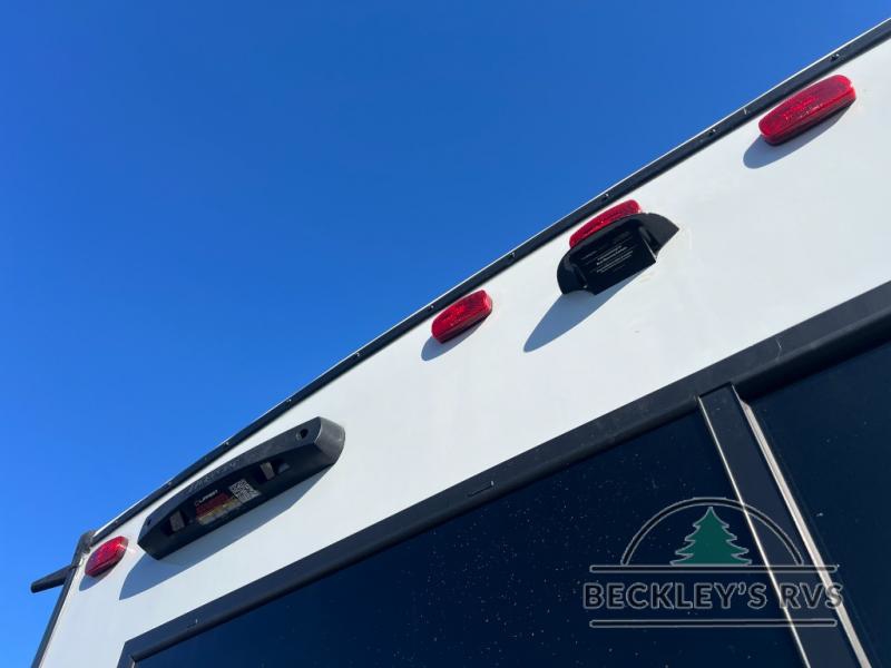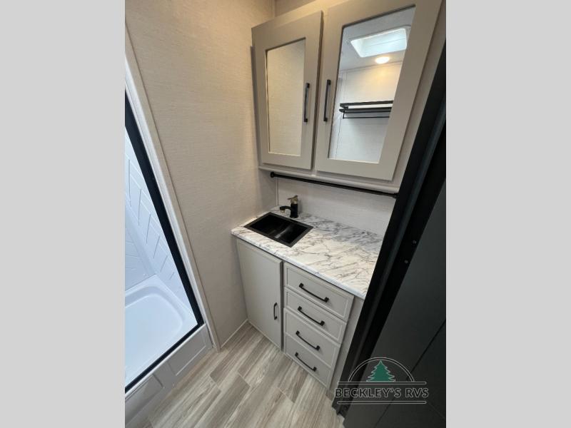 This Vibe travel trailer is perfect for your next getaway! Relax on the theater seating opposite the entertainment center with fireplace. A bar top counter provides plenty of space in the kitchen, where you will also love the fridge, electric oven, and spacious pantry. A desk area even allows you to work if you have to! At night retire to the front bedroom with its custom king bed. The full bath features a spacious 36" x 30" shower, linen closet, and even prep for an optional washer/dryer. Outside you will find dual awnings and an outside fridge so you can grab drinks on the go.