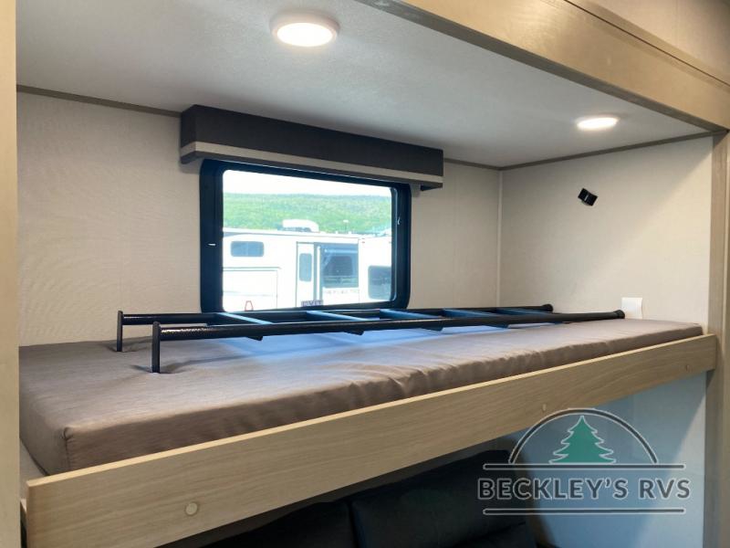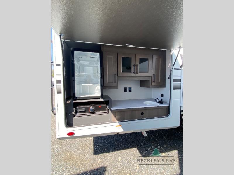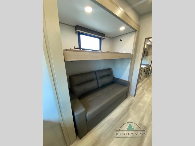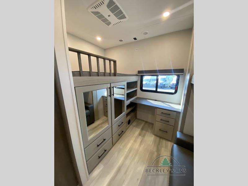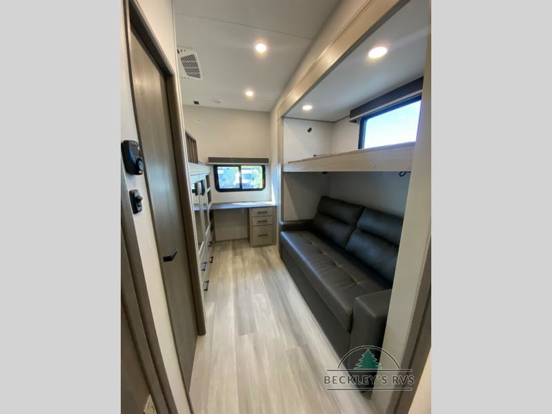 Grab the whole gang and head out in this fifth wheel featuring a private bunkhouse that sleeps five. This unit also features dual entry doors for added convenience with one set leading into a half bath, and quad slides for even more space in this widebody layout. The combined kitchen and living area featuring dual opposing slides offer space to dine and relax including theater seating for two opposite the entertainment center and fireplace. The chef in your group will appreciate the amenities for dreaming up dishes to feed everyone, and the outside griddle, sink and beverage cooler provides even more options. In front, a private bedroom and full bath with a queen bed or optional king, your choice. You can even add a washer and dryer with a space in front prepped for both if you like.