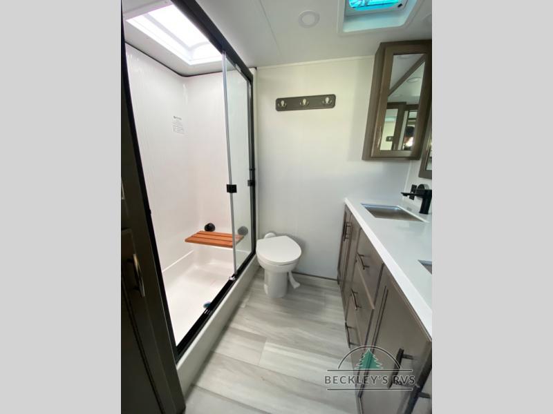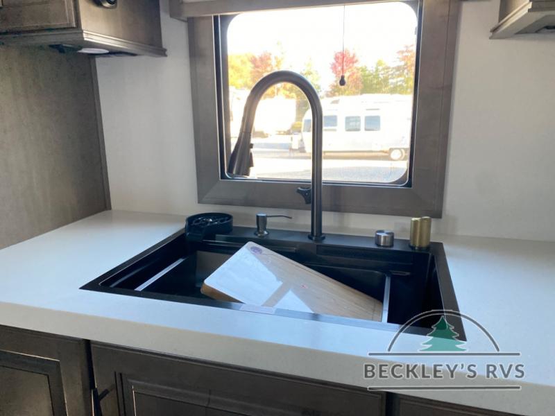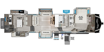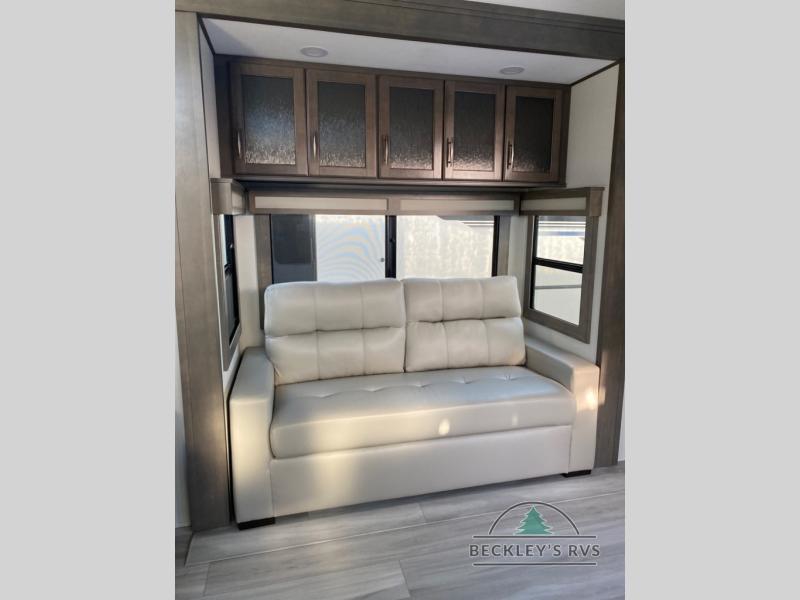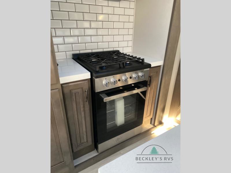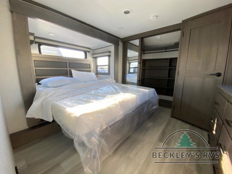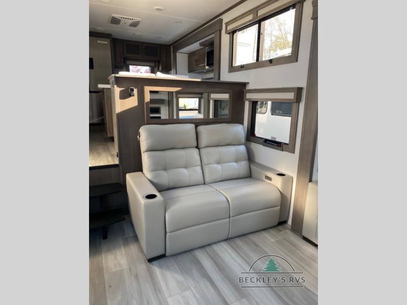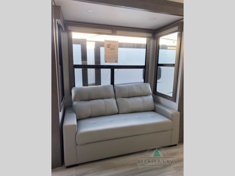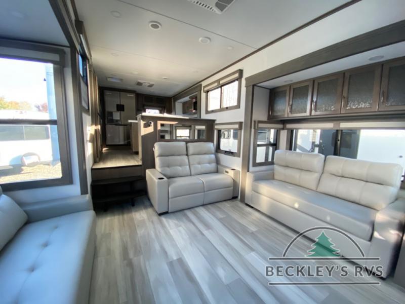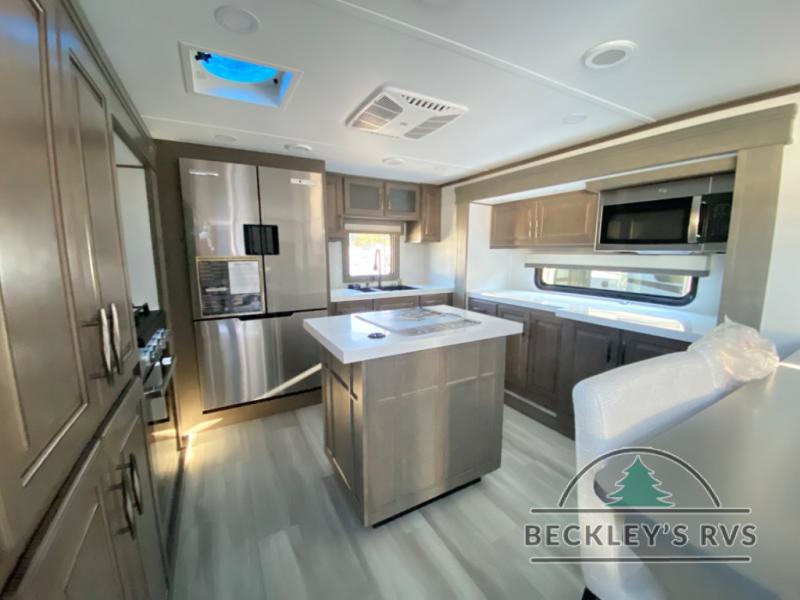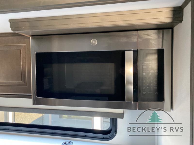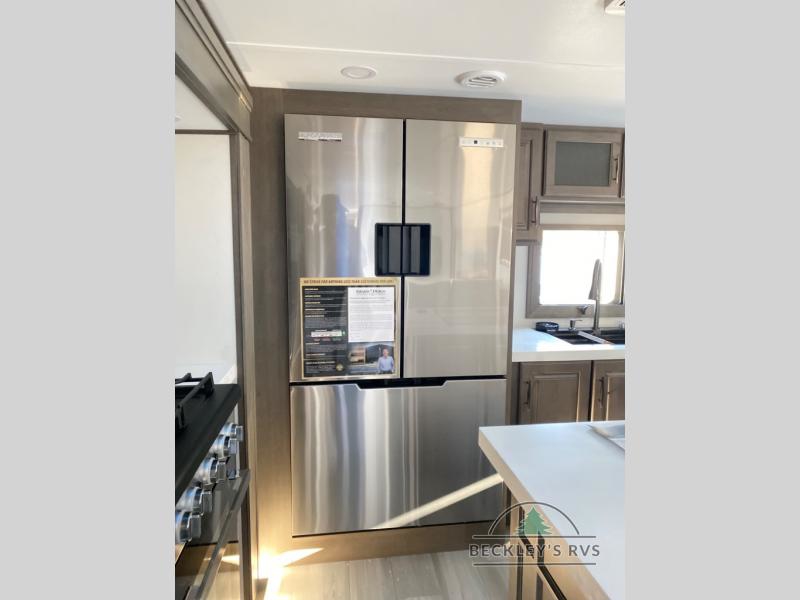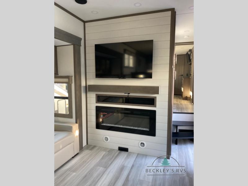 Enjoy each and every vacation, month-long trips, or even extended stays at an RV park in this spacious fifth wheel! The raised rear kitchen gives the cook plenty of room to whip up any type of meal using the stainless steel appliances including a built-in oven, an oversized pantry, and the raised bar top will provide you even more counter space on top of dining with two chairs that overlook the middle living area. Relaxing is made easy thanks to two tri-fold sofas and theatre seating while watching the big game on the LED Smart TV and enjoying the fireplace below. At night, retire to your own queen bed which slides out to provide more floor space, and you can store your clothes in the slide top dresser and front closet with washer and dryer prep.
