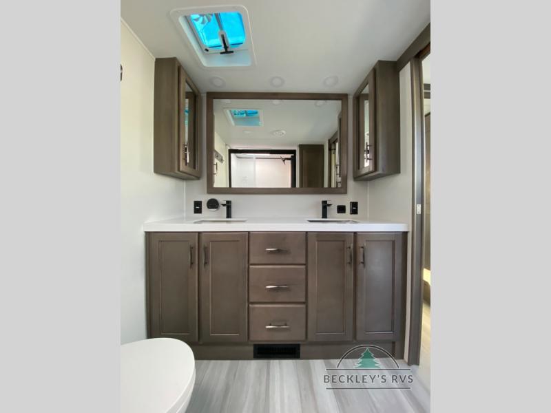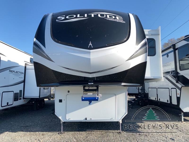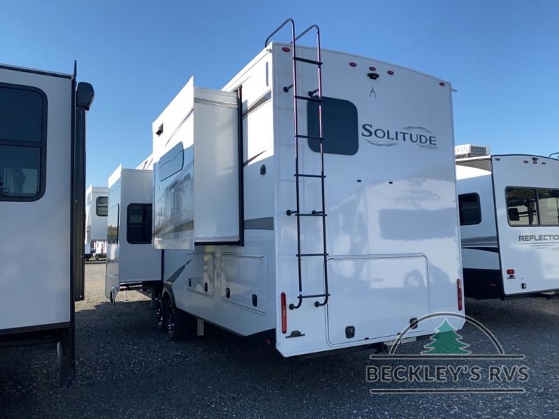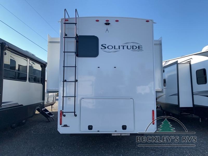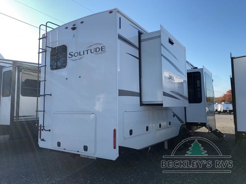 Each Solitude fifth wheel by Grand Design features a 101" wide-body construction, heavy duty 8,000 lb. axles, frameless tinted windows, and high-gloss gel coat sidewalls. You can camp year around thanks to the Weather-Tek Package that includes a 35K BTU high-capacity furnace, an all-in-one enclosed and heated utility center, and a fully enclosed underbelly with heated tanks and storage. Inside, you'll love the premium roller shades, hardwood cabinet doors, solid surface countertops, plus residential finishes throughout to make you truly feel at home. Each model also includes a MORryde CRE3000 suspension system, self adjusting brakes, and a MORryde pin box that will provide smooth towing from home to campground. Affordable luxury is possible with the Solitude fifth wheels; choose yours today!