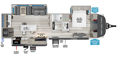 With any Reflection travel trailer by Grand Design, you will have a solar panel for off-grid camping and a 50 amp charge controller and inverter prep, a Universal All-In-One docking station, unobstructed pass-through storage, and nitrogen filled radial tires. Some other top features include the 30" stainless steel microwave, the maximum 7-foot headroom, and the ductless heating system with no vents in the floor to collect debris. Each is constructed of gel coat exterior sidewalls, residential 5" truss rafters, walk-on roof decking, a fiberglass and radiant foil roof and front cap insulation plus laminated aluminum framed side walls, roof and end walls in slide rooms. Choose luxury, value, and towability over all the others, take home a Reflection of your good taste!