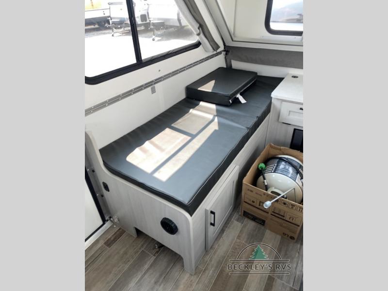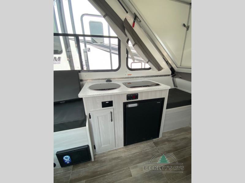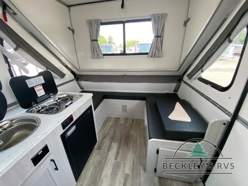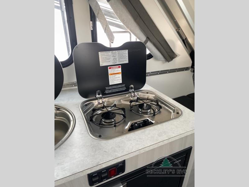 If you enjoy camping with friends or you need your own space at night, this Twin Bed model will do the trick! While two campers take the rear twin beds, the front booth dinette can convert to a 30" x 76" bed for an extra guest, and in the morning you can convert it back to dining space. Whip up breakfast on the two burner stove, or use the convenient microwave oven. There is also a sink to clean up your dishes plus a 3.1 cu. ft. 12V refrigerator to put milk and eggs back in. Don't let this cute A-Frame slip away!