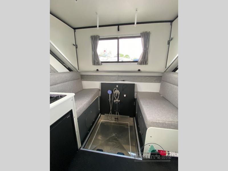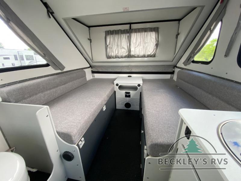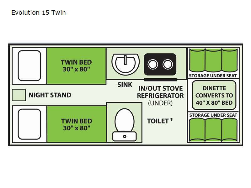 Two to four, depending on size can easily camp in this twin bed model featuring two 30" x 80" twin beds in the rear of the unit. There is a two burner cooktop to make lunch on and a 3.0 cu. ft. 3-way refrigerator with a freezer for your cold items, and you can add the optional outside grill if you like to cook outdoors! The dinette converts to a 40" x 80" bed for one or two more tired campers. You'll find storage space under the dinette for your things and the cassette toilet is quite handy especially at night. This model also has a dry weight of 2,400 lbs. for easy towing!