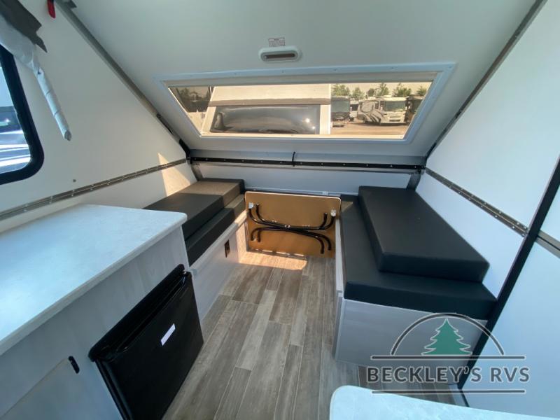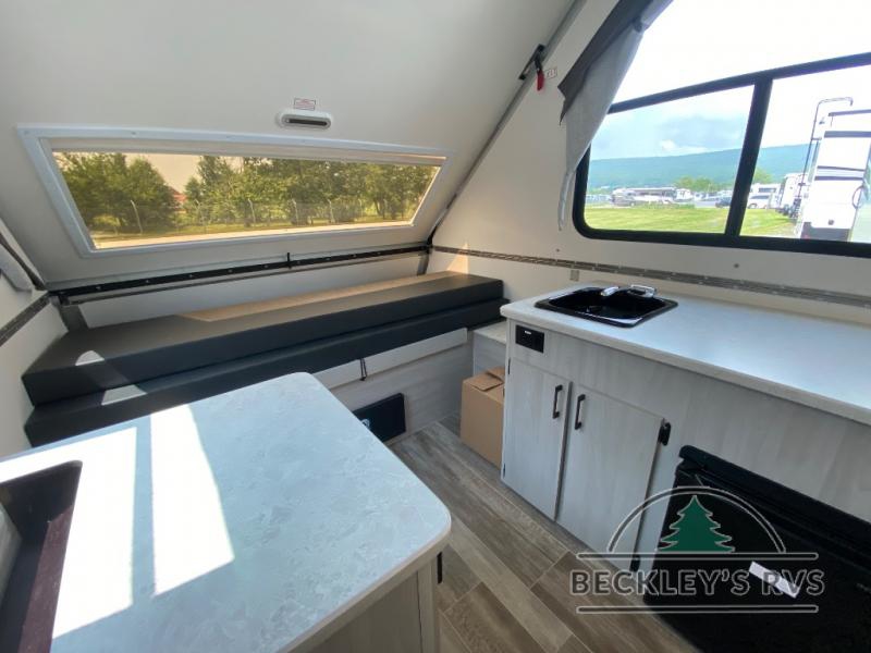 Get ready to sleep above ground as you upgrade from tent camping to this A-frame camper! It is easy to tow, set up and store when the fun is over. Inside you will find ample storage for your gear, a dinette to dine at when you aren't outside, a sofa bed to relax on before bedtime, and both furnishings covert to sleeping space. The dinette converts to a 46" x 76" bed, and there is storage under the seats. You will also have shelves to set your phone and such on. There are more features such as three electrical outlets inside, one outlet outside, high density foam, hypoallergenic cushions and mattress, a fantastic vent-fan, and options to choose from such as a front soft dormer, a rear soft dormer, and/or an Extreme Off-Road package, plus more!