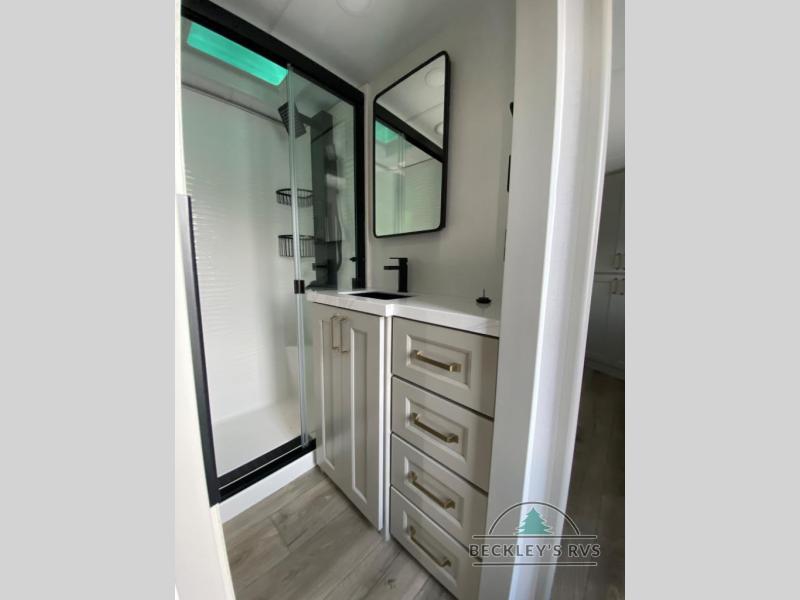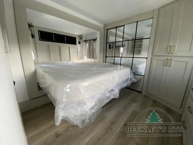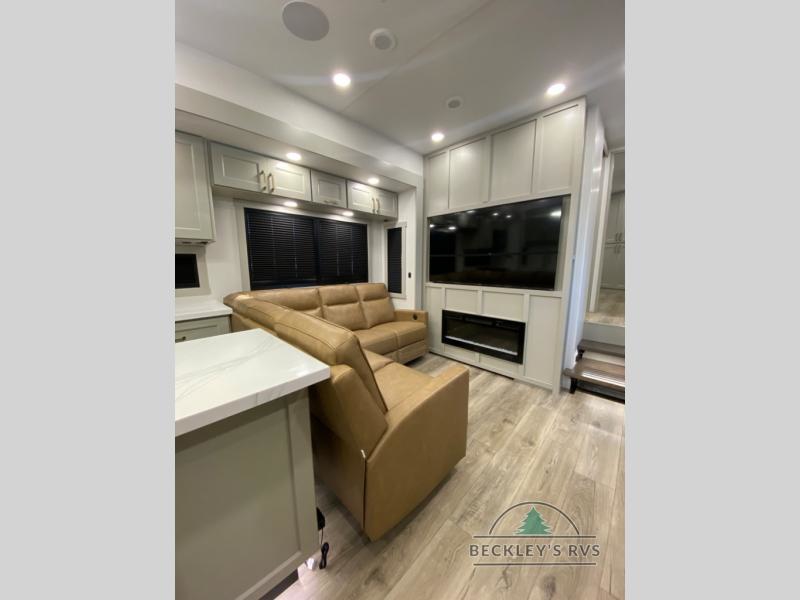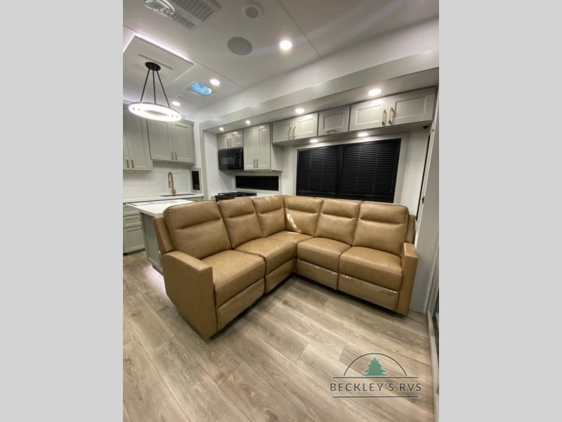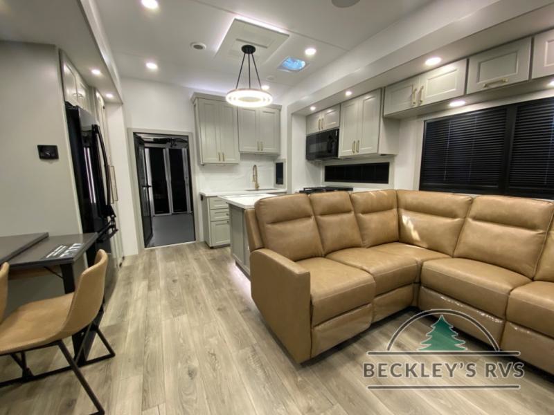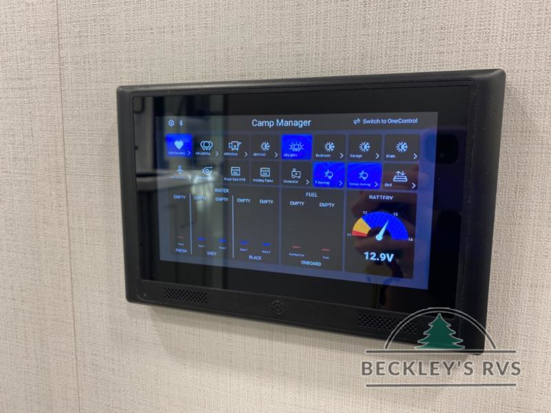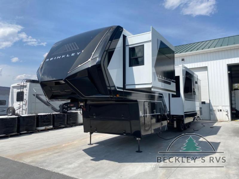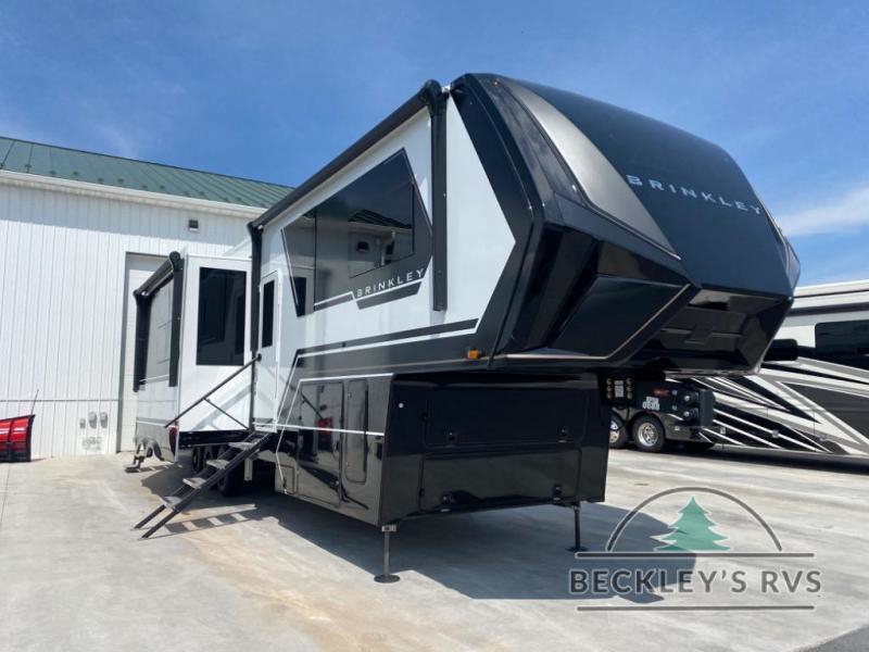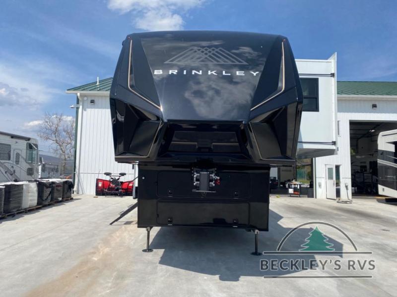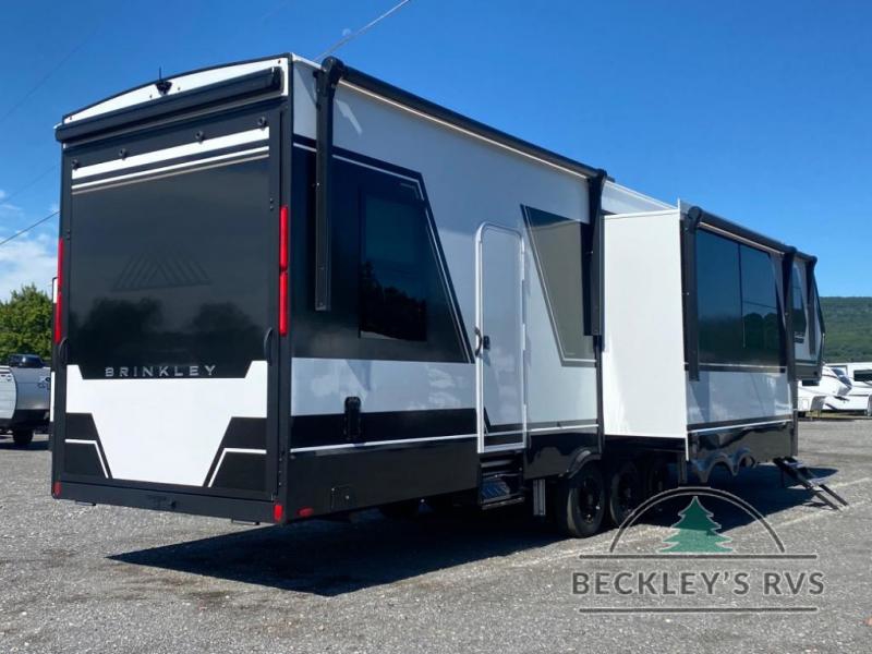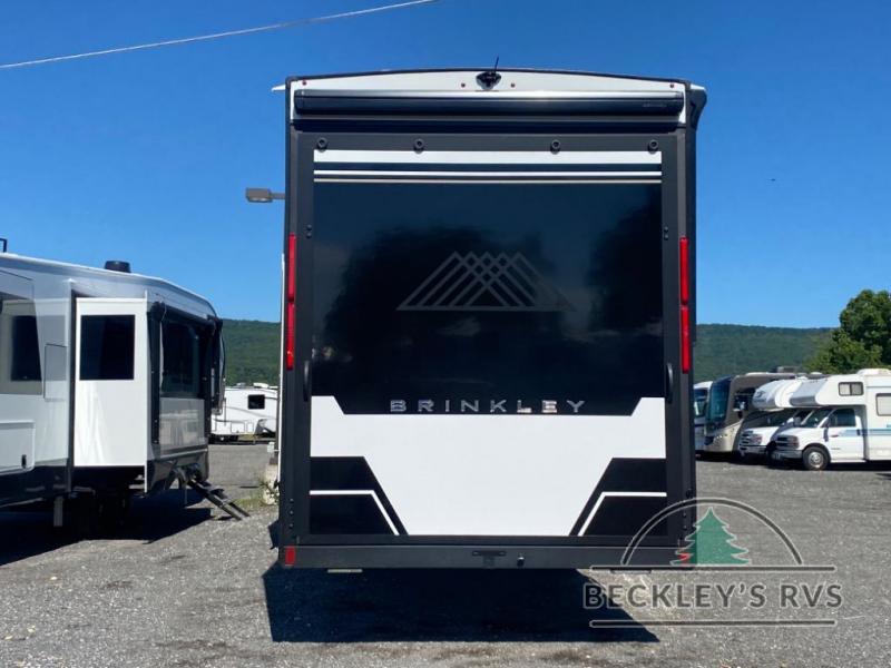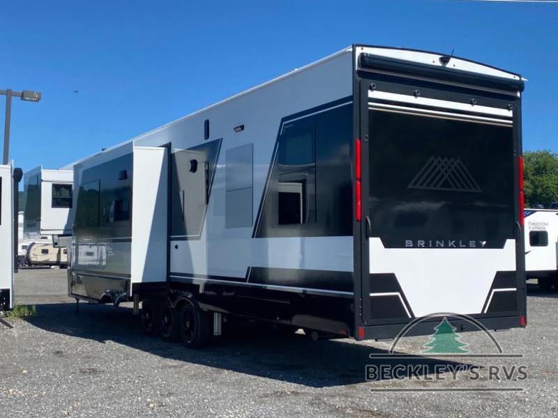 With any Model G toy hauler fifth wheel by Brinkley you will enjoy luxurious amenities, tons of storage space, and innovative features that have been developed and tested in the real world. Durable construction includes an industry leading PDI process, an industry best insulation package, and reinforced and walkable slide roofs. Some of the exterior features you'll find are a 3-way pass-through with a multi-functional flip-up bulkhead wall, under I-beam storage, a MAX-Vision reverse lighting system, and a low-maintenance roof to name a few. A Rockford Fosgate audio system comes standard, along with a OneControl app system that lets you control your fifth wheel's functions right from your mobile device. You will find the solar system with a designated storage area to be ultra convenient, plus there is a FlexPower 5500 with a dual fuel inverter generator for all your power needs. Head inside to find a residential interior with Brinkley's CraftSense wood trim construction, floating entrance steps, integrated window screens and insulated blackout blinds, and residential solid surface countertops plus backsplash. You will also enjoy the neon shower lighting and recessed medicine cabinets in the bath, plus motion activated LED bed lights and dual bedside outlets in the bedroom. Choose a Model G toy hauler fifth wheel to experience all the luxury it has to offer!