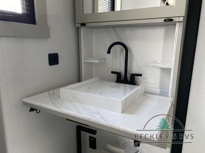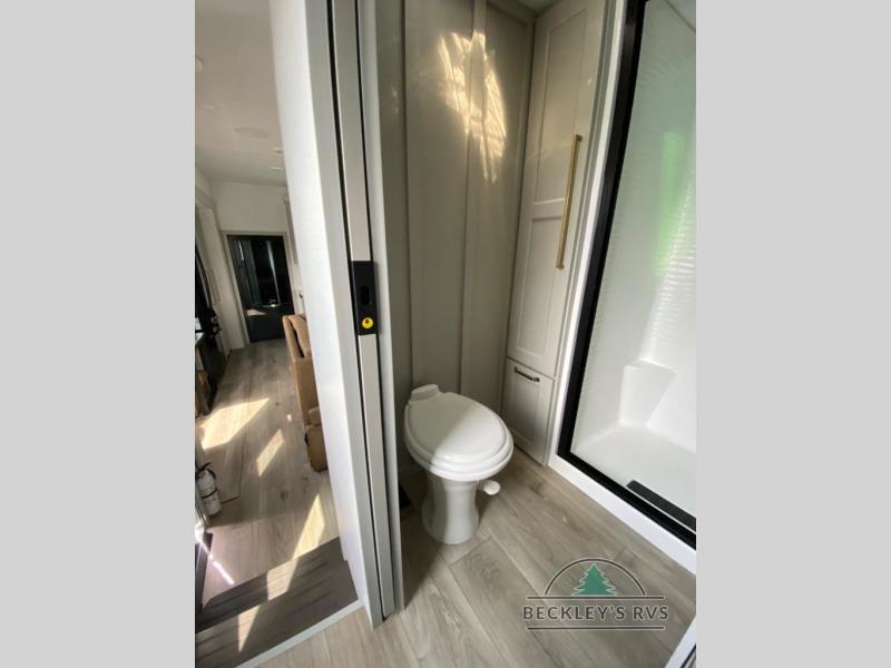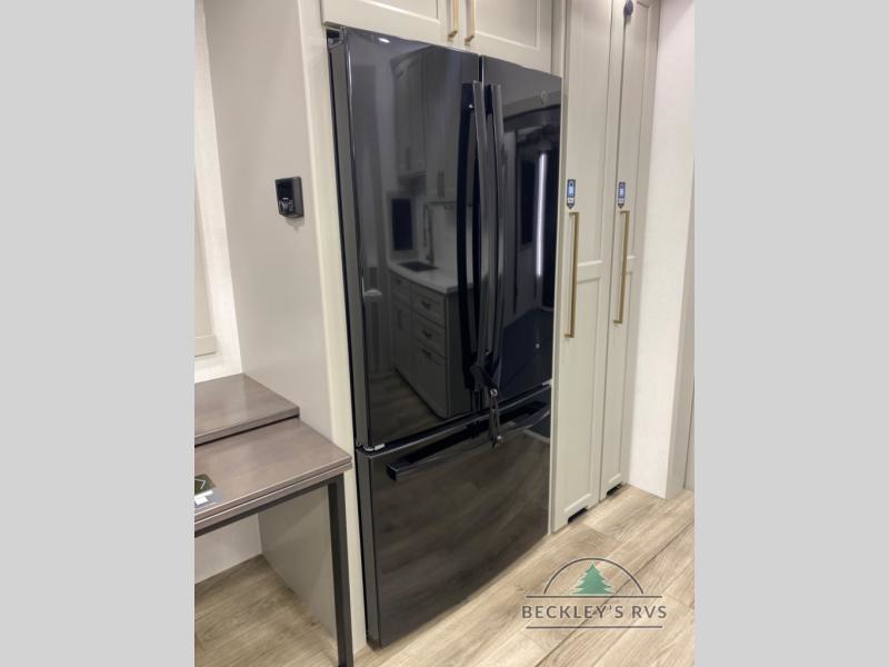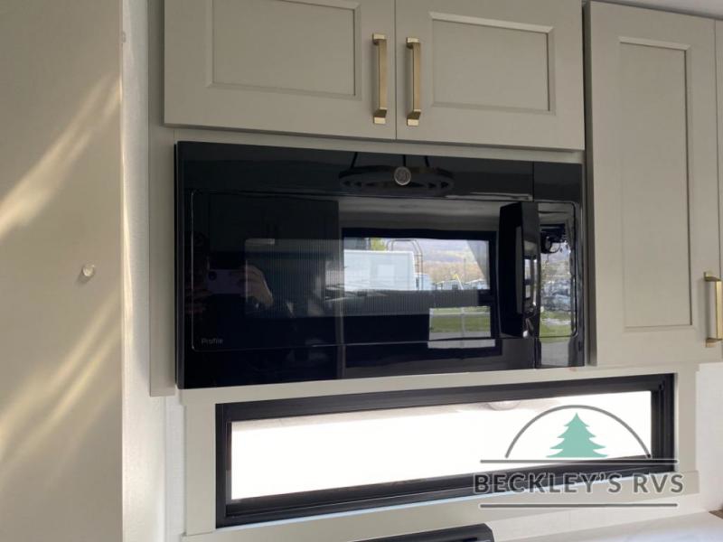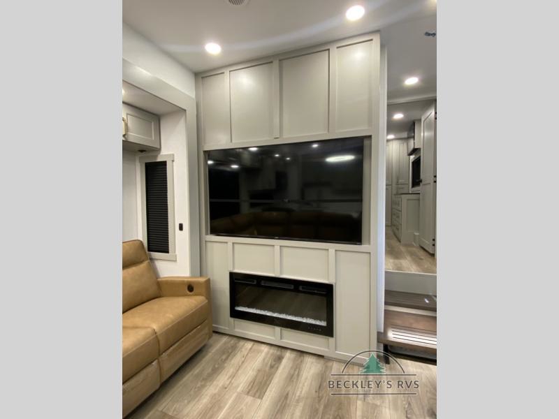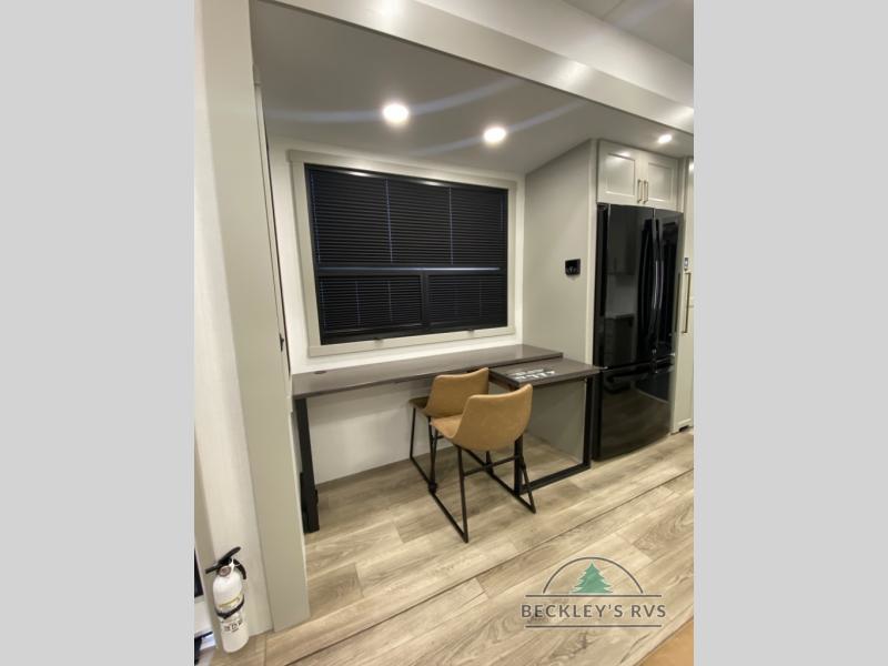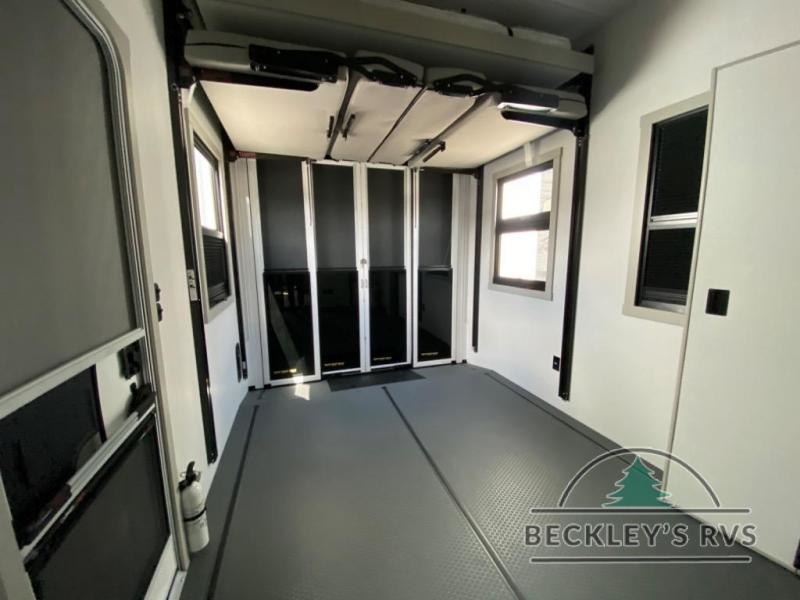 This toy hauler may just be the one you've been looking for! The garage/flex space with fold-away half bath walls will allow you to utilize the garage how you need it, plus there is an adjustable tie-down system, independent dual sofas, plus a loft for storage and a twin bed to sleep more campers! The garage patio with a 1,500 lb. capacity is another feature you are sure to love, especially with its own awning to keep you protected from the elements. Head to the kitchen to prepare meals with a 24" GE oven with a four burner range, a GE microwave with an air fryer, plus a spacious GE Energy Star 19 cu. ft. refrigerator. The island with two stools will let others visit with you while you cook, and there are even hidden dog bowls. You'll find the convertible dining table/L-desk will be accommodating since it can be use to dine at, and to get some work done. You may just find yourselves spending most of your time on the U-sofa in front of the TV and fireplace. A full bath is up front by the bedroom, and here you'll find neon shower lighting, a residential shower system, and pull-out linen storage to keep towels ready to use. After a day outdoors you'll love nothing more than coming back to your own bedroom with a king bed slide out, TV, a walk-in closet, and many more storage spaces. And we haven't even touched on the exterior features, like the 3-way pass-through storage, three power awnings, an air compressor to fill up tires, and the list goes on and on! This is a pre-production preview, all features and layout placement subject to change.