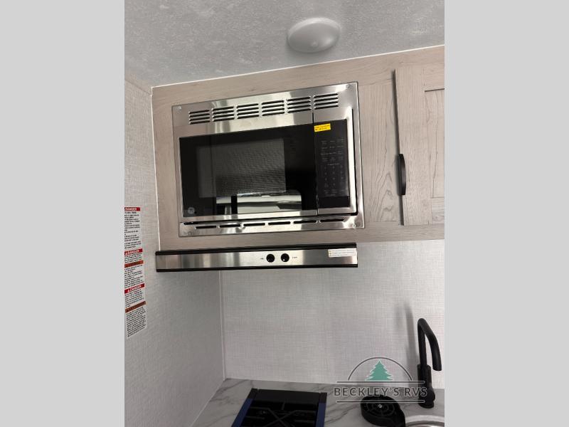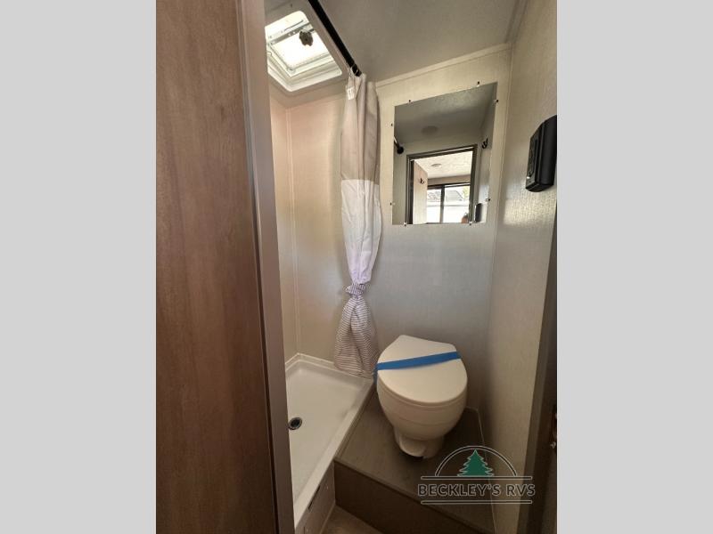 Inside, you'll find a well-equipped kitchen with a GE appliance package, seamless countertops, and thoughtful touches like a sink cup rinser and overhead storage. The bathroom features a 24" x 40" shower, power vent fan, and a foot-flush toilet, offering home-like comfort on the go.